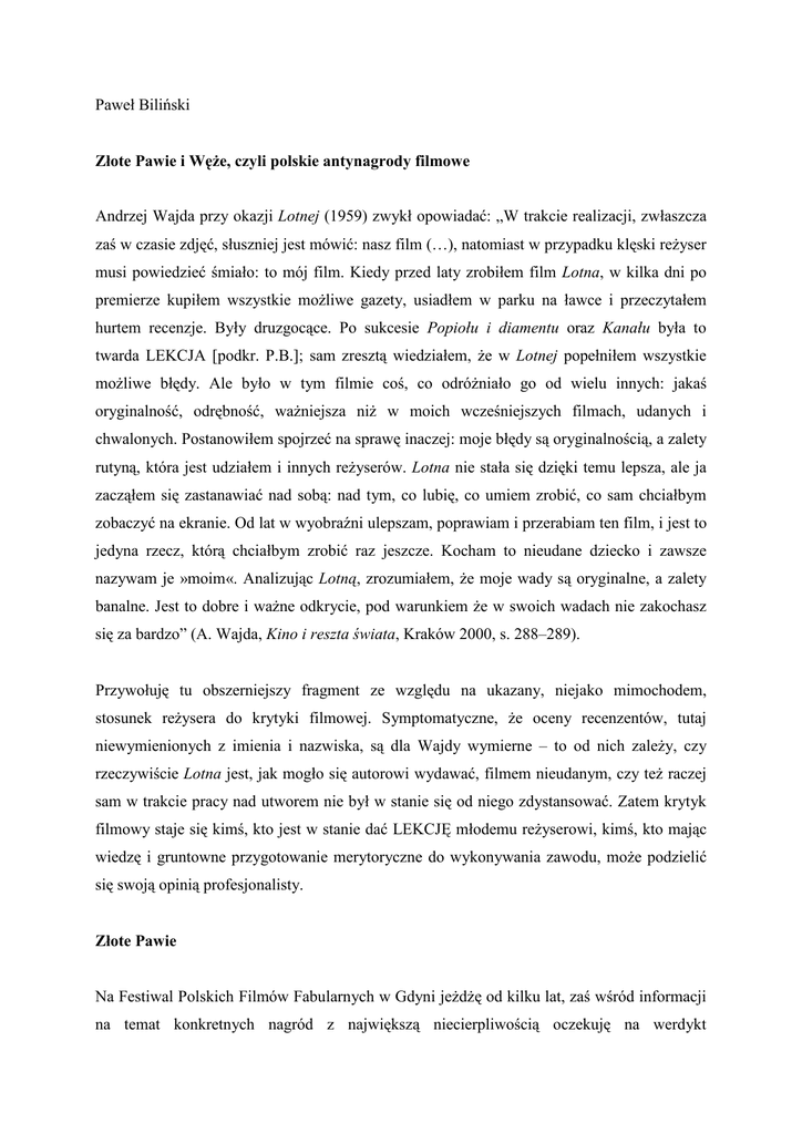 Paweł Biliński Złote Pawie i Węże, czyli polskie antynagrody filmowe Andrzej Wajda przy okazji Lotnej (1959) zwykł opowiadać: „W trakcie realizacji, zwłaszcza zaś w czasie zdjęć, słuszniej jest mówić: nasz film (…), natomiast w przypadku klęski reżyser musi powiedzieć śmiało: to mój film. Kiedy przed laty zrobiłem film Lotna, w kilka dni po premierze kupiłem wszystkie możliwe gazety, usiadłem w parku na ławce i przeczytałem hurtem recenzje. Były druzgocące. Po sukcesie Popiołu i diamentu oraz Kanału była to twarda LEKCJA [podkr. P.B.]; sam zresztą wiedziałem, że w Lotnej popełniłem wszystkie możliwe błędy. Ale było w tym filmie coś, co odróżniało go od wielu innych: jakaś oryginalność, odrębność, ważniejsza niż w moich wcześniejszych filmach, udanych i chwalonych. Postanowiłem spojrzeć na sprawę inaczej: moje błędy są oryginalnością, a zalety rutyną, która jest udziałem i innych reżyserów. Lotna nie stała się dzięki temu lepsza, ale ja zacząłem się zastanawiać nad sobą: nad tym, co lubię, co umiem zrobić, co sam chciałbym zobaczyć na ekranie. Od lat w wyobraźni ulepszam, poprawiam i przerabiam ten film, i jest to jedyna rzecz, którą chciałbym zrobić raz jeszcze. Kocham to nieudane dziecko i zawsze nazywam je »moim«. Analizując Lotną, zrozumiałem, że moje wady są oryginalne, a zalety banalne. Jest to dobre i ważne odkrycie, pod warunkiem że w swoich wadach nie zakochasz się za bardzo” (A. Wajda, Kino i reszta świata, Kraków 2000, s. 288–289). Przywołuję tu obszerniejszy fragment ze względu na ukazany, niejako mimochodem, stosunek reżysera do krytyki filmowej. Symptomatyczne, że oceny recenzentów, tutaj niewymienionych z imienia i nazwiska, są dla Wajdy wymierne – to od nich zależy, czy rzeczywiście Lotna jest, jak mogło się autorowi wydawać, filmem nieudanym, czy też raczej sam w trakcie pracy nad utworem nie był w stanie się od niego zdystansować. Zatem krytyk filmowy staje się kimś, kto jest w stanie dać LEKCJĘ młodemu reżyserowi, kimś, kto mając wiedzę i gruntowne przygotowanie merytoryczne do wykonywania zawodu, może podzielić się swoją opinią profesjonalisty. Złote Pawie Na Festiwal Polskich Filmów Fabularnych w Gdyni jeżdżę od kilku lat, zaś wśród informacji na temat konkretnych nagród z największą niecierpliwością oczekuję na werdykt dziennikarzy (oprócz, rzecz jasna, Złotych Lwów). Patrząc na ostatnie lata, można stwierdzić, że nagroda ta niemal zawsze trafia w najwłaściwsze, moim zdaniem, ręce. To, że dziennikarze mieli – i wciąż mają – otwartą furtkę, by przyznawać swoje wyróżnienie, zresztą już od drugiej edycji, tj. 1975 roku, stanowi niemal oczywiste uzupełnienie nagród wręczanych na podstawie decyzji powoływanego corocznie jury. Nikt jednak nie przewidział rozwoju wypadków i tego, co nastąpiło w roku 1996. Wówczas nie tylko po raz czwarty nie przyznano głównej nagrody – co zresztą w trakcie ceremonii skwapliwie skomentował Juliusz Machulski, twierdząc, że „jeśli filmowcy sami siebie nie nagrodzą, to nikt ich nie nagrodzi” – ale też 21. edycja zapisała się w historii jako ta, gdy dziennikarze postanowili przyznać, obok swojej corocznej nagrody dla najlepszego filmu (wygrał Cwał Krzysztofa Zanussiego), również wyróżnienie specjalne – Złotego Pawia dla filmu najgorszego (uhonorowano Deszczowego żołnierza Wiesława Saniewskiego). Choćby pobieżny przegląd prasy, jak i relacje z drugiej ręki świadczą dobitnie o znaczeniu tego wydarzenia. Niezwykle słabą formę polskiego kina krytycy postanowili w pewnym stopniu podsumować. Rzeczywiście, filmy startujące w głównym konkursie nie były najwyższych lotów. Wystarczy spojrzeć na średnią ocen Twierdzy szczurów Andrzeja Jasiewicza, Dziejów mistrza Twardowskiego w reżyserii Krzysztofa Gradowskiego czy oceny przyznane filmowi Wirus Jana Kidawy-Błońskiego (zaledwie jedna „trója” przy dziewięciu niedostatecznych) przez krytyków w rankingu miesięcznika „Kino”. Do tego swoje niezbyt udane utwory w trakcie festiwalu zaprezentowali tak uznani realizatorzy, jak Andrzej Żuławski (Szamanka), Robert Gliński (Matka swojej matki), Radosław Piwowarski (Autoportret z kochanką), Władysław Pasikowski (Słodko-gorzki) i Feliks Falk (Daleko od siebie). Co ciekawe, uznawana dziś za kuriozalną Panna nikt Wajdy – który to film reżyser po latach uznał za porażkę – znajduje się w rankingu „Kina” całkiem wysoko (3. miejsce), co również jest w pewnym stopniu wymowne. W tym kontekście osobliwy bunt dziennikarzy, którzy jednogłośnie zdecydowali o przyznaniu wyróżnienia dla najsłabszego obrazu w konkursie, może dla wielu wydać się usprawiedliwiony. Ten cios obuchem w nadmuchany balon polskiego środowiska filmowego nie mógł jednak, co oczywiste, pozostać niezauważony – zarówno przez samych filmowców, jak i rozmaitych publicystów czy komentatorów. Pomysł wyróżnienia dla najgorszego filmu nie jest w żadnym wypadku nowością – także na gruncie polskiej kinematografii. Już kilka lat wcześniej, bo w 1984 roku, dziennikarze podczas gdańskiej edycji festiwalu wskazywali Kamienne tablice Czesława i Ewy Petelskich jako najmniej udane dzieło. Ów werdykt nie spotkał się, zapewne z przyczyn politycznych, z szerszą reakcją ze strony filmowców czy reprezentantów prasy (nie można było nagłaśniać tej informacji). 12 lat później głośno dyskutowali już wszyscy, osią sporu czyniąc stosunek dziennikarzy do filmowców i vice versa. Zastanawiano się też nad samą nazwą dla nagrody: wśród proponowanych znalazły się Bursztynowy Paw, Wielki Gniot, Paw Bałtyku. Ostatecznie zdecydowano się na Złotego Pawia. Warto jednak wspomnieć, że nagroda nie miała żadnej postaci materialnej, a jedynie znaczenie symboliczne. Samo wyróżnienie, niejako godzące bezpośredni