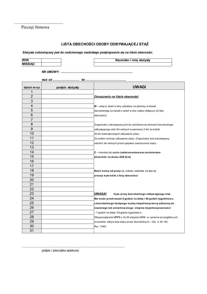 ….…...................................... Pieczęć firmowa LISTA OBECNOŚCI OSOBY ODBYWAJĄCEJ STAŻ Stażysta zobowiązany jest do codziennego osobistego podpisywania się na liście obecności. ROK MIESIĄC Nazwisko i imię stażysty NR UMOWY: .............................................................................. staż od ............................. do ............................................ dzień m-ca 1 2 3 4 5 6 7 8 9 10 11 12 13 14 15 16 17 18 19 20 21 22 23 24 25 26 27 28 29 30 31 UWAGI podpis stażysty Oznaczenia na liście obecności W – urlop tj. dzień w olny udzielony na pisemny w niosek bezrobotnego (w niosek o dzień w olny należy dołączyć do listy obecności) Organizator zob owiązany jest do udzielenia na wniosek b ezrob otnego odb ywającego staż dni wolnych w wymiarze 2 dni za każde 30 dni kalendarzowych odb ywania stażu. Za ostatni miesiąc odb ywania stażu. Organizator jest zob owiązany udzielić dni wolnych przed upływem zakończenia stażu. C – choroba lub opieka (udok um e ntow ana zw olnie nie m le k ars k im na druk u ZUS ZLA) Dzie ń w olny od pracy np. sobota, niedziela, św ięto itp. pros zę w yk re ś lić z lis ty obe cnoś ci UWAGA! Czas pracy be zrobotnego odbyw ające go s taż Nie m oże prze k raczać 8 godzin na dobę i 40 godzin tygodniow o, a be zrobotne go bę dące go os obą nie pe łnos praw ną zaliczoną do znaczne go lub um iark ow ane go s topnia nie pe łnos praw noś ci – 7 godzin na dobę i 35 godzin tygodniow o. (Rozporządzenie MPiPS z dn.20 sierpnia 2009r. w spraw ie szczegółow ych w arunków odbyw ania stażu przez bezrobotnych – (Dz. U. Nr 142, Poz. 1160) ................................................................................................................ podpis i pieczątka opiekuna