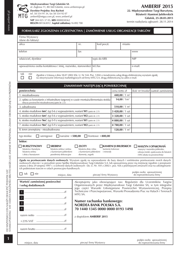 www.amberif.pl Miedzynarodowe Targi Gdańskie SA ul. Żaglowa 11, 80-560 Gdańsk, www.amberexpo.pl Dyrektor Projektu: Ewa Rachoń tel. 58 554 91 34, fax 58 554 92 07 [email protected], www.amberif.pl NIP 584 025 37 05, KRS 0000038362 REGON 001363012 , kapitał zakładowy 16 892 700 AMBERIF 2015 22. Międzynarodowe Targi Bursztynu, Biżuterii i Kamieni Jubilerskich Gdańsk, 25-28.03.2015 termin nadsyłania zgłoszeń: 28.11.2014 FORMULARZ ZGŁOSZENIA UCZESTNICTWA | ZAMÓWIENIE USŁUG ORGANIZACJI TARGÓW Firma Wystawcy (dane do faktury) ulica nr. telefon fax właściciel, dyrektor kod poczt. miasto www wpis do KRS NIP upoważniona osoba kontaktowa ( imię, nazwisko, stanowisko) tel./fax DO WSZYSTKICH CEN NALEŻY DOLICZYĆ PODATEK VAT STAWKA PODATKU VAT I KWOTA NALEŻNOŚCI BRUTTO MOŻE ULEC ZMIANIE W PRZYPADKU ZMIANY OBOWIĄZUJĄCYCH PRZEPISÓW tak nie e-mail: Zgodnie z Ustawą z dnia 18.07.2002 (Dz. U. Nr 144. Poz. 1204) o świadczeniu usług drogą elektroniczną wyrażam zgodę na otrzymywanie informacji marketingowych od firmy MTG S.A. drogą elektroniczną na adres e-mail. ZAMAWIAMY NASTĘPUJĄCĄ POWIERZCHNIĘ powierzchnia cena netto zł ilość m2/moduł wartość zamówienia 440,00 / 1 m 1. niezabudowana 2 2. opłata za korzystanie z infrastruktury targowej w czasie montażu/demontażu stoiska dotyczy powierzchni niezabudowanej (patrz str. 2.3) 14,00 / 1m2 510,00 / 1 m2 3. zabudowana 4. stoisko mudułowe 6m2, typ S-6 z wyposażeniem, wariant W1 (patrz str. 2.1) 3 420,00 / 1 szt 5. stoisko mudułowe 6m , typ S-6 z wyposażeniem, wariant W2 (patrz str. 2.1) 3 320,00 / 1 szt 6. stoisko mudułowe 9m , typ S-9 z wyposażeniem, wariant W1 (patrz str. 2.1) 4 880,00 / 1 szt 7. stoisko mudułowe 9m , typ S-9 z wyposażeniem, wariant W2 (patrz str. 2.1) 4 780,00 / 1 szt 2 2 2 8. teren zewnętrzny - niezabudowana typ stoiska: szeregowe 120,00 / 1 m2 narożne +500,00 frontowe +800,00 Sektor: BURSZTYNOWY biżuteria z bursztynu biżuteria srebna i złota z bursztynem SREBRNY biżuteria srebna i srebna z kamieniami jubilerskimi przedmioty dekoracyjne ZŁOTY biżuteria złota i złota z kamieniami jubilerskimi diamenty, zegarki KAMIENI JUBILERSKICH kamienie kolorowe i minerały MASZYN I OPAKOWAŃ maszyny i narzedzia jubilerskie, rafiacja metali, opakowania do biżuterii (10% rabatu na powierzchnię) Zgoda na przetwarzanie danych osobowych. Wyrażam zgodę na wprowadzenie do bazy danych i wielokrotne przetwarzanie moich danych osobowych obecnie i w przyszłości przez Spółkę Międzynarodowe Targi Gdańskie S.A. lub opoważnioną przez nią instytucję (zgodnie z przepisami ustawy z dnia 29 sierpnia 1997 r. o ochronie danych osobowych - Dz. U. Nr. 101 z 2002 r. poz. 926 z późniejszymi zmianami oraz na udostępnianie ich podmiotom trzecim w celach promocyjno-handlowych. podpis osoby upoważnionej tak nie pieczęć firmy Wystawcy do reprezentowania firmy miejsce, data Wartość zamówionej powierzchni i usług dodatkowych 1 .....................................................zł 2 .....................................................zł 3 .....................................................zł 4 .....................................................zł razem netto .....................................zł +23% VAT Akceptujemy jako obowiązujące nas: Regulamin dla Uczestników Targów Organizowanych przez Międzynarodowe Targi Gdańskie SA, w tym integralne jego części Warunki Udostępniane Powierzchni Wystawienniczej, Przepisy Techniczne i Przeciwpożarowe, Warunki Prowadzenia Prac na Halach i Terenach MTG SA. Numer rachunku bankowego: NORDEA BANK POLSKA S.A. 70 1440 1345 0000 0000 0193 1498 z dopiskiem AMBERIF 2015 .....................................zł razem brutto ......................................zł miejsce, data pieczęć firmy Wystawcy podpis osoby upoważnionej do reprezentowania firmy www.amberif.pl AMBERIF 2015 Gdańsk, 25-28.03.2015 22. Międzynarodowe Targi Bursztynu, Biżuterii i Kamieni Jubilerskich termin nadsyłania zgłoszeń: 28.11.2014 WYPOSAŻENIE I DODATKOWE USŁUGI Uzgodnienia techniczne: Małgorzata Dopierała, Manager Techniczny, tel. 58 554 93 38, [email protected], [email protected] Zamawiamy: cena netto zł typ GABLOTY SZKLANE 240,00 240,00 240,00 140,00 140,00 140,00 1. 2. 3. 4. 5. 6. cena netto zł DO WSZYSTKICH CEN NALEŻY DOLICZYĆ PODATEK VAT STAWKA PODATKU VAT I KWOTA NALEŻNOŚCI BRUTTO MOŻE ULEC ZMIANIE W PRZYPADKU ZMIANY OBOWIĄZUJĄCYCH PRZEPISÓW Firma Wystawcy 70,00 70,00 70,00 70,00 70,00 70,00 70,00 70,00 70,00 70,00 100 x 100 x 250 cm 50 x 100 x 250 cm 50 x 50 x 250 cm 100 x 100 x 100 cm 50 x 100 x 100 cm 50 x 50 x 100 cm ......... .......... ......... .......... ......... .......... .......... .......... .......... PODESTY* 7. 8. 9. 10. 11. 12. 13. 14. 15. 16. ilość 50 x 50 x 50 cm 50 x 50 x 70 cm 50 x 100 x 30 cm 50 x 100 x 50 cm 50 x 100 x 70 cm 50 x 100 x 100 cm 100 x 100 x 30 cm 100 x 100 x 50 cm 100 x 100 x 70 cm 100 x 100 x 100 cm ilość MEBLE I WYPOSAŻENIE 80,00 100,00 100,00 50,00 60,00 30,00 20,00 60,00 17. 18. 19. 20. 21. 22. 23. 24. 25,00 20,00 45,00 40,00 200,00 30,00 40,00 25 26. 27. 28. 29. 30. 31. lada informacyjna lada łukowa regał (z elem. zabud.) stół kwadratowy stół okrągły stojak na prospekty półka 25x100 cm kratownica do wieszania korali 80x100 cm krzesło tapicerowane krzesło plastikowe stołek barowy szafka kuchenna lodówka (135l) czajnik elektryczny ekspres do kawy 180,00 380,00 460,00 540,00 600,00 650,00 150,00 200,00 30,00 35,00 60,00 30,00 .......... .......... .......... .......... .......... .......... .......... cena netto zł .......... .......... 250,00 .......... 200,00 *Eksponaty o wadze powyżej 50 kg wymagają wzmocnionych podestów. W razie zapotrzebowania zaznaczyć „W”. cena netto zł cena netto zł cena netto zł ilość .......... .......... .......... .......... .......... .......... .......... .......... .......... .......... .......... .......... .......... .......... .......... Z