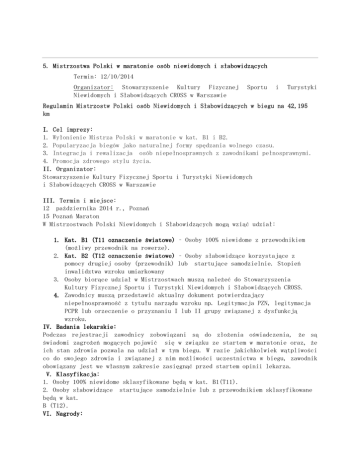 5. Mistrzostwa Polski w maratonie osób niewidomych i słabowidzących Termin: 12/10/2014 Organizator: Stowarzyszenie Kultury Fizycznej Niewidomych i Słabowidzących CROSS w Warszawie Sportu i Turystyki Regulamin Mistrzostw Polski osób Niewidomych i Słabowidzących Słabowidzących w biegu na 42,195 km I. Cel imprezy: 1. Wyłonienie Mistrza Polski w maratonie w kat. B1 i B2. 2. Popularyzacja biegów jako naturalnej formy spędzania wolnego czasu. 3. Integracja i rewalizacja osób niepełnosprawnych z zawodnikami pełnosprawnymi. 4. Promocja zdrowego stylu życia. II. Organizator: Stowarzyszenie Kultury Fizycznej Sportu i Turystyki Niewidomych i Słabowidzących CROSS w Warszawie III. Termin i miejsce: 12 października 2014 r., Poznań 15 Poznań Maraton W Mistrzostwach Polski Niewidomych i Słabowidzących mogą wziąć udział: 1. Kat. B1 (T11 oznaczenie światowe) – Osoby 100% niewidome z przewodnikiem (możliwy przewodnik na rowerze). 2. Kat. B2 (T12 oznaczenie światowe) – Osoby słabowidzące korzystające z pomocy drugiej osoby (przewodnik) lub startujące samodzielnie. Stopień inwalidztwa wzroku umiarkowany 3. Osoby biorące udział w Mistrzostwach muszą należeć do Stowarzyszenia Kultury Fizycznej Sportu i Turystyki Niewidomych i Słabowidzących CROSS. 4. Zawodnicy muszą przedstawić aktualny dokument potwierdzający niepełnosprawność z tytułu narządu wzroku np. Legitymacja PZN, legitymacja PCPR lub orzeczenie o przyznaniu I lub II grupy związanej z dysfunkcją wzroku. IV. Badania lekarskie: Podczas rejestracji zawodnicy zobowiązani są do złożenia oświadczenia, że są świadomi zagrożeń mogących pojawić się w związku ze startem w maratonie oraz, że ich stan zdrowia pozwala na udział w tym biegu. W razie jakichkolwiek wątpliwości co do swojego zdrowia i związanej z nim możliwości uczestnictwa w biegu, zawodnik obowiązany jest we własnym zakresie zasięgnąć przed startem opinii lekarza. V. Klasyfikacja: 1. Osoby 100% niewidome sklasyfikowane będą w kat. B1(T11). 2. Osoby słabowidzące startujące samodzielnie lub z przewodnikiem sklasyfikowane będą w kat. B (T12). VI. Nagrody: Trzej pierwsi zawodnicy z każdej kategorii otrzymają pamiątkowy puchar, pamiątkowy medal, a dyplom ukończenia biegu. VII.Zgłoszenia: Wszyscy zawodnicy, którzy chcą wziąć udział w Mistrzostwach Polski w maratonie powinni się zgłosić w terminie do 15 września 2014 r. do przedstawiciela Stowarzyszenia Cross Pana Wiesława Miecha, tel. 502 375 444. Zgłoszenia wszystkich zawodników do biegu głównego dokona przedstawiciel Cross. VIII.Postanowienia końcowe: 1. Podczas biegu uczestnicy muszą posiadać numery startowe przekazane przez organizatora, przypięte z przodu do koszulki startowej. Zasłanianie numeru startowego w części lub w całości jest niedopuszczalne pod karą dyskwalifikacji. 2. Pisemne protesty przyjmuje przedstawiciel CROSS w dniu odbywania się zawodów. Przedstawiciel SKFSiTNS CROSS