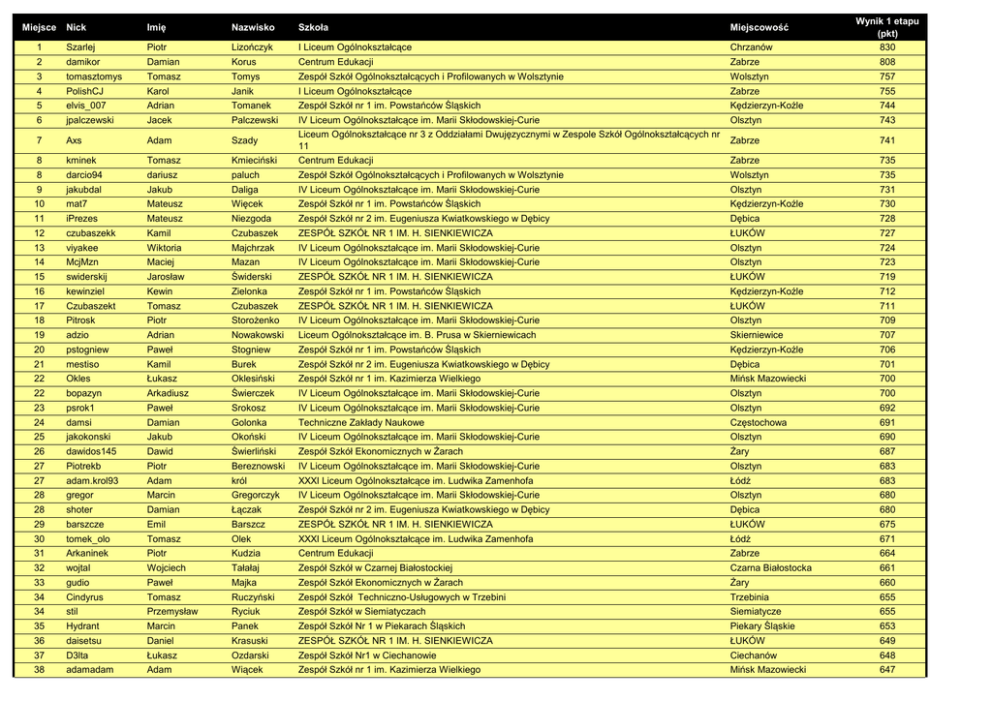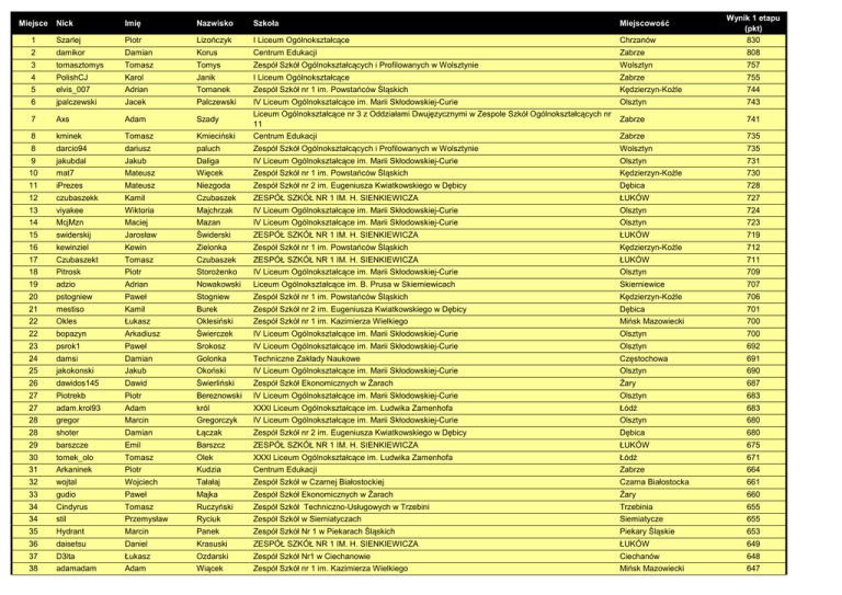 Miejsce Wynik 1 etapu (pkt) 830 Nick Imię Nazwisko Szkoła Miejscowość 1 Szarlej Piotr Lizończyk I Liceum Ogólnokształcące Chrzanów 2 damikor Damian Korus Centrum Edukacji Zabrze 808 3 tomasztomys Tomasz Tomys Zespół Szkół Ogólnokształcących i Profilowanych w Wolsztynie Wolsztyn 757 4 PolishCJ Karol Janik I Liceum Ogólnokształcące Zabrze 755 5 elvis_007 Adrian Tomanek Zespół Szkół nr 1 im. Powstańców Śląskich Kędzierzyn-Koźle 744 6 jpalczewski Jacek Palczewski Olsztyn 743 7 Axs Adam Szady Zabrze 741 8 kminek Tomasz Kmieciński IV Liceum Ogólnokształcące im. Marii Skłodowskiej-Curie Liceum Ogólnokształcące nr 3 z Oddziałami Dwujęzycznymi w Zespole Szkół Ogólnokształcących nr 11 Centrum Edukacji Zabrze 735 8 darcio94 dariusz paluch Zespół Szkół Ogólnokształcących i Profilowanych w Wolsztynie Wolsztyn 735 9 jakubdal Jakub Daliga IV Liceum Ogólnokształcące im. Marii Skłodowskiej-Curie Olsztyn 731 10 mat7 Mateusz Więcek Zespół Szkół nr 1 im. Powstańców Śląskich Kędzierzyn-Koźle 730 11 iPrezes Mateusz Niezgoda Zespół Szkół nr 2 im. Eugeniusza Kwiatkowskiego w Dębicy Dębica 728 12 czubaszekk Kamil Czubaszek ZESPÓŁ SZKÓŁ NR 1 IM. H. SIENKIEWICZA ŁUKÓW 727 13 viyakee Wiktoria Majchrzak IV Liceum Ogólnokształcące im. Marii Skłodowskiej-Curie Olsztyn 724 14 McjMzn Maciej Mazan IV Liceum Ogólnokształcące im. Marii Skłodowskiej-Curie Olsztyn 723 15 swiderskij Jarosław Świderski ZESPÓŁ SZKÓŁ NR 1 IM. H. SIENKIEWICZA ŁUKÓW 719 16 kewinziel Kewin Zielonka Zespół Szkół nr 1 im. Powstańców Śląskich Kędzierzyn-Koźle 712 17 Czubaszekt Tomasz Czubaszek ZESPÓŁ SZKÓŁ NR 1 IM. H. SIENKIEWICZA ŁUKÓW 711 18 Pitrosk Piotr Storożenko IV Liceum Ogólnokształcące im. Marii Skłodowskiej-Curie Olsztyn 709 19 adzio Adrian Nowakowski Liceum Ogólnokształcące im. B. Prusa w Skierniewicach Skierniewice 707 20 pstogniew Paweł Stogniew Zespół Szkół nr 1 im. Powstańców Śląskich Kędzierzyn-Koźle 706 21 mestiso Kamil Burek Zespół Szkół nr 2 im. Eugeniusza Kwiatkowskiego w Dębicy Dębica 701 22 Okles Łukasz Oklesiński Zespół Szkół nr 1 im. Kazimierza Wielkiego Mińsk Mazowiecki 700 22 bopazyn Arkadiusz Świerczek IV Liceum Ogólnokształcące im. Marii Skłodowskiej-Curie Olsztyn 700 23 psrok1 Paweł Srokosz IV Liceum Ogólnokształcące im. Marii Skłodowskiej-Curie Olsztyn 692 24 damsi Damian Golonka Techniczne Zakłady Naukowe Częstochowa 691 25 jakokonski Jakub Okoński IV Liceum Ogólnokształcące im. Marii Skłodowskiej-Curie Olsztyn 690 26 dawidos145 Dawid Świerliński Zespół Szkół Ekonomicznych w Żarach Żary 687 27 Piotrekb Piotr Bereznowski IV Liceum Ogólnokształcące im. Marii Skłodowskiej-Curie Olsztyn 683 27 adam.krol93 Adam król XXXI Liceum Ogólnokształcące im. Ludwika Zamenhofa Łódź 683 28 gregor Marcin Gregorczyk IV Liceum Ogólnokształcące im. Marii Skłodowskiej-Curie Olsztyn 680 28 shoter Damian Łączak Zespół Szkół nr 2 im. Eugeniusza Kwiatkowskiego w Dębicy Dębica 680 29 barszcze Emil Barszcz ZESPÓŁ SZKÓŁ NR 1 IM. H. SIENKIEWICZA ŁUKÓW 675 30 tomek_olo Tomasz Olek XXXI Liceum Ogólnokształcące im. Ludwika Zamenhofa Łódź 671 31 Arkaninek Piotr Kudzia Centrum Edukacji Zabrze 664 32 wojtal Wojciech Tałałaj Zespół Szkół w Czarnej Białostockiej Czarna Białostocka 661 33 gudio Paweł Majka Zespół Szkół Ekonomicznych w Żarach Żary 660 34 Cindyrus Tomasz Ruczyński Zespół Szkół Techniczno-Usługowych w Trzebini Trzebinia 655 34 stil Przemysław Ryciuk Zespół Szkół w Siemiatyczach Siemiatycze 655 35 Hydrant Marcin Panek Zespół Szkół Nr 1 w Piekarach Śląskich Piekary Śląskie 653 36 daisetsu Daniel Krasuski ZESPÓŁ SZKÓŁ NR 1 IM. H. SIENKIEWICZA ŁUKÓW 649 37 D3lta Łukasz Ozdarski Zespół Szkół Nr1 w Ciechanowie Ciechanów 648 38 adamadam Adam Wiącek Zespół Szkół nr 1 im. Kazimierza Wielkiego Mińsk Mazowiecki 647 39 norbert93 Norbert Łuczak Liceum Ogólnokształcące Zespół Szkół i Placówek Oświatowych im. M.Kopernika Kalwaria Zebrzydowska 645 40 GMajka Grzegorz Majka Zespół Szkół Agro-Technicznych w Ropczycach Ropczyce 644 41 modyzboro Kamil Kompała Zespół Szkół Ogólnokształcąco- Technicznych w Lublińcu Lubliniec 643 41 mk321 Marcin Kowalczyk Zespół Szkół nr 1 im. Kazimierza Wielkiego Mińsk Mazowiecki 643 42 Agares Paweł Łuczkiewicz VI Liceum Ogólnokształcące Gdynia 641 42 rokr Patryk Pić Zespół Szkół Nr 1 w Piekarach Śląskich Piekary Śląskie 641 42 miXUE Dawid Pstrak IV Liceum Ogólnokształcące im. Marii Skłodowskiej-Curie Olsztyn 641 42 ceville Łukasz Stohnij Zespół Szkół Ekonomicznych w Żarach Żary 641 42 pwojtowicz Patrycja Wójtowicz II liceum Ogólnokształcące w Puławach Puławy 641 43 Pantograv Przemysław Składowski VI Liceum Ogólnokształcące Gdynia 634 44 trololololoJP Jakub Piątek I Liceum Ogólnokształcące im. J.I.Kraszewskiego w Białej Podlaskiej Biała Podlaska 627 45 puma4121 Adrian Kot ZESPÓŁ SZKÓŁ NR 1 IM. H. SIENKIEWICZA ŁUKÓW 626 46 Boo Damian Grabowski IV Liceum Ogólnokształcące im. Marii Skłodowskiej-Curie Olsztyn 623 47 Mirti Marcin Mytych Zespół Szkół Technicznych Kolbuszowa 618 48 Majki22 Mikołaj Rydecki Techniczne Zakłady Naukowe Częstochowa 616 49 P.G. Piotr Garbuz Zespół Szkół w Sokółce Sokółka 615 50 celinskim Maciek Celiński ZESPÓŁ SZKÓŁ NR 1 IM. H. SIENKIEWICZA ŁUKÓW 612 51 Repcak Kacper Krerowicz I Liceum Ogólnokształcące im. Karola Miarki Mikołów 611 52 kkusmierz Klaudia Kuśmierz II liceum Ogólnokształcące w Puławach Puławy 605 53 MiniG Marcin Głąb XVIII Liceum Ogólnokształcące w ZSTiO Nr 3 im.E.Abramowskiego w Katowicach Katowice 603 53 mateusz_1228 Mateusz Żochowski Zespół Szkół im. T. Kościuszki Milicz 603 54 maciek93 Maciej Bargiel IV Liceum Ogólnokształcące im. Stanisława Staszica Sosnowiec 600 55 pokrywka14 Łukasz Pokrywiecki Żary 597 56 rafalplus03 
