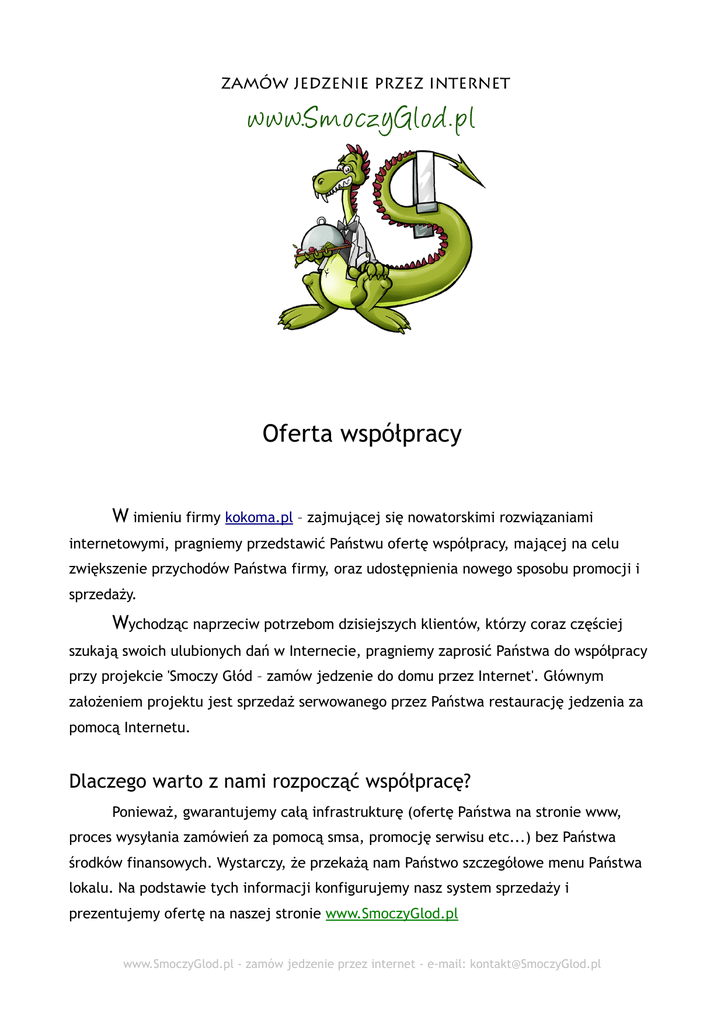 Oferta współpracy W imieniu firmy kokoma.pl – zajmującej się nowatorskimi rozwiązaniami internetowymi, pragniemy przedstawić Państwu ofertę współpracy, mającej na celu zwiększenie przychodów Państwa firmy, oraz udostępnienia nowego sposobu promocji i sprzedaży. Wychodząc naprzeciw potrzebom dzisiejszych klientów, którzy coraz częściej szukają swoich ulubionych dań w Internecie, pragniemy zaprosić Państwa do współpracy przy projekcie 'Smoczy Głód – zamów jedzenie do domu przez Internet'. Głównym założeniem projektu jest sprzedaż serwowanego przez Państwa restaurację jedzenia za pomocą Internetu. Dlaczego warto z nami rozpocząć współpracę? Ponieważ, gwarantujemy całą infrastrukturę (ofertę Państwa na stronie www, proces wysyłania zamówień za pomocą smsa, promocję serwisu etc...) bez Państwa środków finansowych. Wystarczy, że przekażą nam Państwo szczegółowe menu Państwa lokalu. Na podstawie tych informacji konfigurujemy nasz system sprzedaży i prezentujemy ofertę na naszej stronie www.SmoczyGlod.pl www.SmoczyGlod.pl - zamów jedzenie przez internet - e-mail: [email protected] Najlepsze pozostawiamy na deser... Ten nowy sposób dokonywania zamówień na pewno pozwoli poszerzyć grono Państwa klientów. Za pośrednictwem strony www.SmoczyGlod.pl klient będzie mieć możliwość wyboru dowolnej potrawy z oferty Państwa restauracji. Po dokonaniu wyboru składa on zamówienie, które trafia do Państwa za pomocą smsa. Jak to działa? Dzięki stronie www.SmoczyGlod.pl klient bardzo szybko i w prosty sposób może złożyć zamówienie potrawy jaka go w danym momencie interesuje. Poniższy schemat przedstawia zasadę działania serwisu: a) jestem głodny, chcę zamówić jedzenie i zobaczyć aktualną ofertę teraz b) chcę wypełnić prosty formularz zamówienia c) chcę złożyć zamówienie na wybrany przeze mnie adres (domowy, lub firmowy) d) i czekać na szybką dostawę Jakie są warunki naszej współpracy? Nasze warunki współpracy są jasne i przejrzyste - bez ukrytych kosztów. Przedstawiają się one następująco: - prowizja 10% od wartości brutto zamówień, które trafiły do Was poprzez Smoczy Głód, - rozliczenie raz w miesiącu (na podstawie raportu do którego mają Państwo dostęp), - jeżeli nie ma zamówień to Państwo nie ponosicie żadnych kosztów, - prezentacja i aktualizacja oferty Państwa lokalu w serwisie jest bezpłatna, - utrzymanie, rozwój i marketing strony należy do nas, Zapraszam do współpracy Mariusz Kosecki www.SmoczyGlod.pl - zamów jedzenie przez internet - e-mail: [email protected]