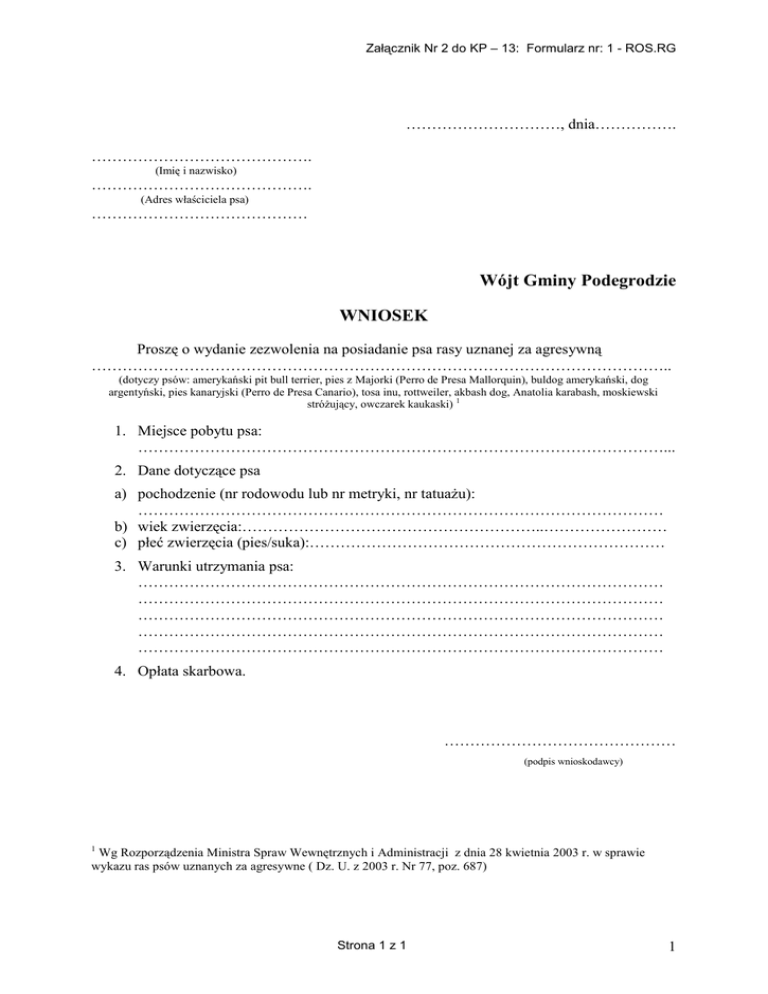 Załącznik Nr 2 do KP – 13: Formularz nr: 1 - ROS.RG …………………………, dnia……………. ……………………………………. (Imię i nazwisko) ……………………………………. (Adres właściciela psa) …………………………………… Wójt Gminy Podegrodzie WNIOSEK Proszę o wydanie zezwolenia na posiadanie psa rasy uznanej za agresywną ………………………………………………………………………………………………….. (dotyczy psów: amerykański pit bull terrier, pies z Majorki (Perro de Presa Mallorquin), buldog amerykański, dog argentyński, pies kanaryjski (Perro de Presa Canario), tosa inu, rottweiler, akbash dog, Anatolia karabash, moskiewski stróżujący, owczarek kaukaski) 1 1. Miejsce pobytu psa: …………………………………………………………………………………………... 2. Dane dotyczące psa a) pochodzenie (nr rodowodu lub nr metryki, nr tatuażu): ………………………………………………………………………………………… b) wiek zwierzęcia:…………………………………………………..…………………… c) płeć zwierzęcia (pies/suka):…………………………………………………………… 3. Warunki utrzymania psa: ………………………………………………………………………………………… ………………………………………………………………………………………… ………………………………………………………………………………………… ………………………………………………………………………………………… ………………………………………………………………………………………… 4. Opłata skarbowa. ……………………………………… (podpis wnioskodawcy) 1 Wg Rozporządzenia Ministra Spraw Wewnętrznych i Administracji z dnia 28 kwietnia 2003 r. w sprawie wykazu ras psów uznanych za agresywne ( Dz. U. z 2003 r. Nr 77, poz. 687) Strona 1 z 1 1