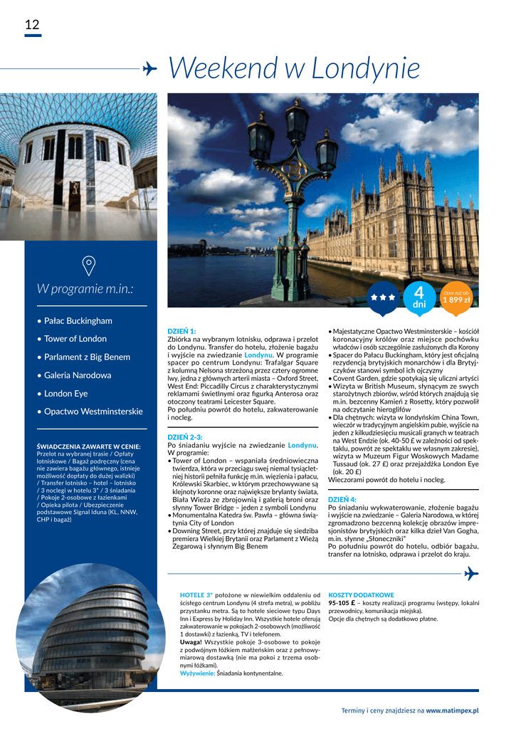 12 Weekend w Londynie 4 W programie m.in.: dni CENY JUŻ OD 1 899 zł •Pałac Buckingham •Tower of London •Parlament z Big Benem •Galeria Narodowa •London Eye •Opactwo Westminsterskie ŚWIADCZENIA ZAWARTE W CENIE: Przelot na wybranej trasie / Opłaty lotniskowe / Bagaż podręczny (cena nie zawiera bagażu głównego, istnieje możliwość dopłaty do dużej walizki) / Transfer lotnisko – hotel – lotnisko / 3 noclegi w hotelu 3* / 3 śniadania / Pokoje 2-osobowe z łazienkami / Opieka pilota / Ubezpieczenie podstawowe Signal Iduna (KL, NNW, CHP i bagaż) DZIEŃ 1: Zbiórka na wybranym lotnisku, odprawa i przelot do Londynu. Transfer do hotelu, złożenie bagażu i wyjście na zwiedzanie Londynu. W programie spacer po centrum Londynu: Trafalgar Square z kolumną Nelsona strzeżoną przez cztery ogromne lwy, jedna z głównych arterii miasta – Oxford Street, West End: Piccadilly Circus z charakterystycznymi reklamami świetlnymi oraz figurką Anterosa oraz otoczony teatrami Leicester Square. Po południu powrót do hotelu, zakwaterowanie i nocleg. DZIEŃ 2-3: Po śniadaniu wyjście na zwiedzanie Londynu. W programie: •Tower of London – wspaniała średniowieczna twierdza, która w przeciągu swej niemal tysiącletniej historii pełniła funkcję m.in. więzienia i pałacu, Królewski Skarbiec, w którym przechowywane są klejnoty koronne oraz największe brylanty świata, Biała Wieża ze zbrojownią i galerią broni oraz słynny Tower Bridge – jeden z symboli Londynu •Monumentalna Katedra św. Pawła – główna świątynia City of London •Downing Street, przy której znajduje się siedziba premiera Wielkiej Brytanii oraz Parlament z Wieżą Zegarową i słynnym Big Benem HOTELE 3* położone w niewielkim oddaleniu od ścisłego centrum Londynu (4 strefa metra), w pobliżu przystanku metra. Są to hotele sieciowe typu Days Inn i Express by Holiday Inn. Wszystkie hotele oferują zakwaterowanie w pokojach 2-osobowych (możliwość 1 dostawki) z łazienką, TV i telefonem. Uwaga! Wszystkie pokoje 3-osobowe to pokoje z podwójnym łóżkiem małżeńskim oraz z pełnowymiarową dostawką (nie ma pokoi z trzema osobnymi łóżkami). Wyżywienie: Śniadania kontynentalne. •Majestatyczne Opactwo Westminsterskie – kościół koronacyjny królów oraz miejsce pochówku władców i osób szczególnie zasłużonych dla Korony •Spacer do Pałacu Buckingham, który jest oficjalną rezydencją brytyjskich monarchów i dla Brytyjczyków stanowi symbol ich ojczyzny •Covent Garden, gdzie spotykają się uliczni artyści •Wizyta w British Museum, słynącym ze swych starożytnych zbiorów, wśród których znajdują się m.in. bezcenny Kamień z Rosetty, który pozwolił na odczytanie hieroglifów •Dla chętnych: wizyta w londyńskim China Town, wieczór w tradycyjnym angielskim pubie, wyjście na jeden z kilkudziesięciu musicali granych w teatrach na West Endzie (ok. 40-50 £ w zależności od spektaklu, powrót ze spektaklu we własnym zakresie), wizyta w Muzeum Figur Woskowych Madame Tussaud (ok. 27 £) oraz przejażdżka London Eye (ok. 20 £) Wieczorami powrót do hotelu i nocleg. DZIEŃ 4: Po śniadaniu wykwaterowanie, złożenie bagażu i wyjście na zwiedzanie – Galeria Narodowa, w której zgromadzono bezcenną kolekcję obrazów impresjonistów brytyjskich oraz kilka dzieł Van Gogha, m.in. słynne „Słoneczniki” Po południu powrót do hotelu, odbiór bagażu, transfer na lotnisko, odprawa i przelot do kraju. KOSZTY DODATKOWE 95-105 £ – koszty realizacji programu (wstępy, lokalni przewodnicy, komunikacja miejska). Opcje dla chętnych są dodatkowo płatne. Terminy i ceny znajdziesz na www.matimpex.pl
