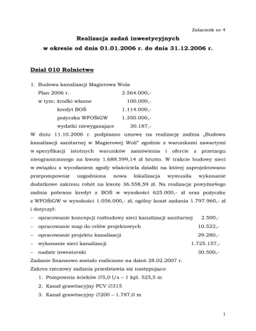 Załącznik nr 4 Realizacja zadań inwestycyjnych w okresie od dnia 01.01.2006 r. do dnia 31.12.2006 r. Dział 010 Rolnictwo 1. Budowa kanalizacji Magierowa Wola Plan 2006 r. 2.564.000,- w tym: środki własne 100.000,- kredyt BOŚ 1.114.000,- pożyczka WFOŚiGW 1.350.000,- wydatki niewygasające 30.187,- W dniu 11.10.2006 r. podpisano umowę na realizację zadnia „Budowa kanalizacji sanitarnej w Magierowej Woli” zgodnie z warunkami zawartymi w specyfikacji istotnych warunków zamówienia i ofercie z przetargu nieograniczonego na kwotę 1.688.599,14 zł brutto. W trakcie budowy sieci w związku z wycofaniem zgody właściciela działki na której zaprojektowano przepompownię uzgodniona nowa lokalizacja wymusiła wykonanie dodatkowe zakresu robót na kwotę 36.558,59 zł. Na realizację powyższ4ego zadnia pobrano kredyt z BOŚ w wysokości 625.000,- zł oraz pożyczkę z WFOŚiGW w wysokości 1.056.000,- zł, ogólny koszt zadania 1.797.960,- zł i dotyczył: − opracowanie koncepcji rozbudowy sieci kanalizacji sanitarnej 2.500,- − opracowanie map do celów projektowych 10.522,- − opracowanie projektu kanalizacji 29.280,- − wykonanie sieci kanalizacji − nadzór inwestorski 1.725.157,30.500,- Zadanie finansowo zostało rozliczone na dzień 28.02.2007 r. Zakres rzeczowy zadania przedstawia się następująco: 1. Pompownia ścieków ∅5,0 l/s – 1 kpl. 525,5 m 2. Kanał grawitacyjny PCV ∅315 3. Kanał grawitacyjny ∅200 – 1.787,0 m 1 4. Kanał grawitacyjny ∅160 – 1.737,5 m 5. Kanał tłoczny ∅110 – 2.632,0 m 2. Kontynuacja wodociągowania południowej części gminy oraz przebudowa stacji uzdatniania wody Bończa Plan 70.000,- Wydatki w 2006 r. w kwocie 14.618,- zł dotyczyły opłaty za mapę do celów projektowych oraz projekt rozbudowy sieci wodociągowej. Kwotę 55.381,- zł przeniesiono na subkonto wydatków niewygasających. Dział 600 Transport i Łączność 1. Modernizacja ciągu ulic Grójecka, Warszawska, Wójtowska Plan 80.000,- wydatki niewygasające 459.217,539.217,- Zlecono wykonanie projektu na modernizację ciągu ulic Warszawska – Grójecka na ogólną kwotę 280.060,- zł. W 2006 r. wydatki w kwocie 386.871,- zł dotyczyły zapłaty faktury za projekt ulic Warszawska – telekomunikacyjnych. Grójecka W oraz dniu zapłata 24.07.2006 r. za przebudowę podpisano linii umowę z Województwem Mazowieckim – Zarządem Dróg Wojewódzkich w sprawie wspólnej realizacji zadania „Przebudowa skrzyżowania ulic Grójeckiej, Puławskiej, Polnej i Warszawskiej. Kwotę 72.346,- zł przekazano z subkonta wydatków niewygasających na konto podstawowe i wprowadzono do budżetu 2007 roku. 2. Współfinansowanie zgodnie z porozumieniem modernizacji dróg powiatowych na terenie gminy Plan 373.000,- Zgodnie z podpisanym porozumieniem ze Starostwem Powiatu Grójeckiego dokonano modernizacji następujących dróg powiatowych 1) droga 34 –188 Dębnowola – Ostrołęka około 1.100 mb 2 2) droga 34 – 180 Laski – Kazimierków około 300 mb 3) droga 34 –179 Nowa Wieś – Lechanice około 1.695 mb 4) droga 34 – 193 Warka – Przylot około 1.250 mb 5) droga 37 – 176 Łychów – Wrociszew około 600 mb 6) droga 34 – 191 Klonowa Wola – Stara Warka 250 mb Ogólny koszt realizacji ww. zadań określono na kwotę 667.381,47 w tym: Gmina Warka 204.846,90 Starostwo Powiatowe 207.534,57 mieszkańcy 27.000,00 dotacja Urzędu Marszałkowskiego 228.000,00 Rozliczenia finansowego dokonano w dniu 08.08.2006 r. 3. Wykonanie projektu ul. Łąkowej Plan 20.000,- W 2006 r. wydatki w kwocie 2.045,21 zł dotyczyły wykonania map do celów projektowych ul. Łąkowej. Zgodnie z uchwałą Rady Miejskie w Warce kwotę 17.220,- zł przekazano na subkonto wydatków niewygasających. 4. Usunięcie starych drzew uszkadzających nawierzchnię ul. Lotników, dokonanie nowych nasadzeń i odtworzenie zmodernizowanej całej ulicy i chodników Plan 502.576,- Gminny Fundusz Ochrony Środowiska 250.000,752.576,- Termin realizacji zadania określono do dnia 30.09.2006 r. Ogólny koszt zadnia wynosi 740.473,- zł i dotyczy: − projekt rozbudowy i przebudowy ul. Lotników − kompleksowa przebudowa ul. Lotników 10.370,697.756,- − nadzór inwestorski 16.726,- − nasadzenie drzew 15.603,- 5. Opracowanie dokumentacji projektowej przebudowy ul. Niemojewskiej wraz z budową parkingu. 3 Plan 35.000,Wydatki w 2006 r. w kwocie 402,60 zł dotyczyły wykonania map do celów projektowych ulicy. Zgodnie z uchwałą Rady Miejskiej w Warce kwotę 34.597,- zł przekazano na subkonto wydatków niewygasających. 6. Przebudowa Placu St. Czarnieckiego. Plan 1.000.000,W dniu 03.11.2006 podpisano umowę na „Remont Pl. St. Czarnieckiego oraz ulic Warszawskiej i Senatorskiej w Warce etap I”. Zgodnie z przeprowadzonym przetargiem wykonanie ww. zadania określono na kwotę 1.558.135,83 zł brutto. Wykonanie zadania określono na dzień 15.05.2007 r. Środki finansowe w kwocie 992.345,- zł przekazano na subkonto wydatków niewygasających. Dział 700 Gospodarka Mieszkaniowa 1. Opracowanie projektu elewacji zewnętrznych budynków przy Pl. St. Czarnieckiego Plan 30.000,W dniu 15.05.2006 r. zlecono opracowanie projektu elewacji zewnętrznych budynków przy Pl. St. Czarnieckiego na ogólna kwotę 29.585,- zł. Dnia 18.09.2006 r. projekt została przekazany do gminy i opłacony zgodnie z umową Dział 750 Administracja Publiczna 1. Budowa Urzędu Gminy Plan 2.106.900,- wydatki niewygasające 582.690,2.689.590,- Wydatki w 2006 r. w kwocie 220.805 zł dotyczą: - faktura za nadzór budowlany 15.442,- 4 - faktura za roboty budowlane 500.920,- - faktura za opłatę przyłącza do sieci energetycznej 4.348,- Zgodnie z uchwałą Rady Miejskiej w Warce kwotę 2.106.890,- zł przeniesiono na subkonto wydatków niewygasających. 2. Zakup komputerów i oprogramowania Plan 100.000,Wydatki w 2006 r. w kwocie 79.298,- zł dotyczą: - zakup drukarki do kasy UM 2.074,- - zakup kasy fiskalnej 1.503,- - komputery 19 sz