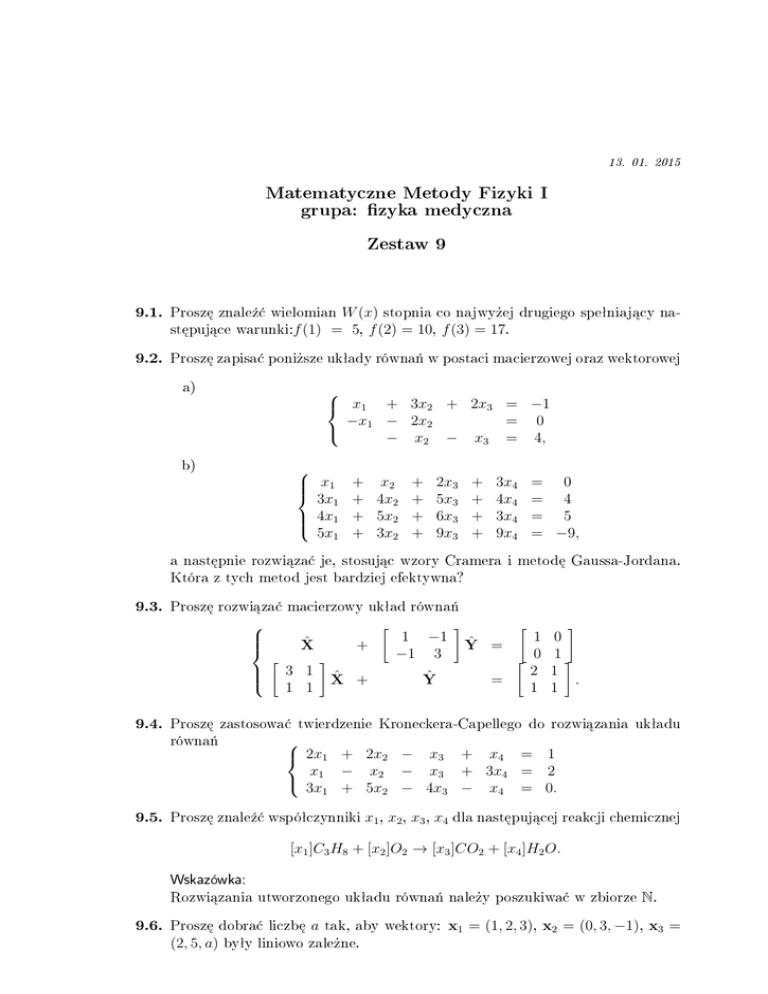 13. 01. 2015 Matematyczne Metody Fizyki I grupa: zyka medyczna Zestaw 9 9.1. Prosz¦ znale¹¢ wielomian W (x) stopnia co najwy»ej = 5, f (2) = 10, f (3) = 17. st¦puj¡ce warunki:f (1) 9.2. drugiego speªniaj¡cy na- Prosz¦ zapisa¢ poni»sze ukªady równa« w postaci macierzowej oraz wektorowej a) x1 + 3x2 + 2x3 = −1 −x1 − 2x2 = 0 − x2 − x3 = 4, b) x1 3x1 4x1 5x1 + x2 + 4x2 + 5x2 + 3x2 + + + + 2x3 5x3 6x3 9x3 + + + + 3x4 4x4 3x4 9x4 = 0 = 4 = 5 = −9, a nast¦pnie rozwi¡za¢ je, stosuj¡c wzory Cramera i metod¦ Gaussa-Jordana. Która z tych metod jest bardziej efektywna? 9.3. Prosz¦ rozwi¡za¢ macierzowy ukªad równa« X̂ 9.4. X̂ + Ŷ 1 Ŷ = 0 2 = 1 0 1 1 . 1 Prosz¦ zastosowa¢ twierdzenie Kroneckera-Capellego do rozwi¡zania ukªadu równa« 9.5. 3 1 1 1 + 1 −1 −1 3 2x1 + 2x2 − x3 + x4 = 1 x1 − x2 − x3 + 3x4 = 2 3x1 + 5x2 − 4x3 − x4 = 0. Prosz¦ znale¹¢ wspóªczynniki x1 , x2 , x 3 , x4 dla nast¦puj¡cej reakcji chemicznej [x1 ]C3 H8 + [x2 ]O2 → [x3 ]CO2 + [x4 ]H2 O. Wskazówka: Rozwi¡zania utworzonego ukªadu równa« nale»y poszukiwa¢ w zbiorze 9.6. Prosz¦ dobra¢ liczb¦ (2, 5, a) a tak, aby wektory: byªy liniowo zale»ne. N. x1 = (1, 2, 3), x2 = (0, 3, −1), x3 = 9.7. Prosz¦ sprawdzi¢, które ze zbiorów wektorów: a) x1 = (1, 2, 3), x2 = (2, 3, 1), x3 = (4, 4, 5), b) x1 = (2, i, −i), x2 = (2i, −1, 1), x3 = (1, 2, 3), c) x1 = (1, 3, 5), x2 = (1, 4, 7), x3 = (3, 8, 17), d) x1 = (1, 2, 2), x2 = (5, 1, 3), x3 = (9, 0, 4) s¡ liniowo zale»ne, a które s¡ liniowo niezale»ne. 9.8. Prosz¦ sprawdzi¢, który ze zbiorów wektorów: a) x1 = (1, 2, 3), x2 = (4, 5, 6) i x3 = (2, 1, 0), b) x1 = (1, 0, 0), x2 = (0, 1, 0) i x3 = (3, 0, 1) mo»e tworzy¢ baz¦ w przestrzeni liniowej V (R) takiej, »e dim V (R) znale¹¢ wspóªrz¦dne wektora x = (1, 1, 1) = 3. Prosz¦ wzgl¦dem bazy. Bartªomiej Spisak