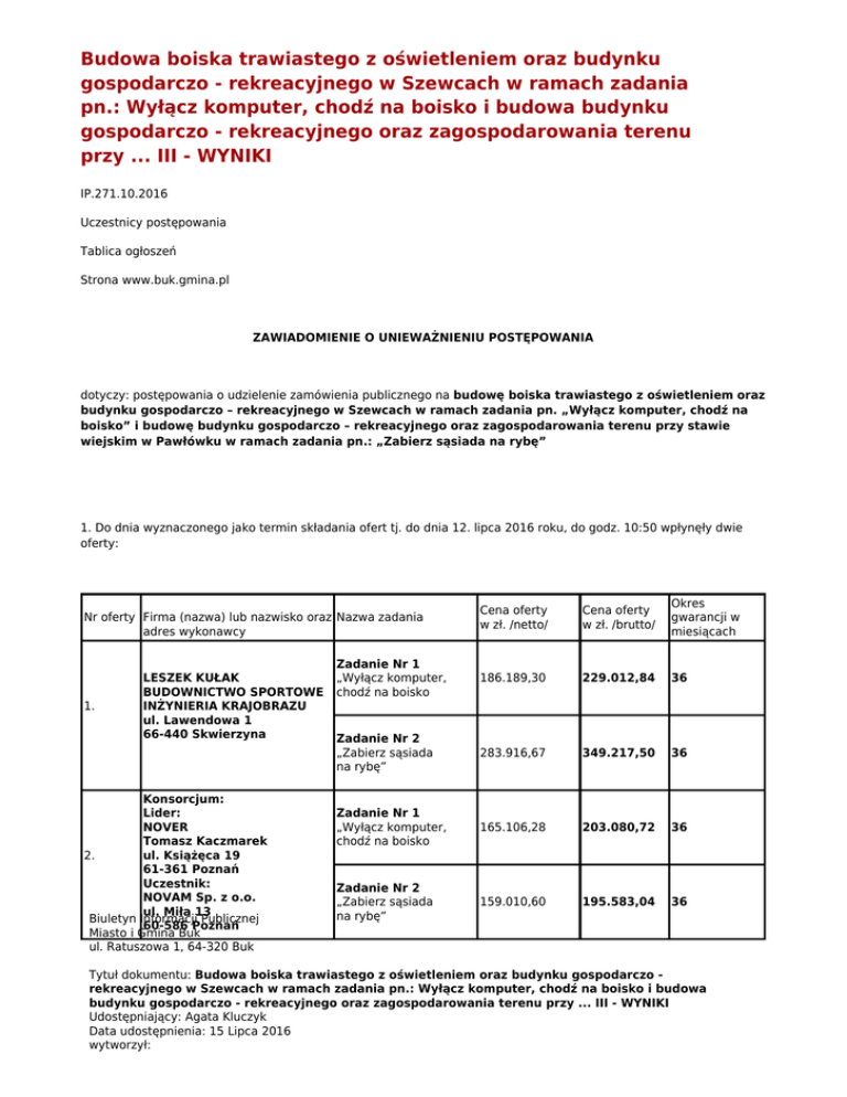 Budowa boiska trawiastego z oświetleniem oraz budynku gospodarczo - rekreacyjnego w Szewcach w ramach zadania pn.: Wyłącz komputer, chodź na boisko i budowa budynku gospodarczo - rekreacyjnego oraz zagospodarowania terenu przy ... III - WYNIKI IP.271.10.2016 Uczestnicy postępowania Tablica ogłoszeń Strona www.buk.gmina.pl ZAWIADOMIENIE O UNIEWAŻNIENIU POSTĘPOWANIA dotyczy: postępowania o udzielenie zamówienia publicznego na budowę boiska trawiastego z oświetleniem oraz budynku gospodarczo – rekreacyjnego w Szewcach w ramach zadania pn. „Wyłącz komputer, chodź na boisko” i budowę budynku gospodarczo – rekreacyjnego oraz zagospodarowania terenu przy stawie wiejskim w Pawłówku w ramach zadania pn.: „Zabierz sąsiada na rybę” 1. Do dnia wyznaczonego jako termin składania ofert tj. do dnia 12. lipca 2016 roku, do godz. 10:50 wpłynęły dwie oferty: Cena oferty w zł. /netto/ Cena oferty w zł. /brutto/ Okres gwarancji w miesiącach Zadanie Nr 1 „Wyłącz komputer, chodź na boisko 186.189,30 229.012,84 36 Zadanie Nr 2 „Zabierz sąsiada na rybę” 283.916,67 349.217,50 36 Zadanie Nr 1 „Wyłącz komputer, chodź na boisko 165.106,28 203.080,72 36 Zadanie Nr 2 „Zabierz sąsiada na rybę” 159.010,60 195.583,04 36 Nr oferty Firma (nazwa) lub nazwisko oraz Nazwa zadania adres wykonawcy 1. LESZEK KUŁAK BUDOWNICTWO SPORTOWE INŻYNIERIA KRAJOBRAZU ul. Lawendowa 1 66-440 Skwierzyna Konsorcjum: Lider: NOVER Tomasz Kaczmarek 2. ul. Książęca 19 61-361 Poznań Uczestnik: NOVAM Sp. z o.o. ul. Miła 13 Biuletyn Informacji Publicznej 60-586 Poznań Miasto i Gmina Buk ul. Ratuszowa 1, 64-320 Buk Tytuł dokumentu: Budowa boiska trawiastego z oświetleniem oraz budynku gospodarczo rekreacyjnego w Szewcach w ramach zadania pn.: Wyłącz komputer, chodź na boisko i budowa budynku gospodarczo - rekreacyjnego oraz zagospodarowania terenu przy ... III - WYNIKI Udostępniający: Agata Kluczyk Data udostępnienia: 15 Lipca 2016 wytworzył: 2. Zgodnie z art. 86 ust. 3 Ustawy z dnia 29 stycznia 2004 roku Prawo zamówień publicznych (Dz.U. z 2015 r., poz. 2164) Zamawiający poinformował przed otwarciem ofert, że kwota jaką Zamawiający zamierza przeznaczyć na sfinansowanie zamówienia wynosi: 270.000,00 zł brutto, w tym: Zadanie nr 1 : 150.000,00 zł brutto Zadanie nr 2 : 120.000,00 zł brutto 3. Burmistrz Miasta i Gminy Buk zawiadamia, że w związku z faktem, że cena ofertowa nie mieści się w planowanych przez Zamawiającego kosztach realizacji zadania przedmiotowe postępowanie zostaje unieważnione na podstawie art. 93 ust. 1 pkt 4 ustawy z dnia 29 stycznia 2004 roku – Prawo zamówień publicznych. Uzasadnienie: Zamawiający zgodnie z art. 86 ust. 3 Ustawy z dnia 29 stycznia 2004 roku Prawo zamówień publicznych (Dz.U. z 2015 r., poz. 2164) poinformował przed otwarciem ofert, że kwota jaką Zamawiający zamierza przeznaczyć na sfinansowanie zamówienia wynosi: 270.000,00 zł brutto, w tym na zadanie nr 1 Zamawiający przeznaczył 150.000,00 zł brutto, natomiast na zadanie nr 2 120.000,00 zł brutto. W przedmiotowym postępowaniu złożono dwie oferty. Oferta nr 1 złożona przez firmę Leszek Kułak Budownictwo Sportowe Inżynieria Krajobrazu, w której przedstawiono cenę 578.230,34 zł brutto, w tym na zadanie nr 1 cenę 229.012,84 zł brutto i na zadanie nr 2 cenę 349.217,50 zł brutto. Oferta nr 2 złożona przez Konsorcjum: NOVER Tomasz Kaczmarek i NOVAM sp. z o.o., w której przedstawiono cenę 398.663,76 zł brutto, w tym na zadanie nr 1 cenę 203.080,72 zł brutto i na zadanie nr 2 cenę 195.583,04 zł brutto. Ceny obu ofert przewyższają kwotę jaką Zamawiający zamierza przeznaczyć na sfinansowanie zamówienia, oferta nr 1 o 308.230,34 zł a oferta nr 2 o 128.663,76 zł. W związku z powyższym zasadnym jest unieważnienie przedmiotowego postępowania o udzielenie zamówienia. 4. Środki ochrony prawnej określone w dziale VI ustawy Pzp przysługują wykonawcy, uczestnikowi konkursu, a także innemu podmiotowi, jeżeli ma lub miał interes w uzyskaniu danego zamówienia oraz poniósł lub może ponieść szkodę w wyniku naruszenia przez Zamawiającego przepisów ustawy Pzp. Z poważaniem Z up. Burmistrza Miasta i Gminy Buk (-) Aleksandra Wawrzyniak Z-ca Burmistrza Miasta i Gminy Buk Biuletyn Informacji Publicznej Miasto i Gmina Buk ul. Ratuszowa 1, 64-320 Buk Tytuł dokumentu: Budowa boiska trawiastego z oświetleniem oraz budynku gospodarczo rekreacyjnego w Szewcach w ramach zadania pn.: Wyłącz komputer, chodź na boisko i budowa budynku gospodarczo - rekreacyjnego oraz zagospodarowania terenu przy ... III - WYNIKI Udostępniający: Agata Kluczyk Data udostępnienia: 15 Lipca 2016 wytworzył: