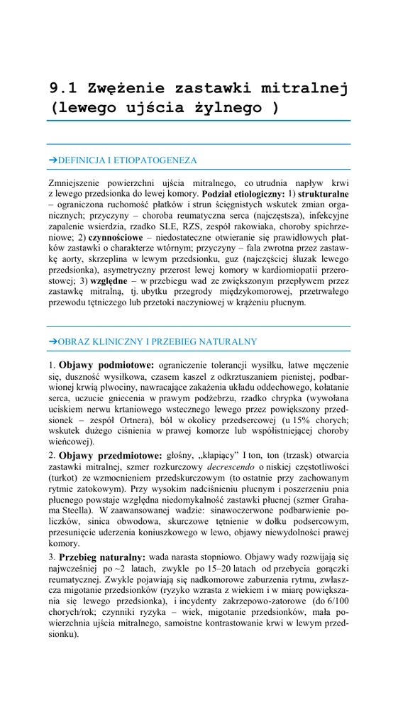 9.1 Zwężenie zastawki mitralnej (lewego ujścia żylnego ) ➔DEFINICJA I ETIOPATOGENEZA Zmniejszenie powierzchni ujścia mitralnego, co utrudnia napływ krwi z lewego przedsionka do lewej komory. Podział etiologiczny: 1) strukturalne – ograniczona ruchomość płatków i strun ścięgnistych wskutek zmian organicznych; przyczyny – choroba reumatyczna serca (najczęstsza), infekcyjne zapalenie wsierdzia, rzadko SLE, RZS, zespół rakowiaka, choroby spichrzeniowe; 2) czynnościowe – niedostateczne otwieranie się prawidłowych płatków zastawki o charakterze wtórnym; przyczyny – fala zwrotna przez zastawkę aorty, skrzeplina w lewym przedsionku, guz (najczęściej śluzak lewego przedsionka), asymetryczny przerost lewej komory w kardiomiopatii przerostowej; 3) względne – w przebiegu wad ze zwiększonym przepływem przez zastawkę mitralną, tj. ubytku przegrody międzykomorowej, przetrwałego przewodu tętniczego lub przetoki naczyniowej w krążeniu płucnym. ➔OBRAZ KLINICZNY I PRZEBIEG NATURALNY 1. Objawy podmiotowe: ograniczenie tolerancji wysiłku, łatwe męczenie się, duszność wysiłkowa, czasem kaszel z odkrztuszaniem pienistej, podbarwionej krwią plwociny, nawracające zakażenia układu oddechowego, kołatanie serca, uczucie gniecenia w prawym podżebrzu, rzadko chrypka (wywołana uciskiem nerwu krtaniowego wstecznego lewego przez powiększony przedsionek – zespół Ortnera), ból w okolicy przedsercowej (u 15% chorych; wskutek dużego ciśnienia w prawej komorze lub współistniejącej choroby wieńcowej). 2. Objawy przedmiotowe: głośny, „kłapiący” I ton, ton (trzask) otwarcia zastawki mitralnej, szmer rozkurczowy decrescendo o niskiej częstotliwości (turkot) ze wzmocnieniem przedskurczowym (to ostatnie przy zachowanym rytmie zatokowym). Przy wysokim nadciśnieniu płucnym i poszerzeniu pnia płucnego powstaje względna niedomykalność zastawki płucnej (szmer Grahama Steella). W zaawansowanej wadzie: sinawoczerwone podbarwienie policzków, sinica obwodowa, skurczowe tętnienie w dołku podsercowym, przesunięcie uderzenia koniuszkowego w lewo, objawy niewydolności prawej komory. 3. Przebieg naturalny: wada narasta stopniowo. Objawy wady rozwijają się najwcześniej po ~2 latach, zwykle po 15–20 latach od przebycia gorączki reumatycznej. Zwykle pojawiają się nadkomorowe zaburzenia rytmu, zwłaszcza migotanie przedsionków (ryzyko wzrasta z wiekiem i w miarę powiększania się lewego przedsionka), i incydenty zakrzepowo-zatorowe (do 6/100 chorych/rok; czynniki ryzyka – wiek, migotanie przedsionków, mała powierzchnia ujścia mitralnego, samoistne kontrastowanie krwi w lewym przedsionku). ➔ROZPOZNANIE Ustala się głównie na podstawie obrazu echokardiograficznego. Badania pomocnicze 1. EKG: cechy powiększenia lewego przedsionka, często P mitrale, częste przedsionkowe zaburzenia rytmu, zwłaszcza migotanie przedsionków; przy nadciśnieniu płucnym – dekstrogram, niezupełny blok prawej odnogi (rzadziej inne cechy przerostu i przeciążenia prawej komory), P mitrale może przybierać kształt P cardiale lub P pulmonale. 2. RTG klatki piersiowej: powiększenie lewego przedsionka, poszerzenie żył górnopłatowych, poszerzenie pnia tętnicy płucnej, obrzęk pęcherzykowy, obrzęk śródmiąższowy, powiększenie prawej komory, zwapnienia w rzucie zastawki mitralnej (rzadko). 3. Echokardiografia z badaniem doplerowskim: w celu oceny morfologii zastawki (ważne przy wyborze metody leczenia inwazyjnego), wykrycia skrzeplin w lewym przedsionku (pomocne badanie przezprzełykowe), oszacowania powierzchni ujścia mitralnego i klasyfikacji stopnia zwężenia tab. 9-1. 4. Próba wysiłkowa: w celu oceny wydolności wysiłkowej i wzrostu ciśnienia w tętnicy płucnej (wpływa na postępowanie z chorym). 5. Cewnikowanie serca i koronarografia: w celu oceny ciśnień w tętnicy płucnej (wpływa na postępowanie u części chorych); koronarografia zalecana po 35. rż. oraz u młodszych w razie dysfunkcji lewej komory lub podejrzenia choroby wieńcowej. ➔LECZENIE Zasady ogólne 1. Zwężenie niewielkie bez objawów podmiotowych: leczenie farmakologiczne. 2. Zwężenie umiarkowane lub duże (ciasne): postępowanie zależy przede wszystkim od występowania objawów podmiotowych i anatomii zastawki ryc. 9-1. Leczenie inwazyjne 1. Przezskórna walwuloplastyka mitralna (PMV): rozklejenie lub rozerwanie zrośniętych spoideł za pomocą balonu wprowadzonego z użyciem cewnika przez przegrodę międzyprzedsionkową; ze względu na dużą skuteczność i znikome ryzyko powikłań (zgonu, tamponady serca, zatorowości obwodowej) coraz częściej wykonywana we wczesnym okresie zwężenia zastawki mitralnej. 2. Operacyjna naprawa zastawki 1) zamknięta walwulotomia z dojścia przez przedsionek (rzadko wykonywana) 2) otwarta walwulotomia w krążeniu pozaustrojowym pod kontrolą wzroku. 3. Wymiana zastawki mitralnej: wskazana u chorych w III/IV klasie NYHA z nasilonymi zmianami w aparacie zastawkowym, gdy nie ma możliwości naprawy zastawki; większa śmiertelność szpitalna i odległa oraz częstość powikłań niż po PMV; w przypadku zastawki mechanicznej konieczność doustnej antykoagulacji do końca życia. Leczenie zachowawcze 1. Chorzy niekwalifikujący się do leczenia inwazyjnego lub niewyrażający na nie zgody: diuretyki (w razie objawów zastoju w krążeniu płucnym), digoksyna (zwłaszcza przy migotaniu przedsionków z szybką czynnością komór) i ACEI (jeśli współistnieje dysfunkcja lewej komory). 2. Leczenie przeciwkrzepliwe (INR 2–3): u chorych: z migotaniem przedsionków, po incydencie zatorowym lub z udokumentowaną skrzepliną w lewym przedsionku; z dużym lewym przedsionkiem (>55 mm); z samoistnym kontrastowaniem krwi w lewym przedsionku; ze współistniejącą niewydolnością skurczową lewej komory. 3. Kardiowersja napad migotania przedsionków elektryczna: z niestabilnością hemodynamiczną; do rozważenia przy pi