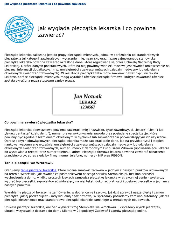 Jak wygląda pieczątka lekarska i co powinna zawierać? Jak wygląda pieczątka lekarska i co powinna zawierać? Pieczątka lekarska zaliczana jest do grupy pieczątek imiennych, jednak w odróżnieniu od standardowych pieczątek z tej kategorii zawierających wyłącznie imię, nazwisko oraz nazwę zajmowanego stanowiska, pieczątka lekarska powinna zawierać określone dane, które regulowane są przez Uchwałę Naczelnej Rady Lekarskiej. Oprócz danych podstawowych, które na niej powinny widnieć, możliwe jest również umieszczenie na pieczęci informacji dodatkowych (np. umiejętności z zakresu węższych dziedzin medycyny lub udzielania określonych świadczeń zdrowotnych). W rezultacie pieczątka taka może zawierać nawet pięć linii tekstu. Lekarze, oprócz pieczątek imiennych, mogą wyrabiać również pieczątki firmowe, których zawartość również została określona przez stosowne zapisy prawa. Co powinna zawierać pieczątka lekarska? Pieczątka lekarska obowiązkowo powinna zawierać: imię i nazwisko, tytuł zawodowy, tj. „lekarz” („lek.”) lub „lekarz dentysta” („lek. dent.”), numer prawa wykonywania zawodu oraz posiadane specjalizacje, które powinny być zgodne z brzmieniem określonym w dyplomie lub zaświadczeniu potwierdzającym ich uzyskanie. Oprócz danych obowiązkowych pieczątka lekarska może zawierać takie dane, jak na przykład tytuł i stopień naukowy, wspomniane wcześniej umiejętności z zakresu węższych dziedzin medycyny lub udzielania określonych świadczeń zdrowotnych, numer umowy z Narodowym Funduszem Zdrowia (upoważniającej lekarza do wystawiania recept) oraz numer telefonu i adres. Pieczątka firmowa lekarza powinna zawierać oznaczenie przedsiębiorcy, adres siedziby firmy, numer telefonu, numery - NIP oraz REGON. Tanie pieczątki we Wrocławiu Oferujemy tanie pieczątki lekarskie, które można zamówić zarówno w jednym z naszych punktów ulokowanych na terenie Wrocławia, jak również za pośrednictwem naszego serwisu Stempleks.pl. Bez konieczności wychodzenia z domu, w kilku prostych krokach zamówisz pieczątkę lekarską w atrakcyjnej cenie - wystarczy wybrać typ pieczątki, zaprojektować widniejący na niej tekst, dokonać płatności i odebrać pieczątkę w jednym z naszych punktów. Wyrabiamy pieczątki lekarzy na zamówienie: w dobrej cenie i szybko. Już dziś sprawdź naszą ofertę i zamów pieczątkę, jakiej potrzebujesz – indywidualną bądź firmową. W sprzedaży posiadamy zarówno automaty, jak też pieczątki kieszonkowe oraz standardowe pieczątki lekarskie zamknięte w metalowych obudowach. Szukasz pieczątki lekarskiej online? Wybierz firmę Stempleks we Wrocławiu. Ekspresowy wyrób pieczątek, ulotek i wizytówek z dostawą do domu Klienta w 24 godziny! Zadzwoń i zamów pieczątkę online. Powered by TCPDF (www.tcpdf.org)