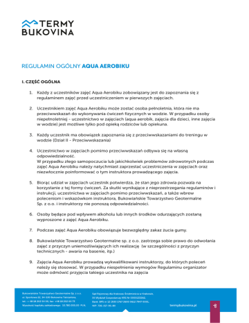 REGULAMIN OGÓLNY AQUA AEROBIKU I. CZĘŚĆ OGÓLNA 1. Każdy z uczestników zajęć Aqua Aerobiku zobowiązany jest do zapoznania się z regulaminem zajęć przed uczestniczeniem w pierwszych zajęciach. 2. Uczestnikiem zajęć Aqua Aerobiku może zostać osoba pełnoletnia, która nie ma przeciwwskazań do wykonywania ćwiczeń fizycznych w wodzie. W przypadku osoby niepełnoletniej - uczestnictwo w zajęciach (aqua aerobik, zajęcia dla dzieci, inne zajęcia w wodzie) jest możliwe tylko pod opieką rodziców lub opiekuna. 3. Każdy uczestnik ma obowiązek zapoznania się z przeciwwskazaniami do treningu w wodzie (Dział II - Przeciwwskazania) 4. Uczestnictwo w zajęciach pomimo przeciwwskazań odbywa się na własną odpowiedzialność. W przypadku złego samopoczucia lub jakichkolwiek problemów zdrowotnych podczas zajęć Aqua Aerobiku należy natychmiast zaprzestać uczestniczenia w zajęciach oraz niezwłocznie poinformować o tym instruktora prowadzącego zajęcia. 5. Biorąc udział w zajęciach uczestnik potwierdza, że stan jego zdrowia pozwala na korzystanie z tej formy ćwiczeń. Za skutki wynikające z nieprzestrzegania regulaminów i instrukcji, uczestnictwa w zajęciach pomimo przeciwwskazań, a także wbrew poleceniom i wskazówkom instruktora, Bukowiańskie Towarzystwo Geotermalne Sp. z o.o. i instruktorzy nie ponoszą odpowiedzialności. 6. Osoby będące pod wpływem alkoholu lub innych środków odurzających zostaną wyproszone z zajęć Aqua Aerobiku. 7. Podczas zajęć Aqua Aerobiku obowiązuje bezwzględny zakaz żucia gumy. 8. Bukowiańskie Towarzystwo Geotermalne sp. z o.o. zastrzega sobie prawo do odwołania zajęć z przyczyn uniemożliwiających ich realizację (w szczególności z przyczyn technicznych - awaria na basenie, itp.) 9. Zajęcia Aqua Aerobiku prowadzą wykwalifikowani instruktorzy, do których poleceń należy się stosować. W przypadku niespełnienia wymogów Regulaminu organizator może odmówić przyjęcia takiego uczestnika na zajęcia II. PRZECIWWSKAZANIAMI DO KORZYSTANIA Z ZAJĘĆ AQUA AEROBIKU SĄ W SZCZEGÓLNOŚCI 1. Choroby układu krążenia np.: niewydolność krążenia migotanie przedsionków, wady serca wrodzone, zakrzepowe zapalenie żył itp. 2. Choroby układu oddechowego np.: zapalenie oskrzeli, zapalenie płuc, rozedma płuc, dychawica oskrzelowa (astma) z częstymi napadami duszności, i inne. 3. Choroby przewodu pokarmowego np.: wrzód żołądka i dwunastnicy, ostry nieżyt żołądka, ostre zapalenie jelit, wirusowe zapalenie wątroby, zapalenie pęcherzyka i dróg żółciowych. 4. Choroby układu dokrewnego np.: nadczynność tarczycy, cukrzyca z powikłaniami, niedoczynność kory nadnerczy. 5. Choroby laryngologiczne np.: uszkodzenie małżowiny i przewodu słuchowego zewnętrznego, ostre zapalenie ucha wewnętrznego, choroby narządu przedsionkowego (błędnika), ostry i przewlekły nieżyt nosa i jam bocznych nosa, zapalenie migdałków podniebiennych. 6. Przeciwwskazania okulistyczne np.: ostre i przewlekłe zapalenie spojówek, zapalenie woreczka łzowego, zapalenie twardówki, odwarstwienie siatkówki. 7. Przeciwwskazania chirurgiczne: ostre zapalne stany narządów jamy brzusznej, stany zapalne skóry, tkanki podskórnej, mięśni, czyraki, ropne zakażenia. 8. Choroby ginekologiczne np.: stany zapalne narządu rodnego, mięśniaki macicy z krwawieniami. 9. Inne jak np.: stany zagrażające udarem mózgu, ostre i przewlekłe zapalenie nerek, choroby reumatyczne w stanie zaostrzenia, choroby krwi o przebiegu ostrym i postępującym, wszelkie choroby przebiegające z podwyższoną temperaturą ciała. Regulamin obowiązuje od dnia 29-01-2015r. Zarząd Bukowiańskiego Towarzystwa Geotermalnego Sp. z o.o