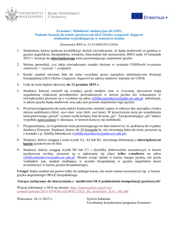 Erasmus+ Mobilność edukacyjna (KA103) Nadanie licencji do testów językowych OLS (Online Linguistic Support) studentom wyjeżdżającym w semestrze letnim (Komunikat BWZ nr 21/15/SMS/2015/2016) 1. Studentom, którzy podczas kwalifikacji złożyli oświadczenie, że będą studiowali za granicą w języku angielskim, hiszpańskim, włoskim, francuskim lub niemieckim, BWZ nada 16 listopada 2015 r. licencje do obowiązkowego testu poziomującego znajomość języka. 2. Można sprawdzić, czy takie oświadczenie zostało złożone w systemie USOSweb (wymiana studencka > wyjazdy > podgląd). 3. Każdy student otrzyma link do testu wysyłany przez narzędzie informatyczne Komisji Europejskiej (OLS-Online Linguistic Support) na adresy mailowe wpisane do USOS. 4. Link do testu będzie aktywny do 12 grudnia 2015 r. 5. Studenci, którym zmienił się wiodący język studiów (tzn. w Learning Agreement mają uzgodnioną większość przedmiotów prowadzonych w innym języku niż wskazanym w oświadczeniu) proszeni są o wysłanie na adres [email protected] informacji, w jakim języku będą studiować oraz jaki jest poziom znajomości tego języka. 6. Przed przystąpieniem do testu należy koniecznie zmienić zapisy w rubryce dot. początku i końca okresu mobilności (Mob. start date oraz Mob. end date). W przeciwnym razie po wypełnieniu testu pierwszego „przed”, system wyśle kolejny link do testu „po”. Test poziomujący „po” należy wypełnić najwcześniej w miesiącu, w którym kończy się mobilność. 7. Przypominamy, że wypełnienie testu poziomującego on-line stanowi m. in. podstawę do wypłaty funduszy Erasmus. Studenci, którzy do 18 listopada br. nie otrzymają linku do testu, proszeni są o kontakt z p. Sybillą Marinkovic ([email protected]). 8. Studenci, którzy osiągną z testu wynik A1, A2 lub B1, otrzymają informację o obowiązkowym kursie językowym on-line. 9. Studenci, którzy osiągną wynik B2 lub C1 i chcieliby dobrowolnie uczestniczyć w kursie językowym on-line, proszeni są o zgłoszenie tej chęci tylko e-mailowo na adres [email protected]. Można wziąć udział w kursie innego języka, niż język wykładów (np. student studiujący w uczelni hiszpańskiej w języku angielskim może uczestniczyć w kursie języka hiszpańskiego). Uwaga! Jeden student ma prawo tylko do jednego kursu, nie może zatem uczestniczyć np. w kursie języka angielskiego ORAZ hiszpańskiego. Gorąco zachęcamy do skorzystania z możliwości OLS podniesienia kompetencji językowych! Więcej informacji o OLS na stronie: http://erasmusplus.org.pl/wpcontent/uploads/2015/10/WSKAZOWKI_OLS_dla_studentow_KA1_HE.pdf Warszawa, 16.11.2015 r. Sylwia Salamon Uczelniany koordynator programu Erasmus+
