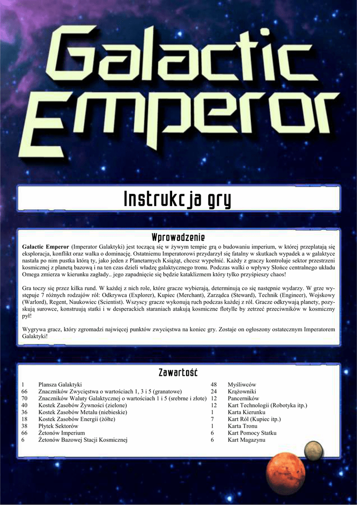 Instrukcja gry Wprowadzenie Galactic Emperor (Imperator Galaktyki) jest toczącą się w Ŝywym tempie grą o budowaniu imperium, w której przeplatają się eksploracja, konflikt oraz walka o dominację. Ostatniemu Imperatorowi przydarzył się fatalny w skutkach wypadek a w galaktyce nastała po nim pustka którą ty, jako jeden z Planetarnych KsiąŜąt, chcesz wypełnić. KaŜdy z graczy kontroluje sektor przestrzeni kosmicznej z planetą bazową i na ten czas dzieli władzę galaktycznego tronu. Podczas walki o wpływy Słońce centralnego układu Omega zmierza w kierunku zagłady.. jego zapadnięcie się będzie kataklizmem który tylko przyśpieszy chaos! Gra toczy się przez kilka rund. W kaŜdej z nich role, które gracze wybierają, determinują co się następnie wydarzy. W grze występuje 7 róŜnych rodzajów ról: Odkrywca (Explorer), Kupiec (Merchant), Zarządca (Steward), Technik (Engineer), Wojskowy (Warlord), Regent, Naukowiec (Scientist). Wszyscy gracze wykonują ruch podczas kaŜdej z ról. Gracze odkrywają planety, pozyskują surowce, konstruują statki i w desperackich staraniach atakują kosmiczne flotylle by zetrzeć przeciwników w kosmiczny pył! Wygrywa gracz, który zgromadzi najwięcej punktów zwycięstwa na koniec gry. Zostaje on ogłoszony ostatecznym Imperatorem Galaktyki! Zawartość 1 66 70 40 36 18 38 66 6 Plansza Galaktyki Znaczników Zwycięstwa o wartościach 1, 3 i 5 (granatowe) Znaczników Waluty Galaktycznej o wartościach 1 i 5 (srebrne i złote) Kostek Zasobów śywności (zielone) Kostek Zasobów Metalu (niebieskie) Kostek Zasobów Energii (Ŝółte) Płytek Sektorów śetonów Imperium śetonów Bazowej Stacji Kosmicznej 48 24 12 12 1 7 1 6 6 Myśliwców KrąŜowniki Pancerników Kart Technologii (Robotyka itp.) Karta Kierunku Kart Ról (Kupiec itp.) Karta Tronu Kart Pomocy Statku Kart Magazynu Przygotowanie Umieść Planszę Galaktyki na środku stołu. KaŜdy z graczy wybiera kolor a następnie zabiera wszystkie statki, kartę pomocy i duŜy Ŝeton Bazowej Stacji Kosmicznej w tym kolorze. Dodatkowo kaŜdy z graczy zabiera odpowiednią liczbę pasujących Ŝetonów Imperium: Gracze śetony Imperium 3 11 4 10 5 9 6 8 OdłóŜ resztę Ŝetonów do pudełka. Strona Ŝetonu w jednolitym kolorze jest nazywana Imperium a strona z symbolem Stacją Kosmiczną. Planetarny sektor jest kontrolowany przez Ciebie jeśli znajduje się na nim twoja Stacja lub Imperium. Wyszukaj sektory bazowe, które odpowiadają kolorem danemu graczowi oraz płytkę Słońca centralnego układu Omega i umieść je na planszy. Rysunki na następnej stronie przedstawiają układ dla 3, 4, 5 i 6 osobowej gry. KaŜdy z graczy umieszcza jednego Myśliwca na Ŝetonie swojej Bazowej Stacji Kosmicznej na płytce z bazowym sektorem. Wyszukaj sektor Czarnej Dziury i go odłóŜ. Posegreguj płytki sektorów na stos płytek zwykłych oraz z symbolem atomu – włączając w to niewykorzystane płytki sektorów bazowych. Wymieszaj płytki w obydwu stosach i odłóŜ je zakryte. PołóŜ zakrytą płytkę Czarnej Dziury na wierzch stosu z płytkami atomów. PołóŜ stos zwykły na wierzch stosu z płytkami atomów a cały powstały stos obok planszy. Na koniec odsłoń po jednej płytce sektora na kaŜdego gracza plus jedną dodatkową (Przykład: Jeśli jest to gra 4 osobowa to odsłoń 5 płytek sektorów). Umieść odsłonięte Karty Technologii obok planszy. Są one dostępne dla kaŜdego gracza do sprawdzenia podczas rozgrywki i mogą zostać nabyte podczas roli Naukowca. Umieść Karty Ról, Znaczniki Waluty, Zasoby oraz Punkty Zwycięstwa na oznaczonych pulach na planszy. Karta roli z Odkrywcą na jednej stronie i z Wojskowym na drugiej rozpoczyna stroną Odkrywcy. Odpowiednia ilość punktów zwycięstwa została podana poniŜej. Umieść znaczniki odkryte aby kaŜdy mógł je sprawdzić a resztę odłóŜ do pudełka. Gracze Punkty Zwycięstwa 3 115 4 130 5 145 6 160 KaŜdy z graczy zabiera z puli 5 jednostek waluty, 1 niebieską kostkę metalu oraz 1 Ŝółtą zasobów energii jako ich początkowa rezerwa. KaŜdy z graczy zabiera kartę Magazynu. Kostki metalu oraz energii naleŜące do danego gracza są zawsze umieszczane na karcie Magazynu. MoŜe ona pomieścić 3 kostki energii oraz 6 kostek metalu. Losowo wybierzcie gracza, który otrzymuje Kartę Tronu. MoŜe to być osoba, która wyrzuciła najwięcej oczek lub przyniosła najlepszą przekąskę. Strona 2 Układy Planszy Galaktyki „P” oznacza bazowy sektor gracza. Centralne „S” to Słońce centralnego sektora Omega. Układ gry 3 osobowej Układ gry 4 osobowej Układ gry 5 osobowej Układ gry 6 osobowej Strona 3 Rundy i Tury Aby rozpocząć Rundę Gracz posiadający Kartę Tronu zabiera kartę Kierunku i wska- Rozpoczęcie Gry. Przydziel losowo kartę Tronu ale tylko podczas pierwszej rundy gry. Przykład W grze 3 osobowej, Gracz 1 posiada kartę Tronu. Ustawia kartę Kierunku zgodnie z ruchem wskazówek zegara. Gracz 1 wybiera rolę Kupca i wykonuje akcję. Następnie pozostali gracze, w porządku zgodnym z ruchem wskazówek zegara, działają zgodnie z zasadami dla roli Kupca. Kolej na Gracza 2 aby wybrał rolę, poniewaŜ jest on obok Gracza 1 patrząc zgodnie z kierunkiem wskazówek zegara. Gracz 2 wybiera Zarządcę i wykonuje akcję. Od jego miejsca pozostali gracze w kierunku zgodnym z ruchem wskazówek zegara wykonują akcje zgodnie z regułami dla roli Zarządcy (Gracz 1 będzie ostatni). Na koniec Gracz 3 wybiera Wojskowego i wykonuje akcję a pozostali gracze w porządku zgodnym z ruchem wskazówek zegara działają zgodnie z zasadami przypisanymi do roli Wojskowego. Runda dobiega końca. PoniewaŜ nikt nie wybrał roli Odkrywcy następna płytka sektora jest odsłaniana. Wybrane role są odkładane z powrotem do puli a kaŜdy otrzymuje 2 jednostki waluty z banku. PoniewaŜ nikt nie wybrał roli Regenta Gracz 1 wciąŜ posiada kartę Tronu. Zatrzymuje kartę Kierunku i obraca ją w wybranym przez si