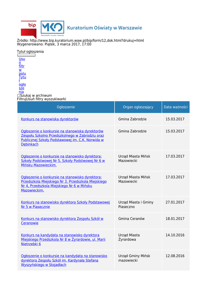 Źródło: http://www.bip.kuratorium.waw.pl/bip/form/12,dok.html?drukuj=html Wygenerowano: Piątek, 3 marca 2017, 17:00 Tytuł ogłoszenia Usu ń filtr w polu Tytu ł ogło sze nia Szukaj w archiwum FiltrujUsuń filtry wyszukiwarki Ogłoszenie Organ ogłaszający Data ważności Konkurs na stanowiska dyrektorów Gmina Zabrodzie 15.03.2017 Ogłoszenie o konkursie na stanowiska dyrektorów Zespołu Szkolno Przedszkolnego w Zabrodziu oraz Publicznej Szkoły Podstawowej im. C.K. Norwida w Dębinkach Gmina Zabrodzie 15.03.2017 Ogłaszenie o konkursie na stanowisko dyrektora: Szkoły Podstwowej Nr 5, Szkoły Podstwowej Nr 6 w Mińsku Mazowieckim. Urząd Miasta Mińsk Mazowiecki 17.03.2017 Ogłaszenie o konkursie na stanowisko dyrektora: Przedszkola Miejskiego Nr 3, Przedszkola Miejskiego Nr 4, Przedszkola Miejskiego Nr 6 w Mińsku Mazowieckim. Urząd Miasta Mińsk Mazowiecki 17.03.2017 Konkurs na stanowisko dyrektora Szkoły Podstawowej Nr 5 w Piasecznie Urząd Miasta i Gminy Piaseczno 27.01.2017 Konkurs na stanowisko dyrektora Zespołu Szkół w Ceranowie Gmina Ceranów 18.01.2017 Konkurs na kandydata na stanowisko dyrektora Miejskiego Przedszkola Nr 8 w Żyrardowie, ul. Marii Nietrzebki 6 Urząd Miasta Żyrardowa 14.10.2016 Ogłoszenie o konkursie na kandydata na stanowisko dyrektora Zespołu Szkół im. Kardynała Stefana Wyszyńskiego w Stojadłach Urząd Gminy Mińsk mazowiecki 12.08.2016 Konkurs na stanowisko Dyrektora Zespołu Szkół Ponadgimnazjalnych w Tarczynie Starostwo Powiatowe w Piasecznie 23.08.2016 Ogłoszenie o konkursie na stanowisko dyrektora Zespołu Szkół Agrotechnicznych w Mińsku Mazowieckim Starostwo Powiatowe w Mińsku Mazowieckim 28.07.2016 wstecz o 5 << poprzednia < 1 2 3 4 5 następna > dalej o 5 >> Archiwum