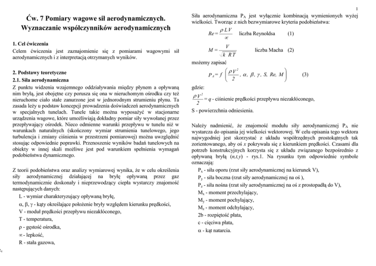 cv 1 Ćw. 7 Pomiary wagowe sił aerodynamicznych. Wyznaczanie współczynników aerodynamicznych 1. Cel ćwiczenia Celem ćwiczenia jest zaznajomienie się z pomiarami wagowymi sił aerodynamicznych i z interpretacją otrzymanych wyników. 2. Podstawy teoretyczne 2.1. Siła aerodynamiczna Z punktu widzenia wzajemnego oddziaływania między płynem a opływaną nim bryłą, jest obojętne czy porusza się ona w nieruchomym ośrodku czy teŜ nieruchome ciało stałe zanurzone jest w jednorodnym strumieniu płynu. Ta zasada leŜy u podstaw koncepcji prowadzenia doświadczeń aerodynamicznych w specjalnych tunelach. Tunele takie moŜna wyposaŜyć w stacjonarne urządzenia wagowe, które umoŜliwiają dokładny pomiar siły wywołanej przez przepływający ośrodek. Nieco odmienne warunki przepływu w tunelu niŜ w warunkach naturalnych (skończony wymiar strumienia tunelowego, jego turbulencja i zmiany ciśnienia w przestrzeni pomiarowej) moŜna uwzględnić stosując odpowiednie poprawki. Przenoszenie wyników badań tunelowych na obiekty w innej skali moŜliwe jest pod warunkiem spełnienia wymagań podobieństwa dynamicznego. Z teorii podobieństwa oraz analizy wymiarowej wynika, Ŝe w celu określenia siły aerodynamicznej działającej na bryłę opływaną przez gaz termodynamicznie doskonały i nieprzewodzący ciepła wystarczy znajomość następujących danych: L - wymiar charakteryzujący opływaną bryłę, α, β, γ - kąty określające połoŜenie bryły względem kierunku prędkości, V - moduł prędkości przepływu niezakłóconego, T - temperatura, ρ - gęstość ośrodka, µ - lepkość, R - stała gazowa, Siła aerodynamiczna PA jest wyłącznie kombinacją wymienionych wyŜej wielkości. Tworząc z nich bezwymiarowe kryteria podobieństwa: Re = ρ LV µ V k RT moŜemy zapisać M= liczba Reynoldsa (1) liczba Macha (2) ρV2 = f , α , β , γ , S, Re, M PA 2 (3) gdzie: ρV2 = q - ciśnienie prędkości przepływu niezakłóconego, 2 S - powierzchnia odniesienia. NaleŜy nadmienić, Ŝe znajomość modułu siły aerodynamicznej PA nie wystarcza do opisania jej wielkości wektorowej. W celu opisania tego wektora najwygodniej jest skorzystać z układu współrzędnych prostokątnych tak zorientowanego, aby oś x pokrywała się z kierunkiem prędkości. Czasami dla potrzeb konstrukcyjnych korzysta się z układu związanego bezpośrednio z opływaną bryłą (n,t,y) - rys.1. Na rysunku tym odpowiednie symbole oznaczają: Px - siła oporu (rzut siły aerodynamicznej na kierunek V), Py - siła boczna (rzut siły aerodynamicznej na oś ), Pz - siła nośna (rzut siły aerodynamicznej na oś z prostopadłą do V), Mx - moment przechylający, My - moment pochylający, Mz - moment odchylający, 2b - rozpiętość płata, c - cięciwa płata, α - kąt natarcia. 2 Jeśli badana bryła ma płaszczyznę symetrii, to układ współrzędnych moŜna tak usytuować, Ŝeby C y = C m x = C m z = 0 (płaszczyzną symetrii jest wtedy zx). Taki przypadek ma podstawowe znaczenie w badaniach dla potrzeb mechaniki lotu. Współczynniki aerodynamiczne, dla ustalonych wartości liczb Re i M, zaleŜą tylko od kąta natarcia α (kąt między wektorem prędkości i cięciwą). ZaleŜności te nazywamy charakterystykami aerodynamicznymi płata lub, dla przepływu płaskiego - charakterystykami aerodynamicznymi profilu. Wartość współczynnika momentu Cm zaleŜy od punktu (lub osi), względem którego moment określono. Przeliczenie współczynnika momentu Cmo (określonego względem osi y przechodzącej przez punkt 0 związany z wagą aerodynamiczną) na współczynnik momentu Cmo1 (względem osi y1 przechodzącej przez punkt 01 związany z badanym modelem) dokonuje się następująco (rys. 2): M 1 = M o - P z x1 - P x z1 , (5) Rys.1 Składowe sił i momenty aerodynamiczne w układ współrzędnych związanym z modelem gdzie: z1 = no cos γ + t o sin γ , x1 = t o cos γ - n o sin γ . 2.2. Współczynniki aerodynamiczne Siłę aerodynamiczną opisuje się bezwymiarowymi współczynnikami sił i momentów. Są one zdefiniowane następująco: Cx= Px ρV2 2 , Cy= S Py ρV2 2 , Cz = S Pz ρV2 2 , S (4) Cm x = My Mx . , Cm y = , C m z = M2 z 2 2 ρV ρV ρV Sc Sc Sc 2 2 2 Rys. 2 Układ współrzędnych związany z wagą 3 Stąd po przekształceniach M 1 = M o - t o ( P z cos γ + P x sin γ ) - n o ( P x cos γ - P z sin γ ) . Przechodząc zgodnie z definicją (4) do postaci bezwymiarowej otrzymamy To ( cos γ + n o ( cos γ Cm1= Cm o Cz Cx sin γ ) Cx Cz sin γ ) . (6) c c Wykorzystując zaleŜność (6) moŜna wyznaczyć na modelu pewne charakterystyczne punkty: są to środek parcia i środek aerodynamiczny. 2.3. Środek parcia tp ( α ) będzie miała wtedy dwie asymptoty, jedną, gdy Cz = c D t 0 a drugą dla wartości p = C m o . Udowodnić to moŜna przekształcając c d Cz wzór (8) (rys. 3) d Cm o (α - α o) C m oαo + d Cm o Cm o α o tp d α = = + (9) d Cz c d Cz C z (α - α o) dα gdzie α o oznacza kąt, dla którego C z = 0 . Charakterystyka Jest to punkt przecięcia cięciwy modelu z wypadkową siłą aerodynamiczną, tzn. punkt na cięciwie, względem którego moment aerodynamiczny jest równy zeru. Dla modelu płata wygodnie jest tak dobrać punkt „0” (oś wagi) aby leŜał on na cięciwie a kierunek osi „t” tak, aby pokrywał się z nią. W takim przypadku γ=α, no=0. Równanie (6) dla środka parcia (M=0), przyjmuje postać (porównaj rys. 2): 0 = Cm o - Tp (Cz cos α + Cx sin α ) , c stąd tp Cm o (7) = , c Cz cos α + Cx sin α gdzie tp jest odległością od punktu „0” do środka parcia. Zmiany wielkości tp/c w zaleŜności od kąta α są jedną z charakterystyk płata zwaną wędrówką środka parcia. Dla umiarkowanych kątów natarcia tzn. gdy dopuszczalne jest załoŜenie, Ŝe cosα ≈ 1 oraz sinα ≈ 0, połoŜenie środka parcia w uproszczeniu moŜna wyznaczyć z zaleŜności t p Cm o = . c Cz (8) Charakterystyki Cz(α) i Cmo(α) dla większości spo
