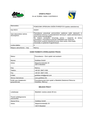 OFERTA PRACY Nr ref. EURES: 10000-1122378303-S Stanowisko: POMOCNIK OPIEKUNA OSÓB STARSZYCH (opieka całodzienna) Kod ISCO: 532201 Opis stanowiska/ zakres obowiązków: Pracodawca poszukuje pomocników opiekuna osób starszych w charakterze pomocy w gospodarstwie domowym, opieki podstawowej w domu osoby potrzebującej. Na miejscu kandydaci otrzymają pomoc i wsparcie ze strony pracodawcy. Pracodawca pracuje w Bielefeld oraz okolicach. Stanowisko zostanie obsadzone przez dwie osoby, które będą pracowały w systemie 8 tygodniowym. Liczba etatów: 5 Miejsce zatrudnienia – kraj: Niemcy DANE PODMIOTU OFERUJĄCEGO PRACĘ Status: Pracodawca – Dom opieki nad osobami Nazwa: Goldklee GmbH Adres: Stapenhorststraße 34 33615 Bielefeld Kraj: Niemcy Telefon: +49 521 3847 4180 Fax: +49 521 3847 4183 E-Mail: [email protected] Strona internetowa: www.goldklee.info Krótki opis działalności gospodarczej: Pracodawcą jest dom opieki w Bielefeld (Nadrenia Północna Westfalia, Niemcy) MIEJSCE PRACY Lokalizacja: Bielefeld i okolice (około 50 km) Powód oddelegowania pracownika: Nazwa firmy: Goldklee GmbH Adres: Stapenhorststraße 34 33615 Bielefeld Kraj: Niemcy WYMAGANIA Wykształcenie: Pracodawca nie wskazał wymagań w tym zakresie. Doświadczenie zawodowe: Mile widziane doświadczenie w opiece nad osobami oraz w prowadzeniu gospodarstwa domowego. Znajomość języków: 1. niemiecki 1. komunikatywny (minimum: rozumienie poleceń pracodawcy oraz umiejętność prowadzenia prostych rozmów) Uprawnienia/ dyplomy/ dokumenty (np. prawo jazdy): Osoby, które nie znają języka niemieckiego w stopniu wystarczającym, a spełniają inne merytoryczne warunki oferty mogą również wziąć udział w rekrutacji. Pracodawca ma możliwość zaoferowania wybranym kandydatom kurs języka niemieckiego na miejscu (w Niemczech). 1. Kandydaci muszą osobowościowo nadawać się do pracy z osobami starszymi; muszą wykazywać się cierpliwością, uwagą oraz czerpać satysfakcję z pracy dla innych osób. 2. Warunkiem koniecznym jest, aby kandydaci, którzy nie znają języka niemieckiego w stopniu wystarczającym, wykazywali wolę do szybkiej jego nauki z pomocą pracodawcy (kursy audio języka niemieckiego). W przeciwnym wypadku praca nie zostanie zaoferowana. Inne istotne wymagania: Dodatkowe informacje: WYNAGRODZENIE I WARUNKI ZATRUDNIENIA Wysokość pensji brutto: 1450 Waluta, w jakiej wypłacana jest pensja: 1070 Rodzaj stawki wynagrodzenia: Euro Premie: Dodatkowe świadczenia Mieszkanie oferowane u rodzin osób wymagających opieki. Pracodawca oferuje umowę o pracę wraz z ubezpieczeniem społecznym. Pracodawca zwraca do 150 euro za koszty podróży. Nazwa firmy, z którą zostanie podpisana umowa: Goldklee GmbH Rodzaj umowy: Umowa o pracę Wymiar czasu pracy (praca na pełen etat/ część etatu): Pełny etat Czas trwania umowy: 2 miesiące (zgodnie z informacjami (nieokreślony/ określony) nieokreślony powyżej) Liczba godzin tygodniowo: 35 godzin tygodniowo + dyżur pod telefonem w przypadku zapotrzebowania Zmiany i praca w dni wolne: nie Data rozpoczęcia: Koniec stycznia lub później SPOSÓB SKŁADANIA WNIOSKU Wymagane dokumenty (list motywacyjny, CV itp.): CV wraz ze zdjęciem, danymi kontaktowymi (adres, telefon, e-mail, ewentualnie użytkownik skype (w przypadku, gdy kandydat posiada) Język, w którym muszą być sporządzone przedkładane dokumenty: Niemiecki lub angielski Do kogo należy wysłać dokumenty: (do pracodawcy/ doradcy EURES) Goldklee GmbH Gdzie należy wysłać dokumenty: (adres, adres e-mail, nr faksu z kodem kraju itp.) na adres e-mail pracodawcy niemieckiego [email protected] lub na adres pocztowy pracodawcy niemieckiego: Goldklee GmbH Stapenhorststraße 34 33615 Bielefeld Deutschland oraz w kopii do doradcy EURES w Wojewódzkim Urzędzie Pracy w Katowicach na adres e-mail: [email protected] Goldklee GmbH Ersan Agar Stapenhorststraße 34 33615 Bielefeld Tel: +49 521 38474180 skype: Gold Klee Dane teleadresowe doradcy EURES lub przedstawiciela pracodawcy: (nazwisko, adres, telefon, fax, e-mail itp.) doradca EURES WUP w Katowicach Małgorzata Gościniak [email protected] DODATKOWE INFORMACJE Po otrzymaniu aplikacji od kandydatów, pracodawca skontaktuje się telefonicznie wyłącznie z wybranymi kandydatami. W przypadku, gdy w procesie rekrutacji zgłoszą się kandydaci spełniający merytoryczne warunki oferty oraz znający język niemiecki, będą oni mieli największe szanse na kontakt ze strony pracodawcy. W CV proszę wskazać, w jakim języku możliwy jest kontakt z kandydatem: niemiecki, angielsku lub w wyjątkowych wypadkach polski. WAŻNOŚĆ Data publikacji: 30.01.2015 r. Termin przedkładania podań o pracę / zakończenia ważności oferty: Do odwołania Uprzejmie informujemy, że skontaktujemy się wyłącznie z wybranymi kandydatami. UWAGA: Umowa z zagranicznym pracodawcą zostanie zawarta zgodnie z prawem kraju zatrudnienia. Oznacza to, że wszystkie roszczenia odnośnie do warunków, które obejmuje umowa, można kierować wyłącznie do odpowiedniego sądu w kraju zatrudnienia. Publiczne służby zatrudnienia (EURES) nie mogą pośredniczyć ani reprezentować pracownika w sądzie kraju zatrudnienia w przypadku sporu z pracodawcą. Publiczne służby zatrudnienia (EURES) dokładają wszelkich starań, aby zapewnić rzetelność i wiarygodność ofert pracy zgłoszonych w lokalnym urzędzie pracy. Należy wyjaśnić, że oferta pracy została zgłoszona przez stronę trzecią i EURES nie odpowiada za ewentualne rozbieżności między warunkami pracy określonymi w ofercie pracy i warunkami oferowanymi przez potencjalnego pracodawcę. Publiczne służby zatrudnienia (EURES) informują, że będą zbierać, przetwarzać i przekazywać potencjalnym pracodawcom zgodnie z przepisami dotyczącymi ochrony danych osobowych wszystkie dane osobowe dostarczone przez osoby poszukujące pracy.