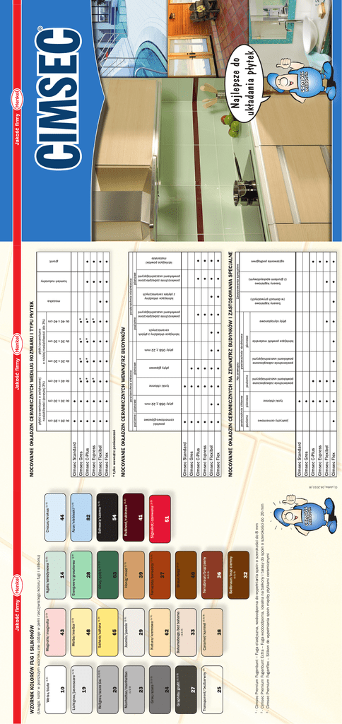 3 2 1 Evergreen/groszkowa (1/3) Melba/melba (1/3) Lichtgrau/jasnoszara (1/3) 63 65 JJasmin/jasmin i /j i (1/3) 20 Manhattan/manhattan 62 Bahamabeige/beż bahama 24 Graphite/grafit (1/2/3) Caramel/karmel (1/2/3) 38 Transparent/bezbarwny (3) 25 32 (1/2/3) Balibraun/brąz ciemny 36 (1/2/3) Terrabraun/brąz jasny 40 Braun/brąz (1/3) 51 Signalrot/czerwona (1/3) 41 Rubinrot/rubinowa (1/3) 54 Schwarz/czarna (1/3) 82 Azur/niebieski (1/3) 44 - Cimsec Premium Fugenbunt – Fuga elastyczna, wodoodporna do wy w wypełniania pełnia ania i spoin oin o szerokoś szerokości do 8 mm - Cimsec Premium Fugenbunt Extra – Fuga wodoodporna, idealna na balkony i tarasy do spoin o szerokości do 20 mm - Cimsec Premium Fugenflex – Silikon do wypełniania spoin między płytkami ceramicznymi 33 27 (1/2/3) Terracota/terracota (1/2/3) Natura/kremowa (1/3) Grau/szara (1/2/3) 37 39 29 23 Honig/miód (1/3) Olive/zieleń (1/2/3) Sahara/sahara (1/3) Hellgrau/szara św. (1/2/3) (1/2/3) 28 48 19 14 43 10 ● ● ● ● ● ● ● ● ● ● ● ● ●* ●* ●* ● ● płytki ceramiczne o niskiej nasiąkliwości (do 3%) ●* ●* ● ● ● ●* ●* ● ● ● ● ● ● ● ● ● ● ● ● ● ● ● ● ● ● ● ● ● ● ● ● poziome ● ● ●* ●* ●* ● ● ● ● ● ● ● ● ● ● ● ● ● ● ● ● ● ● ● ● powierzchnie niechłonne pionowe ● ● ● ● ● ● Cimsec Standard Cimsec Gres Cimsec C-Plus Cimsec Express Cimsec Flexibel Cimsec Flex ● ● ● ● ● ● ● ● ● ● ● poziome pionowe ● pionowe Na zewnątrz powierzchnie niechłonne poziome powierzchnie chłonne ● ● ● Zastosowania specjalne MOCOWANIE OKŁADZIN CERAMICZNYCH NA ZEWNĄTRZ BUDYNKÓW I ZASTOSOWANIA SPECJALNE Cimsec Standard Cimsec Gres Cimsec C-Plus Cimsec Express Cimsec Flexibel Cimsec Flex powierzchnie chłonne poziome i pionowe pionowe MOCOWANIE OKŁADZIN CERAMICZNYCH WEWNĄTRZ BUDYNKÓW * tylko wewnątrz pomieszczeń Cimsec Standard Cimsec Gres Cimsec C-Plus Cimsec Express Cimsec Flexibel Cimsec Flex do 20 x 20 cm powłoki cementowo-gipsowe jastrychy cementowe Crocus/krokus do 30 x 30 cm płyty OSB > 22 mm Agais/seledynowa do 40 x 40 cm tynki chłonne Magnolie/magnolia tynki chłonne powierzchnie zabezpieczone powłokami uszczelniającymi Weiss/biała płytki ceramiczne o zwiększonej nasiąkliwości (powyżej 3%) do 20 x 20 cm powierzchnie zabezpieczone powłokami uszczelniającymi (1/3) do 30 x 30 cm istniejące powłoki malarskie (1/3) płyty gipsowe do 40 x 40 cm płyty styropianowe (1/3) powierzchnie zabezpieczone powłokami uszczelniającymi (1/3) MOCOWANIE OKŁADZIN CERAMICZNYCH WEDŁUG ROZMIARU I TYPU PŁYTEK ● baseny kąpielowe (w domach prywatnych) WZORNIK KOLORÓW FUG I SILIKONÓW płyty OSB > 22 mm kamień naturalny powierzchnie zabezpieczone powłokami uszczelniającymi ● ● baseny kąpielowe (z gruntem epoksydowym) (Uwaga: kolor w poniższym wzorniku nie oddaje w pełni rzeczywistego koloru fugi i silikonu) istniejące okładziny z płytek ceramicznych mozaika istniejące okładziny z płytek ceramicznych granit istniejące powłoki malarskie ● ● ● ● ogrzewania podłogowe CI_ulotka_04.2010_W Najlepsze do układania płytek ZAPRAWY KLEJĄCE na ściany i posadzki łatwa w aplikacji do wnętrz i na zewnątrz mrozo- i wodoodporna • łatwa w stosowaniu • wodo- i mrozoodporna do płytek gresowych na ogrzewania podłogowe łatwa w aplikacji wydłużony czas otwarty schnięcia • wysoka wydajność • do wnętrz i na zewnątrz • mrozo- i wodoodporna spoinowanie płytek już po 6 godzinach stabilna na powierzchniach pionowych umożliwia szybki postęp prac do płytek gresowych na balkony i tarasy na płyty gipsowo-kartonowe łatwa w aplikacji również do płytek gresowych • • • • • • • • doskonała przyczepność wysoka wydajność do wnętrz i na zewnątrz mrozo- i wodoodporna na ogrzewania podłogowe łatwa w stosowaniu ekonomiczna w użyciu wodo- i mrozoodporna • • • • • na podłoża odkształcalne i krytyczne na balkony i tarasy łatwa w aplikacji wydłużony czas otwarty schnięcia możliwość dostosowania konsystencji do potrzeb • doskonała przyczepność • wysoka wydajność • polecana do płytek o bardzo dużych rozmiarach powyżej 60 x 60 cm • do wnętrz i na zewnątrz • mrozo- i wodoodporna Wysokoelastyczna zaprawa klejąca Cimsec Flex • • • • Elastyczna zaprawa klejąca Cimsec Flexibel • • • • Szybko twardniejąca zaprawa klejąca do płytek gresowych Cimsec Express • • • • Elastyczna zaprawa klejąca do płytek gresowych Cimsec C-Plus • wysoka przyczepność • do gresu szkliwionego i technicznego Zaprawa klejąca do gresu Cimsec Gres • • • • Zaprawa klejąca do płytek ceramicznych FUGI I SILIKONY WYKONYWANIE POSADZEK Cimsec Standard • elastyczna, na ogrzewane podłogi • łazienki, kuchnie, balkony i tarasy • wyjątkowo trwały kolor • do wnętrz i na zewnątrz • na podłoża odkształcalne • zwiększona odporność mechaniczna i chemiczna • zawiera tras – eliminuje wykwity • tarasy, balkony, korytarze, baseny • do wnętrz i na zewnątrz • dostępny w kolorach identycznych jak kolory spoiny Cimsec • trwale elastyczny i wodoodporny • odporny na wysoką temperaturę wodoszczelna elastyczna zapewniająca trwałe połączenie wytrzymała na rozciąganie nie ulegająca procesom starzenia odporna na ozon i UV do wnętrz i na zewnątrz wzmacnia powierzchniowo podłoże zmniejsza nasiąkliwość podłoża paroprzepuszczalny gotowy do użycia nie zawiera rozpuszczalników do wnętrz i na zewnątrz • do każdego typu wykładzin • może być wylewana maszynowo • odporna na obciążenia skupione • łatwa w stosowaniu • nadająca się na konstrukcje z ogrzewaniem podłogowym • • • • zapewnia bardzo wysoką przyczepność do podłoży nasiąkliwych i nienasiąkliwych do podłoży krytycznych szybkoschnący Grunt specjalny – kon
