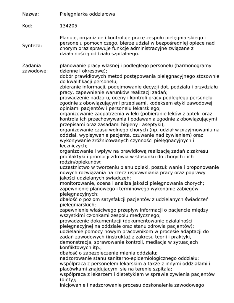 Nazwa: Pielęgniarka oddziałowa Kod: 134205 Synteza: Planuje