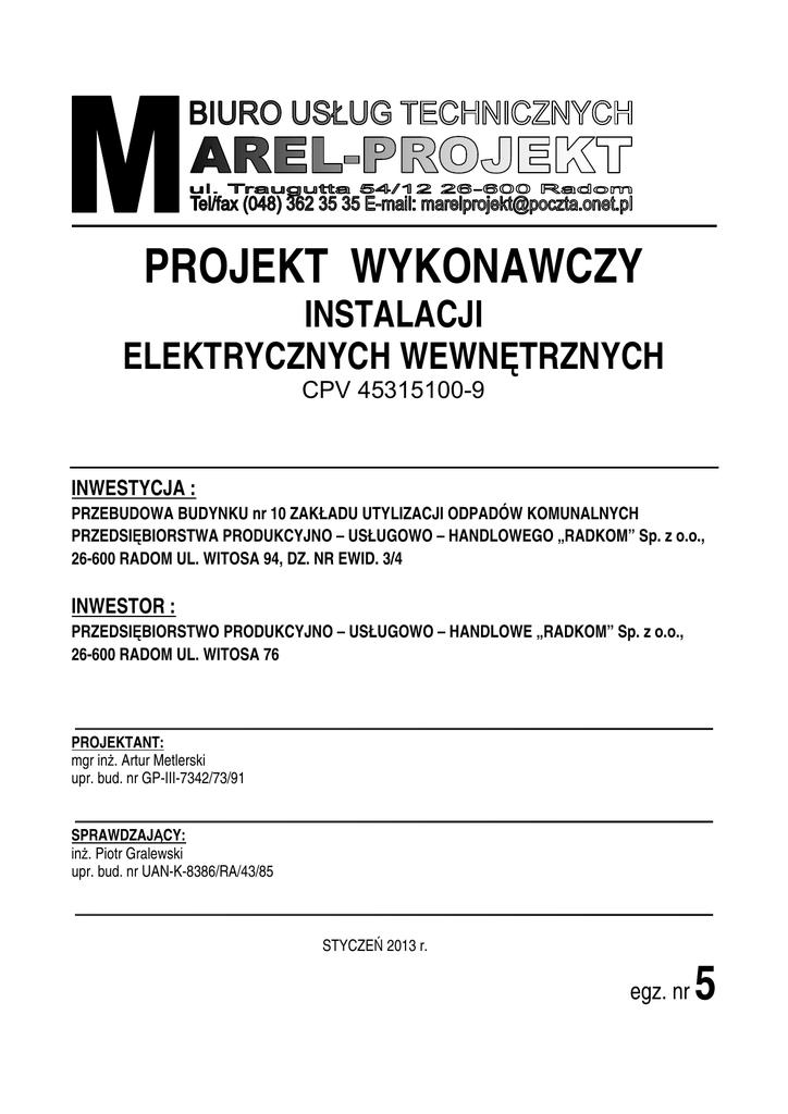 PROJEKT WYKONAWCZY INSTALACJI ELEKTRYCZNYCH WEWNĘTRZNYCH CPV 45315100-9 INWESTYCJA : PRZEBUDOWA BUDYNKU nr 10 ZAKŁADU UTYLIZACJI ODPADÓW KOMUNALNYCH PRZEDSIĘBIORSTWA PRODUKCYJNO – USŁUGOWO – HANDLOWEGO „RADKOM” Sp. z o.o., 26-600 RADOM UL. WITOSA 94, DZ. NR EWID. 3/4 INWESTOR : PRZEDSIĘBIORSTWO PRODUKCYJNO – USŁUGOWO – HANDLOWE „RADKOM” Sp. z o.o., 26-600 RADOM UL. WITOSA 76 PROJEKTANT: mgr inż. Artur Metlerski upr. bud. nr GP-III-7342/73/91 SPRAWDZAJĄCY: inż. Piotr Gralewski upr. bud. nr UAN-K-8386/RA/43/85 STYCZEŃ 2013 r. egz. nr 5 MAREL-PROJEKT s.c. Biuro Usług Technicznych, 26-600 Radom ul. Traugutta 54/12, tel/fax 0-48-362-35-35, [email protected] OŚWIADCZENIE Zgodnie z art.20 ust.4 - Prawa Budowlanego (Dz.U. 207/2003 poz. 2016 z późniejszymi zmianami) oświadczamy jako projektant / sprawdzający , że projekt wykonawczy instalacji elektrycznych: „Przebudowa budynku nr 10 Zakładu Utylizacji Odpadów Komunalnych Przedsiębiorstwa Produkcyjno – Usługowo – Handlowego „RADKOM” sp. z o.o., 26-600 Radom ul. Witosa 94, dz. nr ewid. 3/4" dla Inwestora : Przedsiębiorstwo Produkcyjno - Usługowo - Handlowe „RADKOM” sp. z o.o. , 26-600 Radom ul. Witosa 76 sporządzono zgodnie z obowiązującymi przepisami oraz zasadami wiedzy technicznej. PROJEKTANT INST. ELEKTRYCZNYCH: mgr inż. Artur Metlerski upr. bud. nr GP-III-7342/73/91 SPRAWDZAJĄCY INST. ELEKTRYCZNYCH: mgr inż. Piotr Gralewski upr. bud. nr UAN-II-K-8386/43/85 str. 2 MAREL-PROJEKT s.c. Biuro Usług Technicznych, 26-600 Radom ul. Traugutta 54/12, tel/fax 0-48-362-35-35, [email protected] ZAWARTOŚĆ PROJEKTU: I . Opis techniczny II. Obliczenia III. Załączniki IV. Rysunki: E1. Instalacje elektryczne wewnętrzne - rzut parteru E2. Instalacje elektryczne wewnętrzne - rzut I piętra E3. Instalacje elektryczne - rzut dachu E4. Tablica TOS4- przebudowa, E5. Tablica – T4, E6. Tablica – RZW. E7. Schemat okablowania strukturalnego 1:50, 1:50, 1:50, str. 3 MAREL-PROJEKT s.c. Biuro Usług Technicznych, 26-600 Radom ul. Traugutta 54/12, tel/fax 0-48-362-35-35, [email protected] I. OPIS TECHNICZNY INSTALACJI ELEKTRYCZNYCH 1. Przedmiot opracowania: Przedmiotem opracowania jest Projekt Budowlany instalacji elektrycznych wewnętrznych w projektowanej części Budynku nr 10 2. Podstawa opracowania: - umowa z Inwestorem, - koncepcja uzgodniona z Inwestorem, - projekt architektoniczny, - projekt instalacji sanitarnych, - warunki techniczne, jakim powinny odpowiadać budynki i ich usytuowanie, - przepisy dotyczące zakresu opracowania oraz normy elektryczne. 3. Dane techniczne. Istniejąca moc przyłączeniowa nie uległa zmianie i pokrywa zapotrzebowania dla przebudowy budynku, w związku z tym nie ma potrzeby o wystąpienie do Zakładu Energetycznego o zmianę mocy. Dane dla przebudowywanej części Budynku nr 10 Układ sieciowy - TN - S Napięcie zasilania - 3 x 400/230 V Moc szczytowa rozbudowa - 40,8 kW Prąd szczytowy rozbudowa - 63,3 A Moc szczytowa podgrzewacz wody - 18,0 kW Prąd szczytowy podgrzewacz wody - 28,0 A Dodatkowy system ochrony przy uszkodzeniu - samoczynne wyłączanie zasilania. 4. Zakres opracowania: Projekt swym zakresem obejmuje następujące instalacje: - tablice elektryczne i wewnętrzne linie zasilające – wlz-ty - oświetlenia podstawowego, - oświetlenia awaryjno - ewakuacyjnego, - gniazd wtyczkowych i odbiorów 230V, - gniazd wtyczkowych dla komputerów 230V, - zasilania wentylacji i klimatyzacji , - okablowania strukturalnego - przeciwporażeniową i wyrównawczą, - przeciwprzepięciową. - demontaż istniejących instalacji elektrycznych. str. 4 MAREL-PROJEKT s.c. Biuro Usług Technicznych, 26-600 Radom ul. Traugutta 54/12, tel/fax 0-48-362-35-35, [email protected] 5. Zasilanie. Zasilanie w postaci linii kablowej ze stacji transformatorowej do istniejącego złącza 11ZK przy budynku nr 11 pozostaje bez zmian. Stanowi je istniejący kabel YAKY 4x240mm2 z zabezpieczeniami 250A w stacji. Rozbudowana powierzchnia biurowo - socjalna usytuowana na piętrze budynku nr 10 zasilana będzie z istniejącej tablicy TOS4 po jej rozbudowie. W związku ze wzrostem zapotrzebowanej mocy wymiany wymaga kabel zasilający tablice TOS4 od istniejącego złącza 11ZK do tablicy. Projektuje się wymianę istniejącego kabla YKY 5x 16 mm2 na kabel YKYżo 5x 70mm2 ułożony po trasie demontowanego na istniejących korytach kablowych biegnących wzdłuż ściany zewnętrznej budynku B11 a następnie w budynku B10. W złączu należy wymienić wkładki bezpiecznikowe projektowanego WLZ-tu do tablicy TOS4 na 125A. Istniejący Główny Wyłącznik Pożarowy dla budynku B10 pozostaje bez zmian. 6. Tablice elektryczne WLZ-ty. W klatce schodowej na piętrze znajduje się istniejąca tablica TOS4 zasilająca istniejące pomieszczenia biurowo – socjalne po lewej stronie klatki schodowej. Tablicę wykonano jako naścienną , firmy Hager (8x12mod.) IP 43. Projektuje się rozbudowę tablicy TOS4 poprzez: - wymianę wyłącznika głównego na FRX304 – 125A - zabudowę nowych rozłączników izolacyjnych z bezpiecznikami -80 A dla projektowanej tablicy T4 - zabudowę zabezpieczenia różnicowo-prądowe i nadmiarowych nowych obwodów oświetleniowych W korytarzu na piętrze projektuje się tablicę T4 dla zasilania odbiorów / oprócz oświetlenia/ na projektowanej powierzchni. Tablicę T4 zasilić z TOS4 kablem YKYżo 5x35 mm2. Tablicę należy wykonać jako wnękową, typu XL 160 (6x24) IP 43. W tablicy zabudować wyłącznik główny typu FR303-100A, zabezpieczenie przeciwprzepięciowe typu 2, zabezpieczenia nadmiarowe i różnicowo-prądowe poszczególnych obwodów. W celu zasilania projektowanego zasobnika ciepłej wody przewidziano nową rozdzielnię RZC usytuowaną na parterze obok projektowanego zasobnika. Projektowaną rozdzielnię RZC zasilić kablem YKYżo 5x10mm2 z pobliskiej tablicy TOS3 po zabudowie nowych rozłączników izolacyjnych z bezpiecznikami R 303-40 A. Z rozdzielni RZC zasili