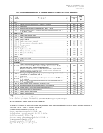 Załącznik nr 3 do Zarządzenia Nr 23/2016 Dyrektora PGK Sp.z o.o. w Koszalinie z dnia 23.05.2016 r. Ceny na odpady odpłatnie odbierane od podmiotów gospodarczych w PSZOK i MSZOK w Koszalinie Lp. 1 I Kod odpadu Rodzaj odpadu jm Cena netto (zł) Cena brutto (zł) 2 3 4 5 6 GRUZ 1 17 01 01 Odpady betonu oraz gruz betonowy z rozbiórek i remontów kg 0,06 0,06 2 17 01 02 Gruz ceglany kg 0,06 0,06 kg 2,00 2,16 kg 0,21 0,23 3 4 II 17 06 04 Materiały izolacyjne inne niż wymienione w 17 06 01 i 17 06 03 Zmieszane odpady z budowy, remontów i demontażu inne niż wymienione w 17 09 17 09 04 01, 17 09 02 i 17 09 03 MAKULATURA 5 15 01 01 Opakowania z papieru i tektury kg 0,12 0,13 6 20 01 01 Papier i tektura (makulatura gazetowa) kg 0,12 0,13 III TWORZYWA SZTUCZNE 7 15 01 02 Opakowania z tworzyw sztucznych kg 1,00 1,08 8 16 01 19 Tworzywa sztuczne (z demontażu pojazdów) kg 2,00 2,16 9 20 01 39 Tworzywa sztuczne kg 1,00 1,08 IV STŁUCZKA SZKLANA 10 15 01 07 Opakowania ze szkła kg 1,00 1,08 11 16 01 20 Szkło (z demontażu pojazdów) kg 1,00 1,08 12 17 02 02 Szkło (szkło budowlane) kg 0,20 0,22 13 20 01 02 Szkło kg 1,00 1,08 V ZŁOM 14 15 01 04 Opakowania z metali kg 1,00 1,08 15 20 01 40 Metale kg 1,00 1,08 kg 3,00 3,24 kg 2,00 2,16 kg 1,80 1,94 VI 16 17 18 19 20 21 POZOSTAŁE Opakowania zawierające pozostałości substancji niebezpiecznych lub nimi 15 01 10* zanieczyszczone (np. środkami ochrony roślin I i II klasy toksyczności - bardzo toksyczne i toksyczne) - puszki po farbach i areozolach Sorbenty, materiały filtracyjne (w tym filtry olejowe nieujęte w innych grupach), 15 02 02* tkaniny do wycierania (np. szmaty, ścierki) i ubrania ochronne zanieczyszczone substancjami niebezpiecznymi (np. PCB) Sorbenty, materiały filtracyjne, tkaniny do wycierania (np. szmaty, ścierki) i ubrania 15 02 03 ochronne inne niż wymienione w 15 02 02 16 01 03 Zużyte opony Zużyte urządzenia zawierające niebezpieczne elementy inne niż wymienione w 16 02 09 do 16 02 12 - świetlówki Zużyte urządzenia zawierające niebezpieczne elementy inne niż wymienione w 16 02 09 do 16 16 02 13* 02 12 - sprzęt RTV i AGD 16 02 13* kg 0,35 0,38 kg 10,00 10,80 kg 0,50 0,54 22 16 02 14 Zużyte urządzenia inne niż wymienione w 16 02 09 do 16 02 13 kg 2,00 2,16 23 16 02 15* Niebezpieczne elementy lub części składowe usunięte z zużytych urządzeń kg 4,00 4,32 24 16 02 16 Elementy usunięte z zużytych urządzeń inne niż wymienione w 16 02 15 kg 2,00 2,16 25 16 80 01 Magnetyczne i optyczne nośniki informacji kg 2,00 2,16 26 20 02 01 Odpady ulegające biodegradacji kg 1,00 1,08 27 20 03 07 Odpady wielkogabarytowe kg 0,50 0,54 Uwagi: poz. 19 - opony z samochodu osobowego lub mniejsze poz. 21 - sprzęt musi być kompletny, zdekompletowany sprzęt będzie klasyfikowany pod innym kodem odpadu Do wyżej wymienionych odpadów stosuje się VAT w wysokości 8 % W PSZOK i MSZOK stosuje się ograniczenia dotyczące ilości odbieranego odpadu (maksymalna dzienna ilość przyjętych odpadów od jednego kontrahenta), tj: 1) gruz (kod 17 01 01, 17 01 02, 17 09 04) do 1 Mg (ok. 1 m 3) 2) odpady wielkogabarytowe (kod 20 03 07) do 2 m 3 3) opony z samochodu osobowego (kod 16 01 03) do 5 sztuk 4) stłuczka szklana - z demontażu samochodów (kod 16 01 20) do 50 kg 5) szkło budowlane (kod 17 02 02) do 50 kg 6) tworzywa sztuczne - z demontażu samochodów (kod 16 01 19) do 1 m 3 7) odpady ulegające biodegradacji do 0,5 m3 8) materiały izolacyjne (kod 17 06 04) do 0,5 m 3 9) pozostałe odpady przyjmowane są bez ograniczeń. Strona 1 z 1