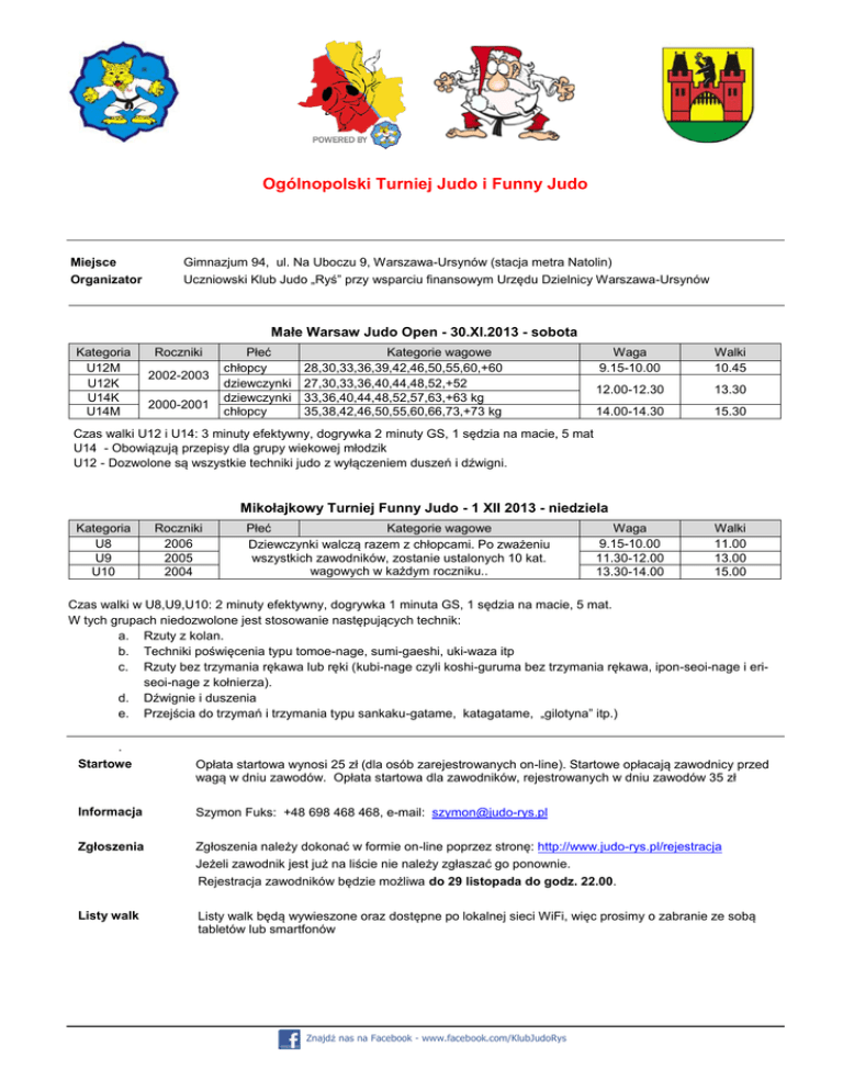 Ogólnopolski Turniej Judo i Funny Judo Gimnazjum 94, ul. Na Uboczu 9, Warszawa-Ursynów (stacja metra Natolin) Uczniowski Klub Judo „Ryś” przy wsparciu finansowym Urzędu Dzielnicy Warszawa-Ursynów Miejsce Organizator Małe Warsaw Judo Open - 30.XI.2013 - sobota Kategoria U12M U12K U14K U14M Roczniki 2002-2003 2000-2001 Płeć chłopcy dziewczynki dziewczynki chłopcy Kategorie wagowe 28,30,33,36,39,42,46,50,55,60,+60 27,30,33,36,40,44,48,52,+52 33,36,40,44,48,52,57,63,+63 kg 35,38,42,46,50,55,60,66,73,+73 kg Waga 9.15-10.00 Walki 10.45 12.00-12.30 13.30 14.00-14.30 15.30 Czas walki U12 i U14: 3 minuty efektywny, dogrywka 2 minuty GS, 1 sędzia na macie, 5 mat U14 - Obowiązują przepisy dla grupy wiekowej młodzik U12 - Dozwolone są wszystkie techniki judo z wyłączeniem duszeń i dźwigni. Mikołajkowy Turniej Funny Judo - 1 XII 2013 - niedziela Kategoria U8 U9 U10 Roczniki 2006 2005 2004 Płeć Kategorie wagowe Dziewczynki walczą razem z chłopcami. Po zważeniu wszystkich zawodników, zostanie ustalonych 10 kat. wagowych w każdym roczniku.. Waga 9.15-10.00 11.30-12.00 13.30-14.00 Walki 11.00 13.00 15.00 Czas walki w U8,U9,U10: 2 minuty efektywny, dogrywka 1 minuta GS, 1 sędzia na macie, 5 mat. W tych grupach niedozwolone jest stosowanie następujących technik: a. Rzuty z kolan. b. Techniki poświęcenia typu tomoe-nage, sumi-gaeshi, uki-waza itp c. Rzuty bez trzymania rękawa lub ręki (kubi-nage czyli koshi-guruma bez trzymania rękawa, ipon-seoi-nage i eriseoi-nage z kołnierza). d. Dźwignie i duszenia e. Przejścia do trzymań i trzymania typu sankaku-gatame, katagatame, „gilotyna” itp.) . Startowe Opłata startowa wynosi 25 zł (dla osób zarejestrowanych on-line). Startowe opłacają zawodnicy przed wagą w dniu zawodów. Opłata startowa dla zawodników, rejestrowanych w dniu zawodów 35 zł Informacja Szymon Fuks: +48 698 468 468, e-mail: [email protected] Zgłoszenia Zgłoszenia należy dokonać w formie on-line poprzez stronę: http://www.judo-rys.pl/rejestracja Jeżeli zawodnik jest już na liście nie należy zgłaszać go ponownie. Rejestracja zawodników będzie możliwa do 29 listopada do godz. 22.00. Listy walk Listy walk będą wywieszone oraz dostępne po lokalnej sieci WiFi, więc prosimy o zabranie ze sobą tabletów lub smartfonów Znajdź nas na Facebook - www.facebook.com/KlubJudoRys