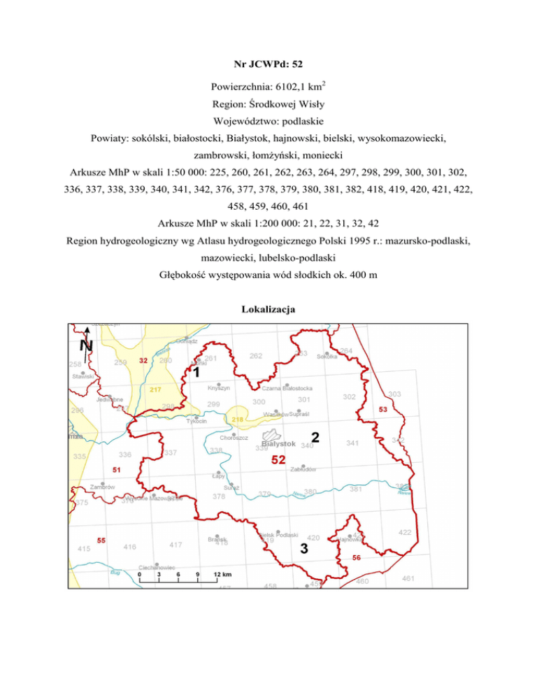 Nr JCWPd: 52 Powierzchnia: 6102,1 km2 Region: Środkowej Wisły Województwo: podlaskie Powiaty: sokólski, białostocki, Białystok, hajnowski, bielski, wysokomazowiecki, zambrowski, łomŜyński, moniecki Arkusze MhP w skali 1:50 000: 225, 260, 261, 262, 263, 264, 297, 298, 299, 300, 301, 302, 336, 337, 338, 339, 340, 341, 342, 376, 377, 378, 379, 380, 381, 382, 418, 419, 420, 421, 422, 458, 459, 460, 461 Arkusze MhP w skali 1:200 000: 21, 22, 31, 32, 42 Region hydrogeologiczny wg Atlasu hydrogeologicznego Polski 1995 r.: mazursko-podlaski, mazowiecki, lubelsko-podlaski Głębokość występowania wód słodkich ok. 400 m Lokalizacja Profile SYMBOL całej JCWPd uwzględniający wszystkie profile: Q(1-3),(Ol), (Cr) Opis symbolu: na obszarze całej jednostki występuje jeden, dwa lub trzy poziomy czwartorzędowe. Ponadto wykształcone są poziomy wodonośne o występowaniu lokalnym: oligoceński i kredowy. Generalnie wszystkie wymienione poziomy nie są ze sobą w bezpośredniej więzi hydraulicznej. Q, - wody porowe w utworach piaszczystych Ol, - wody porowe w utworach piaszczystych Cr, - wody szczelinowe w utworach węglanowych Cecha szczególna JCWPd (ilościowa, chemiczna): brak GZWP występujące w obrębie JCWPd (numer i symbol): 217Qp, 218Qp Schemat przepływu wód podziemnych