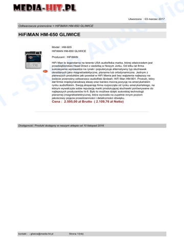 o i d d i V Utworzono : 03 marzec 2017 Odtwarzacze przenośne > HiFiMAN HM-650 GLIWICE HiFiMAN HM-650 GLIWICE Model : HM-605 HiFiMAN HM-650 GLIWICE p le Producent : HiFiMAN l p u A HiFi Man to legendarna na terenie USA audiofilska marka, której właścicielem jest przedsiębiorstwo Head Direct z siedzibą w Nowym Jorku. Od kilku lat firma sukcesywnie wprowadza na rynek i popularyzuje alternatywny typ słuchawek określanych jako magnetoelektyczne, planarne lub ortodynamiczne. Jednym z pierwszych produktów jaki powstał w HiFi Manie jest bez wątpienia najlepszy na świecie przenośny odtwarzacz audiofilski – HiFi Man HM-801. Produkt, który dał firmie międzynarodową sławę oraz bardzo mocną pozycję na amerykańskim rynku audiofilskim. Swoją ekspansję firma rozpoczęła od rynku amerykańskiego, na którym wywalczyła sobie reputację marki produkującej słuchawki porównywane do najlepszych producentów hi-fi. Było to możliwe dzięki autorskiej technologii planarnej (magnetoelektrycznej, która wyniosła na zupełnie innym poziom jakościowy pojęcie przestrzenności i detaliczności dźwięku. k S Cena : 2.595,00 zł Brutto ( 2.109,76 zł Netto) Dostępność: Produkt dostępny w naszym sklepie od 10 listopad 2016 kontakt : - [email protected] Strona 1/{nb}
