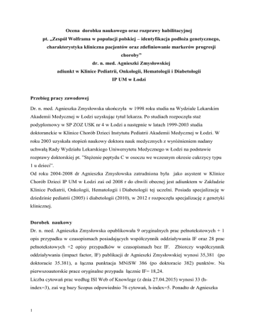 Ocena dorobku naukowego oraz rozprawy habilitacyjnej pt. „Zespół Wolframa w populacji polskiej – identyfikacja podłoża genetycznego, charakterystyka kliniczna pacjentów oraz zdefiniowanie markerów progresji choroby” dr. n. med. Agnieszki Zmysłowskiej adiunkt w Klinice Pediatrii, Onkologii, Hematologii i Diabetologii IP UM w Łodzi Przebieg pracy zawodowej Dr. n. med. Agnieszka Zmysłowska ukończyła w 1998 roku studia na Wydziale Lekarskim Akademii Medycznej w Łodzi uzyskując tytuł lekarza. Po studiach rozpoczęła staż podyplomowy w SP ZOZ USK nr 4 w Łodzi a następnie w latach 1999-2003 studia doktoranckie w Klinice Chorób Dzieci Instytutu Pediatrii Akademii Medycznej w Łodzi. W roku 2003 uzyskała stopień naukowy doktora nauk medycznych z wyróżnieniem nadany uchwałą Rady Wydziału Lekarskiego Uniwersytetu Medycznego w Łodzi na podstawie rozprawy doktorskiej pt. ”Stężenie peptydu C w osoczu we wczesnym okresie cukrzycy typu 1 u dzieci”. Od roku 2004-2008 dr Agnieszka Zmysłowska zatrudniona była jako asystent w Klinice Chorób Dzieci IP UM w Łodzi zaś od 2008 r do chwili obecnej jest adiunktem w Zakładzie Klinice Pediatrii, Onkologii, Hematologii i Diabetologii tej uczelni. Posiada specjalizację w dziedzinie pediatrii (2005) i diabetologii (2010), w 2012 r rozpoczęła specjalizację z genetyki klinicznej. Dorobek naukowy Dr. n. med. Agnieszka Zmysłowska opublikowała 9 oryginalnych prac pełnotekstowych + 1 opis przypadku w czasopismach posiadających współczynnik oddziaływania IF oraz 28 prac pełnotekstowych +2 opisy przypadków w czasopismach bez IF. Zbiorczy współczynnik oddziaływania (impact factor, IF) publikacji dr Agnieszki Zmysłowskiej wynosi 35,381 (po doktoracie 35.381), a łączna punktacja MNiSW 386 (po doktoracie 382) punktów. Na pierwszoautorskie prace oryginalne przypada łącznie IF= 18,24. Liczba cytowań prac według ISI Web of Knowlege (z dnia 27.04.2015) wynosi 33 (hindex=3), zaś wg bazy Scopus odpowiednio 76 cytowań, h-index=5. Ponadto dr Agnieszka 1 Zmysłowska jest współautorką 24 streszczeń ze zjazdów międzynarodowych i 55 ze zjazdów krajowych. Tematyka badań naukowych Zainteresowania naukowe dr n. med. Agnieszko Zmysłowskiej poświęcone są niemal w całości badaniom zespołów cukrzycy monogenowej ujawniającej się u dzieci i młodzieży i koncentrują się wokół następujących zagadnień: Zespół Alstrőma: scharakteryzowanie grupy 12 polskich pacjentów z zespołem Alstrőma, potwierdzić molekularne podłoże choroby u wszystkich pacjentów oraz członków ich rodzin w oparciu o bezpośrednie sekwencjonowanie genu ALMS1 oraz sekwencjonowanie eksonowe, jak również zaproponować korelacje genotypowo-fenotypowe u pacjentów z zespołem Alstrőma w populacji polskiej. Epidemiologiczna ocena częstości występowania poszczególnych typów cukrzycy u dzieci i młodzieży w populacji polskiej. Badanie wykazało min, iż cukrzyce uwarunkowane monogenowo występują w populacji pediatrycznej znacznie częściej niż cukrzyca typu 2 czy cukrzyca w przebiegu mukowiscydozy, a najczęstszym rodzajem cukrzycy monogenowej jest cukrzyca związana z mutacjami w genie glukokinazy. Charakterystyka kliniczna i genetyczna pacjentów z cukrzycą związana z mutacjami w genie glukokinazy. Współtworzenie algorytmów postępowania diagnostyczno-terapeutycznego w różnych typach cukrzyc monogenowych, w tym w zespołach cukrzycy monogenowej. Poszukiwanie wczesnych markerów przewlekłych powikłań cukrzycy typu 1, ze szczególnym uwzględnieniem nefropatii cukrzycowej. Inne wątki prowadzonych badań naukowych dotyczą m. in. insulinooporności tkanek obwodowych w patogenezie cukrzycy typu 1, podłoże genetyczne zjawiska insulinooporności (związek polimorfizmu genu IRS1 z zapotrzebowaniem na insulinę u dzieci z cukrzycą typu 1), związek pomiędzy polimorfizmem genu PPAR2 a resztkową insulinosekrecją oraz wzrostem BMI w cukrzycy typu 1 u dzieci. Dr Zmysłowska brała również udział w badaniach nad etiologią zakażeń układu moczowego u dzieci i profilaktyki ZUM u dzieci, a także nad genetycznymi czynnikami rozwoju podatności na ostre białaczki wieku dziecięcego. 2 Udział w projektach badawczych finansowanych ze środków budżetowych na naukę Dr n. med. Agnieszka Zmysłowska kierowała dwoma projektami badawczymi krajowymi: Granty krajowe: 1. „Ogólnopolski rejestr zespołów cukrzycy monogenowej wieku rozwojowego” 2. „Zdefiniowanie podłoża molekularnego zespołu Wolframa - postępowanie diagnostyczne oraz próba działania interwencyjnego” Była również wykonawcą trzech projektów finansowanych ze środków budżetowych na naukę: 1. Projektu badawczego, finansowanego przez Ministerstwo Nauki i Informatyzacji pt.: Remisja kliniczna w cukrzycy typu 1 u dzieci i młodzieży: uwarunkowania immunologiczne, genetyczne i metaboliczne” 2. Projektu badawczego, finansowanego przez Ministerstwo Nauki i Informatyzacji pt.: „Wpływ genetycznej i fenotypowej zmienności mediatorów metabolizmu tkanki tłuszczowej na resztkową insulinosekrecję w cukrzycy typu 1” 3. Projektu badawczego, finansowanego przez Ministerstwo Nauki i Szkolnictwa Wyższego pt.: „Genetycznie uwarunkowany transport wolnych kwasów tłuszczowych w komórce beta a resztkowa insulinosekrecja w cukrzycy typu 1” Ponadto brała udział w projekcie TEAM finansowanym przez FNP „Polish Registry for Pediatric and Adolescent Diabetes - nationwide genetic screening for monogenic diabetes” Granty międzynarodowe: Dr Agnieszka Zmysłowska pełniła funkcję konsultanta klinicznego na Polskę w Projekcie Komisji Europejskiej „Rejestr Euro-WABB: Europejski Rejestr rzadkich zespołów cukrzyc monogenowych”, koordynowanym przez prof. dr hab. n. med. Wojciecha Młynarskiego. Nagrody i wyróżnienia Dr Agnieszka Zmysłowska była wielokrotnie nagradzana za swoją działalność naukową w tym trzykrotnie nagrodami naukow