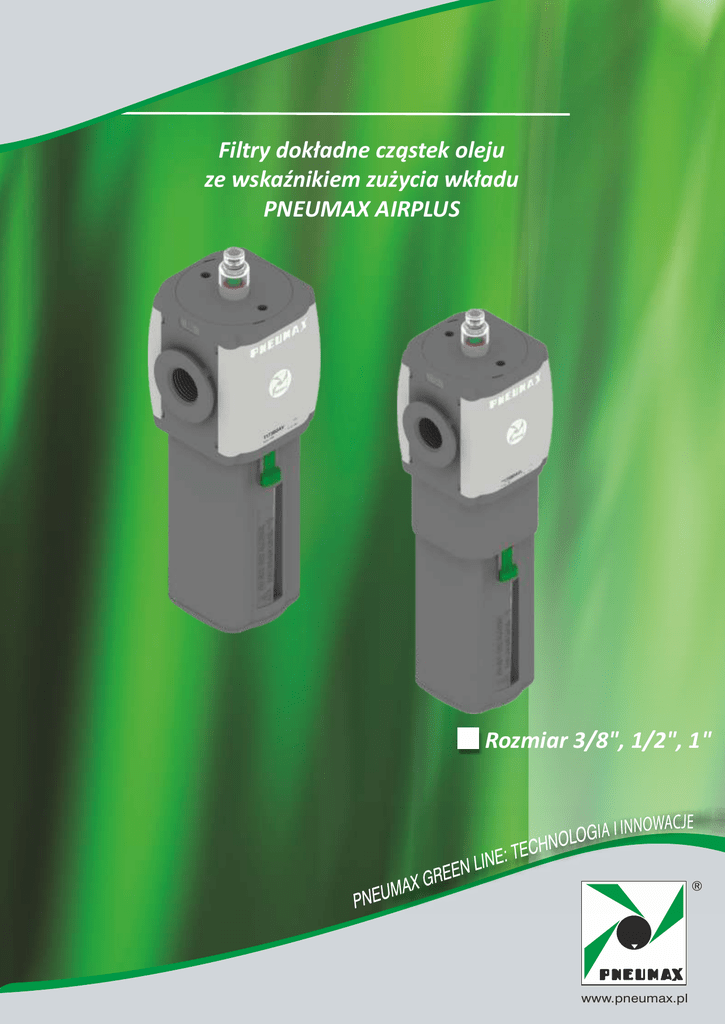 Filtry dokładne cząstek oleju ze wskaźnikiem zużycia wkładu PNEUMAX AIRPLUS Rozmiar 3/8", 1/2", 1" www.pneumax.pl Zespoły przygotowania powietrza Seria Airplus Opis filtrów Łatwość montażu, elastyczność, nowoczesny wygląd, bardzo dobre parametry pracy, atrakcyjna cena to główne cechy nowej serii zestawów przygotowania powietrza firmy PNEUMAX. Serię AIRPLUS zaprojektowano z wykorzystaniem najnowszych technologii projektowania i produkcji w celu osiągnięcia wysokich parametrów pracy oraz w celu uproszczenia i przyspieszenia samej instalacji zestawów. Nowa, modułowa struktura zestawów przygotowania powietrza serii PNEUMAX AIRPLUS bazuje na flanszach mocujących zapewniających maksymalną elastyczność i łatwość instalacji. Nowy system zapewnia możliwość montażu i demontażu poszczególnych elementów bez konieczności demontażu całego zestawu. Seria AIRPLUS została rozszerzona o nowe elementy – dokładny filtr cząstek oleju, oraz dokładny filtr cząstek oleju o zwiększonej efektywności - oba ze wskaźnikiem zużycia wkładu filtracyjnego Filtr cząstek oleju pozwala na uzyskanie najwyższej klasy czystości powietrza (w 5-cio stopniowej skali). Stosowany jest do pracy w aplikacjach wymagających bardzo wysokiej czystości powietrza. Najważniejsze cechy: - ciekawy system ze wskaźnikiem zużycia wkładu filtracyjnego; - wersja standard oraz ze zwiększoną efektywnością; - przyłącza: G3/8", G1/2”, G1”; - filtracja 0,01 µm dla cząstek stałych; - filtracja 0,01 mg/m3 dla cząstek oleju. Wskaźnik zużycia wkładu Wkład nowy Wkład zabrudzony zalecana wymiana - Gdy Dp (Pwe- Pwy) pomiędzy [0.1-0.5 bar] - wskaźnik zielony. Kiedy Dp wzrasta ponad 0.5 bar – pojawia się czerwony wskaźnik Wskaźnik czerwony widoczny w całości – wkład do wymiany (jest zbyt zabrudzony) Dane techniczne mogą ulec zmianie bez uprzedniego powiadomienia. www.pneumax.pl 1 Zespoły przygotowania powietrza Seria Airplus Dokładny filtr cząstek oleju - typ DB - przyłącza G3/8"- G1/2" wskaźnik zanieczyszczenia wkładu filtrującego 73 63 80 G1 /2" - G3/8" 40 24.1 65 1 53.5 21 7.6 do wymiany *65 1 1 3.5 czysty przyłącze G1/8" *Odległość potrzebna do zdjęcia zbiornika Przykład : T173BDBV : rozmiar 3 Filtr oleju, wskaźnik zanieczyszczenia filtra, przyłącza technopolimerowe gwint G1/2" . Ciśnienie wejściowe (6,3 bar) Ciśnienie wejściowe (bar) 6,3 100 Charakterystyka wydajności Spadek ciśnienia ∆p (bar) Charakterystyka przepływu 4 0,4 0,3 0,2 0,1 90 80 Wydajność (%) 2,5 0,5 70 60 50 40 30 20 10 0 0 200 400 600 800 1000 1200 1400 1600 1800 2000 0 0 0,10 0,20 0,30 0,40 0,50 Spadek ciśnienia ∆p (bar) Przepływ (Nl/min) Dane techniczne Charakterystyka pracy Przyłącza - Koalescencyjny wkład filtra zielony: wkład filtracyjny czysty Maksymalne ciśnienie wejściowe Minimalne ciśnienie pracy dla automatycznego spustu kondensatu Maksymalne ciśnienie pracy dla automatycznego spustu kondensatu czerwony: wkład filtracyjny wymaga wymiany Temperatura pracy do wychwytywania cząsteczek stałych do 0,01 µm. oraz cząstek oleju do wielkości 0,01 ppm - Wskaźnik zanieczyszczenia filtra - Przezroczysty zbiornik wykonany z poliwęglanu Waga - wersja z gwintami technopolimer. Waga - wersja z gwintami metalowymi z osłoną. - Montaż zbiornika za pomocą wygodnego systemu bagnetowego z przyciskiem bezpieczeństwa. - W standardzie montowany spust automatyczny. Minimalny spadek ∆p Maksymalny spadek ∆p Pojemność zbiornika kondensatu Pozycja mocowania Maks. moment dokręcenia przyłączy (przyłącza technopolimerowe) G 3/8” - G 1/2” Kod zamówieniowy 13 bar V 173 C DBV 0,5 bar 10 bar V WERSJA N = Wkładki metalowe T = Przyłącza technopolimer. C B PRZYŁĄCZA A = G3/8" (tylko wer.„N” z wkł.metalową) B = G1/2" C = 1/2" NPT(tylko wer.„N” z wkł.met.) -5°C +50°C 440g 460g 0,12 bar 0,5 bar 30 cm3 Pionowa G1/2" = 22 Nm Maks. moment dokręcenia przyłączy G3/8" = 25 Nm (z wkładkami gwintowanymi) G1/2" = 30 Nm Uwaga: producent zaleca zastosowanie filtra wstępnego 5µm. przed dokładnym filtrem cząstek oleju. Aby zapewnić odpowiedni przepływ i działanie automatycznego spustu kondensatu sugerujemy zastosowanie złącza na wąż minimum 6mm Dane techniczne mogą ulec zmianie bez uprzedniego powiadomienia. www.pneumax.pl 2 Zespoły przygotowania powietrza Seria Airplus Dokładny filtr cząstek oleju o zwiększonej efektywności - typ DC - przyłącza G3/8"- G1/2" wskaźnik zanieczyszczenia wkładu filtrującego 73 63 63 80 80 G1 /2" - G3/8" 40 G1 /2" - G3/8" 40 24.1 24.1 65 65 21 7.6 do wymiany *65 *65 1 51 .9 1 91 .9 1 1 3.5 1 53.5 256 czysty przyłącza G1/8" przyłącze G1/8" *Odległość potrzebna do zdjęcia zbiornika Przykład: T173BDCV : rozmiar 3 Precyzyjny filtr oleju ze wskaźnikiem zanieczyszczenia filtra, przyłącza technopolimerowe gwint G1/2". Ciśnienie wejściowe (6,3 bar) Ciśnienie wejściowe (bar) 4 100 0,8 6,3 0,7 0,6 0,5 0,4 0,3 0,2 0,1 0 90 80 Wydajność (%) Spadek ciśnienia ∆p (bar) Charakterystyka przepływu 0,9 Charakterystyka wydajności 2,5 1 70 60 50 40 30 20 10 0 200 400 600 800 1000 1200 1400 1600 1800 2000 0 0 0,10 0,20 0,30 0,40 0,50 Spadek ciśnienia ∆p (bar) Przepływ (Nl/min) Przepływ (Nl/min) Dane techniczne Charakterystyka pracy Przyłącza - Koalescencyjny wkład filtra zielony: wkład filtracyjny czysty Maksymalne ciśnienie wejściowe Minimalne ciśnienie pracy dla automatycznego spustu kondensatu Maksymalne ciśnienie pracy dla automatycznego spustu kondensatu czerwony: wkład filtracyjny wymaga wymiany Temperatura pracy do wychwytywania cząsteczek stałych do 0,01 µm. oraz cząstek oleju do wielkości 0,01 ppm - Wskaźnik zanieczyszczenia filtra - Przezroczysty zbiornik wykonany z poliwęglanu Waga - wersja z gwintami technopolimer. Waga - wersja z gwintami metalowymi z osłoną. - Montaż zbiornika za pomocą wygodnego systemu bagnetowego z przyciskiem bezpieczeństwa. - W standardzie