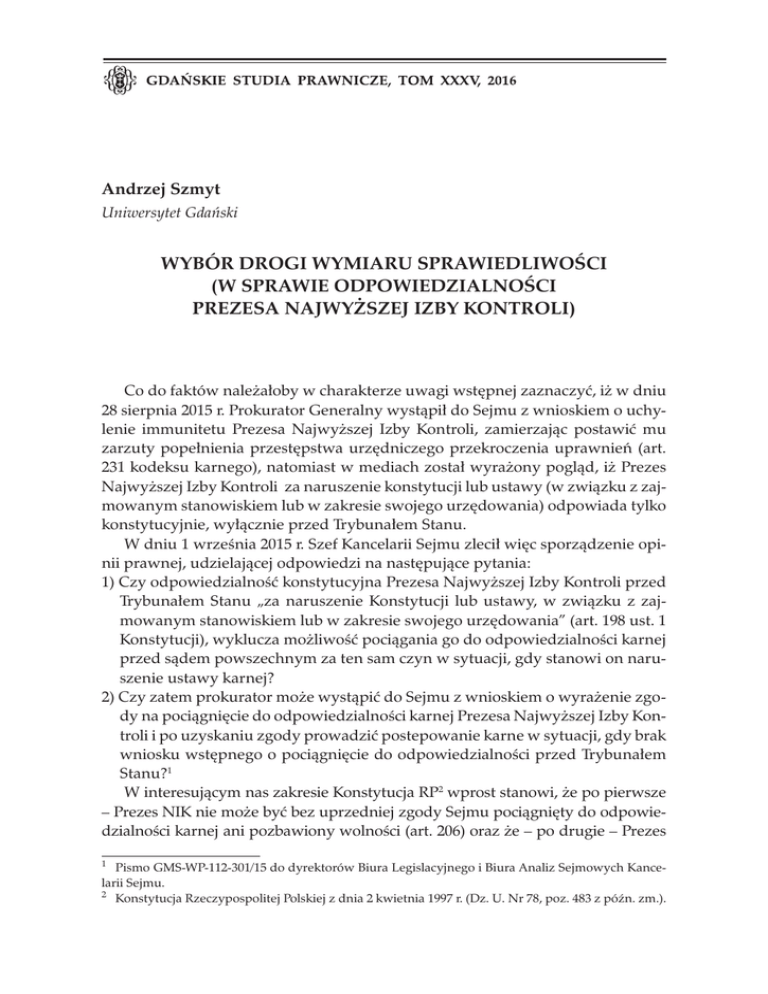Andrzej Szmyt Uniwersytet Gdański Wybór drogi wymiaru sprawiedliwości (W sprawie odpowiedzialności Prezesa Najwyższej Izby Kontroli) Co do faktów należałoby w charakterze uwagi wstępnej zaznaczyć, iż w dniu 28 sierpnia 2015 r. Prokurator Generalny wystąpił do Sejmu z wnioskiem o uchylenie immunitetu Prezesa Najwyższej Izby Kontroli, zamierzając postawić mu zarzuty popełnienia przestępstwa urzędniczego przekroczenia uprawnień (art. 231 kodeksu karnego), natomiast w mediach został wyrażony pogląd, iż Prezes Najwyższej Izby Kontroli za naruszenie konstytucji lub ustawy (w związku z zajmowanym stanowiskiem lub w zakresie swojego urzędowania) odpowiada tylko konstytucyjnie, wyłącznie przed Trybunałem Stanu. W dniu 1 września 2015 r. Szef Kancelarii Sejmu zlecił więc sporządzenie opinii prawnej, udzielającej odpowiedzi na następujące pytania: 1) Czy odpowiedzialność konstytucyjna Prezesa Najwyższej Izby Kontroli przed Trybunałem Stanu „za naruszenie Konstytucji lub ustawy, w związku z zajmowanym stanowiskiem lub w zakresie swojego urzędowania” (art. 198 ust. 1 Konstytucji), wyklucza możliwość pociągania go do odpowiedzialności karnej przed sądem powszechnym za ten sam czyn w sytuacji, gdy stanowi on naruszenie ustawy karnej? 2) Czy zatem prokurator może wystąpić do Sejmu z wnioskiem o wyrażenie zgody na pociągnięcie do odpowiedzialności karnej Prezesa Najwyższej Izby Kontroli i po uzyskaniu zgody prowadzić postepowanie karne w sytuacji, gdy brak wniosku wstępnego o pociągnięcie do odpowiedzialności przed Trybunałem Stanu?1 W interesującym nas zakresie Konstytucja RP2 wprost stanowi, że po pierwsze – Prezes NIK nie może być bez uprzedniej zgody Sejmu pociągnięty do odpowiedzialności karnej ani pozbawiony wolności (art. 206) oraz że – po drugie – Prezes 1 Pismo GMS-WP-112-301/15 do dyrektorów Biura Legislacyjnego i Biura Analiz Sejmowych Kancelarii Sejmu. 2 Konstytucja Rzeczypospolitej Polskiej z dnia 2 kwietnia 1997 r. (Dz. U. Nr 78, poz. 483 z późn. zm.). 414 Andrzej Szmyt NIK ponosi odpowiedzialność konstytucyjną (za naruszenie konstytucji lub ustawy w związku z zajmowanym stanowiskiem lub w zakresie swojego urzędowania) przed Trybunałem Stanu (art. 198 ust. 1); krąg podmiotowy organów, objęty tymże przepisem art. 198, obejmuje również Prezydenta RP, Prezesa Rady Ministrów i członków Rady Ministrów, Prezesa NBP, członków KRRiT, osoby, którym Prezes RM powierzył kierowanie ministerstwem oraz Naczelnego Dowódcę Sił Zbrojnych, a w zakresie określonym przez art. 107 Konstytucji także posłów i senatorów. Jako tło analiz należy jednak postrzegać także art. 145 i art. 156 Konstytucji. Zgodnie z art. 145 ust. 1 – Prezydent RP za naruszenie konstytucji, ustawy lub za popełnienie przestępstwa może być pociągnięty do odpowiedzialności przed Trybunałem Stanu. Zgodnie zaś z art. 156 ust. 1 – członkowie Rady Ministrów ponoszą odpowiedzialność przed Trybunałem Stanu za naruszenie konstytucji lub ustaw, a także za przestępstwa popełnione w związku z zajmowanym stanowiskiem. Poniekąd kwintesencją powyższych przepisów konstytucyjnych może być uwaga Trybunału Konstytucyjnego w wyroku z dnia 21 lutego 2001 r.3, gdzie Trybunał stwierdził, że „W tradycji polskiego konstytucjonalizmu różnie ujmowano w różnych okresach historycznych krąg podmiotów odpowiadających przed Trybunałem Stanu, ale zasadniczy nurt tej odpowiedzialności związany był zawsze z tzw. deliktem konstytucyjnym, pod którym to pojęciem rozumie się działanie lub zaniechanie, naruszające konstytucję lub ustawę. Tak czyni również obecnie obowiązująca konstytucja w art. 198, 145 i 156. Naruszenie konstytucji lub ustawy może przybrać postać przestępstwa, ale nawet w takim przypadku pojęcia «delikt konstytucyjny» i «przestępstwo» nie mogą być uznane za tożsame. Pojęcia «deliktu konstytucyjnego» nie można również traktować jako pojęcia szerszego, «konsumującego» niejako przestępstwo. Odpowiedzialność konstytucyjna i odpowiedzialność «za przestępstwo» to dwa różne reżimy odpowiedzialności, które mogą być w pewnych, określonych konstytucją sytuacjach, stosowane jednocześnie przez Trybunał Stanu w stosunku do tych samych osób”4. Doktryna prawa konstytucyjnego trwale i konsekwentnie porządkuje siatkę pojęciową w ten sposób, że odpowiedzialność konstytucyjną przed Trybunałem Stanu wiąże z deliktem konstytucyjnym rozumianym wąsko, tzn. z naruszeniem Konstytucji lub ustawy (przez wymienione podmioty, w związku z zajmowanym stanowiskiem lub w zakresie swojego urzędowania), ale niestanowiącym przestępstwa, zaś odpowiedzialność „karną” za przestępstwo, traktując jako element zakresu kognicji Trybunału Stanu jedynie jako wyjątek, dopuszczony wyraźnym przepisem konstytucyjnym5. 3 Sygn. P. 12/00 (OTK 2001, nr 3, poz. 47); tekst sentencji – Dz. U. Nr 14, poz. 146. Cz. III – 3 Uzasadnienia wyroku. 5 Np. L. Garlicki, Polskie prawo konstytucyjne. Zarys wykładu, Warszawa 2015, s. 368–372 i Prawo konstytucyjne, red. Z. Witkowski, A. Bień-Kacała, Toruń 2015, s. 533–541. 4 Wybór drogi wymiaru sprawiedliwości… 415 Przytoczony przepis art. 198 Konstytucji, wyrażający zasadę odpowiedzialności konstytucyjnej w odniesieniu do wskazanego katalogu podmiotów, na zasadzie wyjątku poszerzony zostaje o kognicję Trybunału Stanu za popełnienie przestępstwa jedynie – choć na różnych warunkach – w odniesieniu do Prezydenta RP (art. 145) i członków Rady Ministrów (art. 156). Co do meritum, przepis art. 198 Konstytucji powtórzony zostaje w art. 1 i 3 ustawy z dnia 26 marca 1982 r. o Trybunale Stanu6, zaś art. 145 Konstytucji w przepisie art. 2 ust. 1 przywołanej ustawy o Trybunale Stanu. Nie budzi wątpliwości, że z brzmienia przywołanych przepisów wynika, iż Prezydent nie może być pociągnięty do odpow