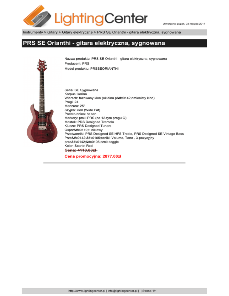 Utworzono: piątek, 03 marzec 2017 Instrumenty > Gitary > Gitary elektryczne > PRS SE Orianthi - gitara elektryczna, sygnowana PRS SE Orianthi - gitara elektryczna, sygnowana Nazwa produktu: PRS SE Orianthi - gitara elektryczna, sygnowana Producent: PRS Model produktu: PRSSEORIANTHI Seria: SE Sygnowana Korpus: korina Wierzch: fazowany klon (okleina płomienisty klon) Progi: 24 Menzura: 25" Szyjka: klon (Wide Fat) Podstrunnica: heban Markery: ptaki PRS (na 12-tym progu O) Mostek: PRS Designed Tremolo Klucze: PRS Designed Tuners Osprzęt: niklowy Przetworniki: PRS Designed SE HFS Treble, PRS Designed SE Vintage Bass Przełączniki: Volume, Tone , 3-pozycyjny przełącznik toggle Kolor: Scarlet Red Cena: 4110.00zł Cena promocyjna: 2877.00zł http://www.lightingcenter.pl | [email protected] | | Strona 1/1