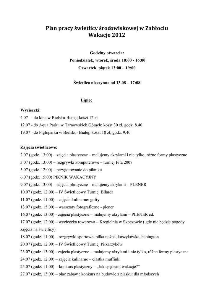 Plan pracy świetlicy środowiskowej w Zabłociu Wakacje 2012 Godziny otwarcia: Poniedziałek, wtorek, środa 10:00 - 16:00 Czwartek, piątek 13:00 – 19:00 Świetlica nieczynna od 13.08 – 17:08 Lipiec Wycieczki: 4.07 - do kina w Bielsku-Białej; koszt 12 zł 12.07 - do Aqua Parku w Tarnowskich Górach; koszt 30 zł, godz. 8.40 19.07 -do Figloparku w Bielsku- Białej; koszt 10 zł, godz. 9.40 Zajęcia świetlicowe: 2.07 (godz. 13:00) – zajęcia plastyczne – malujemy akrylami i nie tylko, różne formy plastyczne 3.07 (godz. 13:00) – rozgrywki komputerowe – turniej Fifa 2007 5.07 (godz. 12:00) – przygotowanie do pikniku 6.07 (godz. 15:00) PIKNIK WAKACYJNY 9.07 (godz. 13:00) – zajęcia plastyczne – malujemy akrylami – PLENER 10.07 (godz. 12:00) – IV Świetlicowy Turniej Bilarda 11.07 (godz. 11:00) – zajęcia kulinarne: gofry 13.07 (godz. 15:00) – warsztaty fotograficzne - plener 16.07 (godz. 13:00) - zajęcia plastyczne – malujemy akrylami – PLENER cd. 17.07 (godz. 12:00) – wycieczka rowerowa – Kręgielnia w Skoczowie ( gdy nie będzie pogody zajęcia na świetlicy) 18.07 (godz. 11:00) – rozgrywki sportowe: piłka nożna, koszykówka, babington 20.07 (godz. 12:00) – IV Świetlicowy Turniej Piłkarzyków 23.07 (godz. 13:00) - zajęcia plastyczne – malujemy akrylami i nie tylko, różne formy plastyczne 24.07 (godz. 12:00) – zajęcia kulinarne – ciastka muffinki 25.07 (godz. 11:00) - konkurs plastyczny – „Jak spędzam wakacje?” 27.07 (godz. 13:00) – plac zabaw : konkurs na budowle z piasku: dla młodszych 30.07 (godz. 13:00) - zajęcia plastyczne – malujemy akrylami i nie tylko, różne formy plastyczne 31.07 (godz. 12:00) – wycieczka rowerowa Sierpień 1.08 (godz. 11:00) – turniej gier planszowych 2.08 (godz. 15:00) - grill lub ognisko 3.08 (godz. 14:00) – zajęcia plastyczne – rysunki kredą na asfalcie – postacie bajkowe Resztę sierpnia spędzamy według pomysłów uczestników, humoru, sił i pogody W poniedziałki zostają zajęcia plastyczne – malowanie akrylami. 25.08 SFArt – Strumieński Festiwal Artystyczny – wystawimy nasze obrazy.
