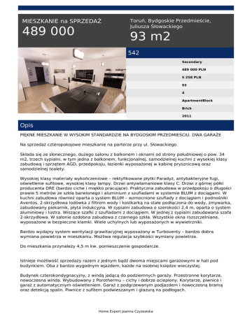 MIESZKANIE na SPRZEDAŻ 489 000 Toruń, Bydgoskie Przedmieście, Juliusza Słowackiego 93 m2 542 Secondary 489 000 PLN 5 258 PLN 93 4 ApartmentBlock Brick 2011 Opis PIĘKNE MIESZKANIE W WYSOKIM STANDARDZIE NA BYDGOSKIM PRZEDMIEŚCIU. DWA GARAŻE Na sprzedaż czteropokojowe mieszkanie na parterze przy ul. Słowackiego. Składa się ze słonecznego, dużego salonu z balkonem i oknami od strony południowej o pow. 34 m2, trzech sypialni, w tym jedna z balkonem, funkcjonalnej, samodzielnej kuchni z wysokiej klasy zabudową i sprzętem AGD, przedpokoju, łazienki wyposażonej w kabinę prysznicową oraz samodzielnej toalety. Wysokiej klasy materiały wykończeniowe – rektyfikowane płytki Paradyż, antybakteryjne fugi, oświetlenie sufitowe, wysokiej klasy lampy. Drzwi antywłamaniowe klasy C. Drzwi z górnej półki producenta DRE (bardzo ciche i miękko pracujące). Praktyczna zabudowa w przedpokoju o długości prawie 5 metrów ze szkła barwionego i aluminium z szufladami w systemie BLUM z dociągami. W kuchni zabudowa również oparta o system BLUM – wzmocnione szuflady z dociągiem i podnośniki Aventos. 2-skrzydłowa lodówka z filtrem wody i kostkarką na stałe podłączona do wody, zmywarka, zabudowany piekarnik, płyta indukcyjna. W sypialni zabudowa o szerokości 2,4 m, oparta o system aluminiowy i lustra. Wiszące szafki z szufladami z dociągiem. W jednej z sypialni zabudowana szafa 2-skrzydłowa. W salonie ozdobna zabudowa z czarnego szkła. Wszystkie okna rozszczelniane, wyposażone w bezpieczne klamki. Wiele uchylnych lub wyposażonych w wywietrzniki. Bardzo wydajny system wentylacji grawitacyjnej wyposażony w Turboventy – bardzo dobra wymiana powietrza w mieszkaniu. Możliwa regulacja szybkości wymiany powietrza. Do mieszkania przynależy 4,5 m kw. pomieszczenie gospodarcze. Istnieje możliwość sprzedaży razem z jednym bądź dwoma miejscami garażowymi w hali pod budynkiem. Oba z bardzo wygodnym wjazdem, każde na osobnej księdze wieczystej. Budynek czterokondygnacyjny, z windą jadącą do podziemnych garaży. Przestronne korytarze, nowoczesna winda. Wybudowany z Porothermu – cichy i dobrze ocieplony. Korytarze, piwnice i garaż z automatycznym oświetleniem. Garaż z podgrzewanym podjazdem i nowoczesną bramą oraz detekcją spalin. Piwnice z sufitem podwieszanym i glazurą na podłogach. Home Expert Joanna Czyżewska Blisko terenów rekreacyjnych – w pobliżu Park Bydgoski, las za UMK. Koło bloku przebiega Wiślany Szlak Rowerowy. Liczne place zabaw dla dzieci. Do tego cisza i spokój – nie słychać ul. Broniewskiego czy tramwajów. Blisko Polo Market, Biedronka, Tesco, Żabka, Delikatesy Gzella i kilka innych sklepów. Niedaleko przystanki autobusowe i tramwajowe. Na Starówkę poniżej 20 minut pieszo. Blisko przedszkole, szkoła i kluby malucha. Zapraszam na prezentację mieszkania. Joanna Czyżewska tel. 507 175 611 email: [email protected] Home Expert Joanna Czyżewska Powered by TCPDF (www.tcpdf.org)