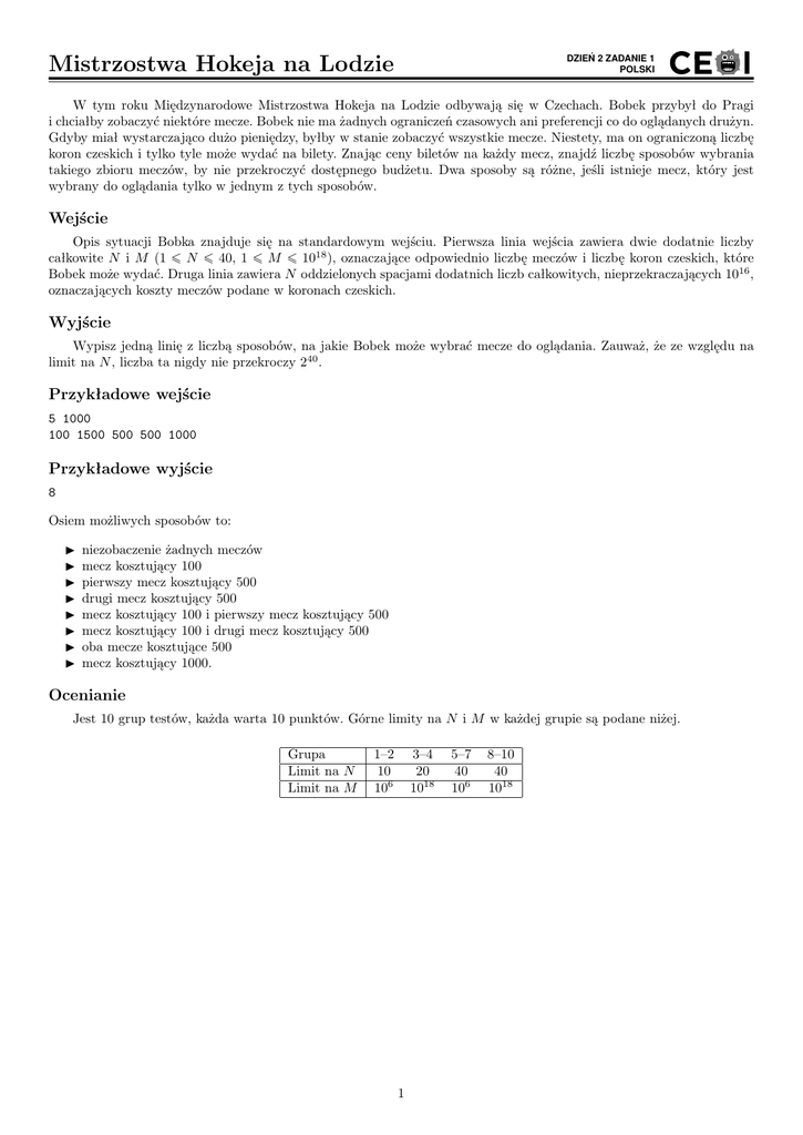 DZIEŃ 2 ZADANIE 1 POLSKI Mistrzostwa Hokeja na Lodzie W tym roku Międzynarodowe Mistrzostwa Hokeja na Lodzie odbywają się w Czechach. Bobek przybył do Pragi i chciałby zobaczyć niektóre mecze. Bobek nie ma żadnych ograniczeń czasowych ani preferencji co do oglądanych drużyn. Gdyby miał wystarczająco dużo pieniędzy, byłby w stanie zobaczyć wszystkie mecze. Niestety, ma on ograniczoną liczbę koron czeskich i tylko tyle może wydać na bilety. Znając ceny biletów na każdy mecz, znajdź liczbę sposobów wybrania takiego zbioru meczów, by nie przekroczyć dostępnego budżetu. Dwa sposoby są różne, jeśli istnieje mecz, który jest wybrany do oglądania tylko w jednym z tych sposobów. Wejście Opis sytuacji Bobka znajduje się na standardowym wejściu. Pierwsza linia wejścia zawiera dwie dodatnie liczby całkowite N i M (1 ¬ N ¬ 40, 1 ¬ M ¬ 1018 ), oznaczające odpowiednio liczbę meczów i liczbę koron czeskich, które Bobek może wydać. Druga linia zawiera N oddzielonych spacjami dodatnich liczb całkowitych, nieprzekraczających 1016 , oznaczających koszty meczów podane w koronach czeskich. Wyjście Wypisz jedną linię z liczbą sposobów, na jakie Bobek może wybrać mecze do oglądania. Zauważ, że ze względu na limit na N , liczba ta nigdy nie przekroczy 240 . Przykładowe wejście 5 1000 100 1500 500 500 1000 Przykładowe wyjście 8 Osiem możliwych sposobów to: I I I I I I I I niezobaczenie żadnych meczów mecz kosztujący 100 pierwszy mecz kosztujący 500 drugi mecz kosztujący 500 mecz kosztujący 100 i pierwszy mecz kosztujący 500 mecz kosztujący 100 i drugi mecz kosztujący 500 oba mecze kosztujące 500 mecz kosztujący 1000. Ocenianie Jest 10 grup testów, każda warta 10 punktów. Górne limity na N i M w każdej grupie są podane niżej. Grupa Limit na N Limit na M 1–2 10 106 3–4 20 1018 1 5–7 40 106 8–10 40 1018