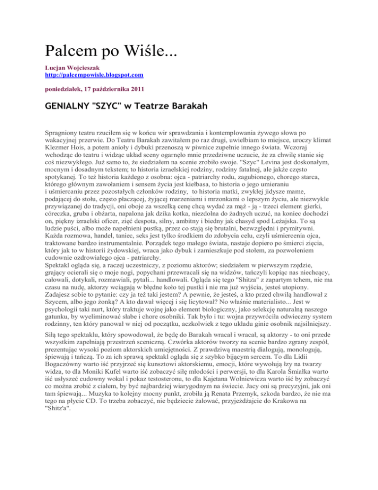 Palcem po Wiśle... Lucjan Wojcieszak http://palcempowisle.blogspot.com poniedziałek, 17 października 2011 GENIALNY "SZYC" w Teatrze Barakah Spragniony teatru rzuciłem się w końcu wir sprawdzania i kontemplowania żywego słowa po wakacyjnej przerwie. Do Teatru Barakah zawitałem po raz drugi, uwielbiam to miejsce, uroczy klimat Klezmer Hois, a potem anioły i dybuki przenoszą w piwnice zupełnie innego świata. Wczoraj wchodząc do teatru i widząc układ sceny ogarnęło mnie przedziwne uczucie, że za chwilę stanie się coś niezwykłego. Już samo to, że siedziałem na scenie zrobiło swoje. "Szyc" Levina jest doskonałym, mocnym i dosadnym tekstem; to historia izraelskiej rodziny, rodziny fatalnej, ale jakże często spotykanej. To też historia każdego z osobna: ojca - patriarchy rodu, zagubionego, chorego starca, którego głównym zawołaniem i sensem życia jest kiełbasa, to historia o jego umieraniu i uśmiercaniu przez pozostałych członków rodziny, to historia matki, zwykłej jidysze mame, podającej do stołu, często płaczącej, żyjącej marzeniami i mrzonkami o lepszym życiu, ale niezwykle przywiązanej do tradycji, oni oboje za wszelką cenę chcą wydać za mąż - ją - trzeci element gierki, córeczka, gruba i obżarta, napalona jak dzika kotka, niezdolna do żadnych uczuć, na koniec dochodzi on, piękny izraelski oficer, zięć despota, silny, ambitny i biedny jak chasyd spod Leżajska. To są ludzie puści, albo może napełnieni pustką, przez co stają się brutalni, bezwzględni i prymitywni. Każda rozmowa, handel, taniec, seks jest tylko środkiem do zdobycia celu, czyli uśmiercenia ojca, traktowane bardzo instrumentalnie. Porządek tego małego świata, nastaje dopiero po śmierci zięcia, który jak to w historii żydowskiej, wraca jako dybuk i zamieszkuje pod stołem, za pozwoleniem cudownie ozdrowiałego ojca - patriarchy. Spektakl ogląda się, a raczej uczestniczy, z poziomu aktorów; siedziałem w pierwszym rzędzie, grający ocierali się o moje nogi, popychani przewracali się na widzów, tańczyli kopiąc nas niechcący, całowali, dotykali, rozmawiali, pytali... handlowali. Ogląda się tego "Shitza" z zapartym tchem, nie ma czasu na nudę, aktorzy wciągają w błędne koło tej pustki i nie ma już wyjścia, jesteś utopiony. Zadajesz sobie to pytanie: czy ja też taki jestem? A pewnie, że jesteś, a kto przed chwilą handlował z Szycem, albo jego żonką? A kto dawał więcej i się licytował? No właśnie materialisto... Jest w psychologii taki nurt, który traktuje wojnę jako element biologiczny, jako selekcję naturalną naszego gatunku, by wyeliminować słabe i chore osobniki. Tak było i tu: wojna przywróciła odwieczny system rodzinny, ten który panował w niej od początku, aczkolwiek z tego układu ginie osobnik najsilniejszy. Siłą tego spektaklu, który spowodował, że będę do Barakah wracał i wracał, są aktorzy - to oni przede wszystkim zapełniają przestrzeń sceniczną. Czwórka aktorów tworzy na scenie bardzo zgrany zespół, prezentując wysoki poziom aktorskich umiejętności. Z prawdziwą maestrią dialogują, monologują, śpiewają i tańczą. To za ich sprawą spektakl ogląda się z szybko bijącym sercem. To dla Lidii Bogaczówny warto iść przyjrzeć się kunsztowi aktorskiemu, emocji, które wywołują łzy na twarzy widza, to dla Moniki Kufel warto iść zobaczyć siłę młodości i perwersji, to dla Karola Śmiałka warto iść usłyszeć cudowny wokal i pokaz testosteronu, to dla Kajetana Wolniewicza warto iść by zobaczyć co można zrobić z ciałem, by być najbardziej wiarygodnym na świecie. Jacy oni są precyzyjni, jak oni tam śpiewają... Muzyka to kolejny mocny punkt, zrobiła ją Renata Przemyk, szkoda bardzo, że nie ma tego na płycie CD. To trzeba zobaczyć, nie będziecie żałować, przyjeżdżajcie do Krakowa na "Shitz'a".