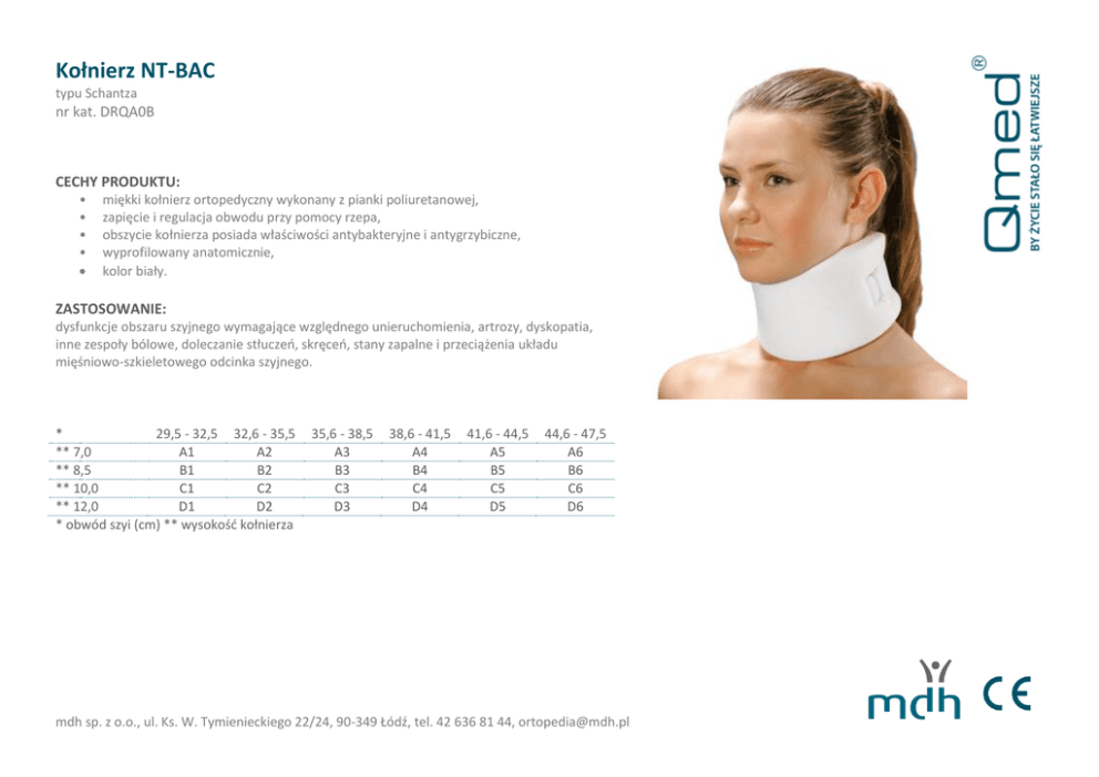 Kołnierz NT-BAC typu Schantza nr kat. DRQA0B CECHY PRODUKTU: • • • • miękki kołnierz ortopedyczny wykonany z pianki poliuretanowej, zapięcie i regulacja obwodu przy pomocy rzepa, obszycie kołnierza posiada właściwości antybakteryjne i antygrzybiczne, wyprofilowany anatomicznie, kolor biały. ZASTOSOWANIE: dysfunkcje obszaru szyjnego wymagające względnego unieruchomienia, artrozy, dyskopatia, inne zespoły bólowe, doleczanie stłuczeo, skręceo, stany zapalne i przeciążenia układu mięśniowo-szkieletowego odcinka szyjnego. * 29,5 - 32,5 32,6 - 35,5 ** 7,0 A1 A2 ** 8,5 B1 B2 ** 10,0 C1 C2 ** 12,0 D1 D2 * obwód szyi (cm) ** wysokośd kołnierza 35,6 - 38,5 A3 B3 C3 D3 38,6 - 41,5 A4 B4 C4 D4 41,6 - 44,5 A5 B5 C5 D5 44,6 - 47,5 A6 B6 C6 D6 mdh sp. z o.o., ul. Ks. W. Tymienieckiego 22/24, 90-349 Łódź, tel. 42 636 81 44, [email protected]