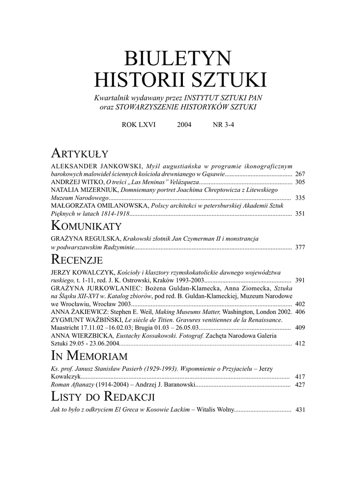 BIULETYN HISTORII SZTUKI Kwartalnik wydawany przez INSTYTUT SZTUKI PAN oraz STOWARZYSZENIE HISTORYKÓW SZTUKI ROK LXVI 2004 NR 3-4 ARTYKU£Y ALEKSANDER JANKOWSKI, Myl augustiañska w programie ikonograficznym barokowych malowide³ ciennych kocio³a drewnianego w G¹sawie.......................................... ANDRZEJ WITKO, O treci Las Meninas Velázqueza......................................................... NATALIA MIZERNIUK, Domniemany portret Joachima Chreptowicza z Litewskiego Muzeum Narodowego............................................................................................................... MA£GORZATA OMILANOWSKA, Polscy architekci w petersburskiej Akademii Sztuk Piêknych w latach 1814-1918................................................................................................... KOMUNIKATY 267 305 335 351 GRA¯YNA REGULSKA, Krakowski z³otnik Jan Czymerman II i monstrancja w podwarszawskim Radzyminie................................................................................................ 377 RECENZJE JERZY KOWALCZYK, Kocio³y i klasztory rzymskokatolickie dawnego województwa ruskiego, t. 1-11, red. J. K. Ostrowski, Kraków 1993-2003..................................................... GRA¯YNA JURKOWLANIEC: Bo¿ena Guldan-Klamecka, Anna Ziomecka, Sztuka na l¹sku XII-XVI w. Katalog zbiorów, pod red. B. Guldan-Klameckiej, Muzeum Narodowe we Wroc³awiu, Wroc³aw 2003.................................................................................................. ANNA ¯AKIEWICZ: Stephen E. Weil, Making Museums Matter, Washington, London 2002. ZYGMUNT WABIÑSKI, Le siècle de Titien. Gravures venitiennes de la Renaissance. Maastricht 17.11.02 16.02.03; Brugia 01.03 26.05.03........................................................ ANNA WIERZBICKA, Eustachy Kossakowski. Fotograf. Zachêta Narodowa Galeria Sztuki 29.05 - 23.06.2004......................................................................................................... 391 402 406 409 412 IN MEMORIAM Ks. prof. Janusz Stanis³aw Pasierb (1929-1993). Wspomnienie o Przyjacielu Jerzy Kowalczyk............................................................................................................................... 417 Roman Aftanazy (1914-2004) Andrzej J. Baranowski.......................................................... 427 LISTY DO REDAKCJI Jak to by³o z odkryciem El Greca w Kosowie Lackim Witalis Wolny................................... 431 BULLETIN OF ART HISTORY A quarterly published by the INSTITUTE OF ART HISTORY OF THE POLISH ACADEMY OF SCIENCES (IS-PAN) in conjunction with the ART HISTORIANS’ SOCIETY YEAR LXVI 2004 No.3-4 ARTICLES ALEKSANDER JANKOWSKI, Augustinian Thought as revealed in the iconographic programme of Baroque mural paintings in the wooden church at G¹sawa........................... ANDRZEJ WITKO, On the Content of Velazquezs Las Meninas....................................... NATALIA MIZERNIUK, The Assumed Portrait of Joachim L. Chreptowicz in the Lithuanian National Museum................................................................................................. MA£GORZATA OMILANOWSKA, Polish Architects graduating from the St. Petersburg Academy of Fine Arts between 1814 and 1914....................................................................... 267 305 335 351 SHORT ARTICLES GRA¯YNA REGULSKA, The Cracow Goldsmith Jan Czymerman II and the monstrance from Radzymin near Warsaw.................................................................................................. 377 REVIEWS JERZY KOWALCZYK, Kocio³y i klasztory rzymskokatolickie dawnego województwa ruskiego, vol. 1-11, ed. J. K. Ostrowski, Kraków 1993-2003................................................ GRA¯YNA JURKOWLANIEC: Bo¿ena Guldan-Klamecka, Anna Ziomecka, Sztuka na l¹sku XII-XVI w. Katalog zbiorów, ed. B. Guldan-Klamecka, National Museum in Wroc³aw, Wroc³aw 2003........................................................................................................... ANNA ¯AKIEWICZ, Stephen E. Weil, Making Museums Matter, Washington, London 2002 ZYGMUNT WABIÑSKI, Le siècle de Titien. Gravures venitiennes de la Renaissance. Maastricht 17.11.02 16.02.03; Brugia 01.03 26.05.03..................................................... ANNA WIERZBICKA, Eustachy Kossakowski. Photographer. Zachêta National Gallery of Art, 29.05 23.06. 2004.................................................................................................... 391 402 406 409 412 IN MEMORIAM Father-Prof. Janusz Stanis³aw Pasierb (1929-1993). Recollections on a Close Friend Jerzy Kowalczyk.................................................................................................................... Roman Aftanazy (1914-2004) Andrzej J. Baranowski........................................................ 417 427 LETTERS TO THE EDITORS. How they came to discover an original El Greco at Kosów Lacki Witalis Wolny................ 431