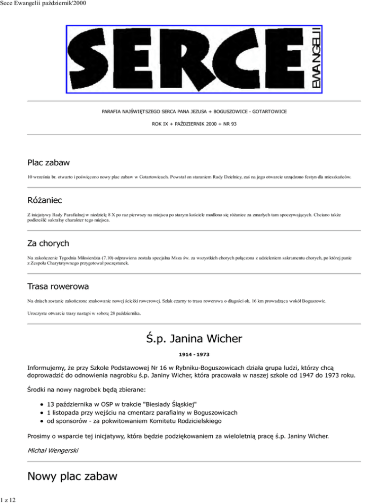Sece Ewangelii październik'2000 1 z 12 PARAFIA NAJŚWIĘTSZEGO SERCA PANA JEZUSA + BOGUSZOWICE - GOTARTOWICE ROK IX + PAŹDZIERNIK 2000 + NR 93 Plac zabaw 10 września br. otwarto i poświęcono nowy plac zabaw w Gotartowicach. Powstał on staraniem Rady Dzielnicy, zaś na jego otwarcie urządzono festyn dla mieszkańców. Różaniec Z inicjatywy Rady Parafialnej w niedzielę 8 X po raz pierwszy na miejscu po starym kościele modlono się różaniec za zmarłych tam spoczywających. Chciano także podkreślić sakralny charakter tego miejsca. Za chorych Na zakończenie Tygodnia Miłosierdzia (7.10) odprawiona została specjalna Msza św. za wszystkich chorych połączona z udzieleniem sakramentu chorych, po której panie z Zespołu Charytatywnego przygotował poczęstunek. Trasa rowerowa Na dniach zostanie zakończone znakowanie nowej ścieżki rowerowej. Szlak czarny to trasa rowerowa o długości ok. 16 km prowadząca wokół Boguszowic. Uroczyste otwarcie trasy nastąpi w sobotę 28 października. 1914 - 1973 Informujemy, że przy Szkole Podstawowej Nr 16 w Rybniku-Boguszowicach działa grupa ludzi, którzy chcą doprowadzić do odnowienia nagrobku ś.p. Janiny Wicher, która pracowała w naszej szkole od 1947 do 1973 roku. Środki na nowy nagrobek będą zbierane: 13 października w OSP w trakcie "Biesiady Śląskiej" 1 listopada przy wejściu na cmentarz parafialny w Boguszowicach od sponsorów - za pokwitowaniem Komitetu Rodzicielskiego Prosimy o wsparcie tej inicjatywy, która będzie podziękowaniem za wieloletnią pracę ś.p. Janiny Wicher. Michał Wengerski Sece Ewangelii październik'2000 2 z 12 10 września otwarto w Gotartowicach nowy plac zabaw dla dzieci. Powstał on staraniem Rady Dzielnicy na terenie po byłym Kółku Rolniczym. W pracach brało udział około 100 pracujących społecznie mieszkańców dzielnicy. Powstały zjeżdżalnie, huśtawki oraz mini hala sportowa z zaadoptowanego budynku gospodarczego. Z okazji jego otwarcia zorganizowano festyn dla wszystkich mieszkańców. Tradycyjnie rozpoczął się on od Mszy św. sprawowanej na świeżym powietrzu przez ks. proboszcza Stanisława Gańczorza. Uroczystego otwarcia dokonał pan Leszek Kuśka - członek Zarządu Miasta i Przewodniczący Rady Dzielnicy. Zaś plac poświęcił Ks. Proboszcz. W ramach festynu urządzono rozgrywki w piłkę nożną, siatkówkę i tenisa stołowego oraz turniej skata. Na program artystyczny złożyły się występy zespołów CANTATE i G.R.A.M. oraz Mariana Graniecznego. rozmowa z mgr. Michałem Wengerskim - Dyrektorem Szkoły Podstawowej Nr 16 w Boguszowicach Jak wygląda SP 16 po reformie? Teraz jesteśmy wyłącznie szkołą podstawową. Mamy 19 klas i 509 uczniów. W klasach pierwszych i drugich są uczniowie także z obwodu Szkoły Podstawowej Nr 36. Od września przyszłego roku z Osiedla Północ przejdzie do naszej szkoły około 250 uczniów i 10 oddziałów klasowych. Będą to klasy trzecie, czwarte i piąte. W porównaniu do lat ubiegłych w szkole jest więc na razie luźno. Owszem. Lekcje teraz trwają od 8 do 15. Przypuszczam, że w przyszłym roku w związku ze zwiększeniem liczby uczniów czas lekcji ulegnie przedłużeniu do godziny 17. Wiem, że długa jest lista planowanych i przeprowadzanych już remontów. W tym roku remontowana jest instalacja centralnego ogrzewania. Za niecałe 300 tys. zł wymieniono kaloryfery i rurki, a piece węglowe zastąpiła nowoczesna kotłownia gazowa. Rozstrzygnięty jest także przetarg na remont łazienek. Nowe sanitariaty zostaną oddane do użytku jesienią. Pojawi się w nich wreszcie ciepła woda grzana przez nowy piec gazowy c.o. Remont ten wiąże się z wymianą całej instalacji wodnej i kanalizacyjnej. Kosztował będzie około 90 tys. zł. Natomiast w przyszłym roku przymierzamy się do bardzo kosztownej wymiany okien. Szkoła ma ponad 40 okien w bardzo złym stanie. Pilnego remonty domaga się także nawierzchnia boiska asfaltowego. W planach ująłem również odtworzenie nieistniejącego już ogrodzenia terenu szkoły od strony nowej drogi wyjazdowej z przykościelnego parkingu oraz remont szkolnej kuchni. Teraz po remoncie szkolnej kotłowni węgiel musimy kupować jedynie na potrzeby kuchni. Ze względów praktycznych piece węglowe należy zastąpić gazowymi lub elektrycznymi. Liczę na to, że powoli z roku na rok ta lista coraz krótsza. Już kilka razy słyszałem o istniejącym przy szkole ogródku dendrologicznym. Ogródek taki został założony w obejściu szkolnym na miejscu niewykorzystywanego ogródka pana woźnego. Na 1000 m2 znajduje się około 60 gatunków drzew i krzewów. W kącie będzie rupieciarnia, żeby mogły się tam zadomowić jaszczurki i jeże. Jest także oczko wodne, a w nim kilkanaście gatunków roślin wodnych, m.in. lilie, grążele, kotewki. Pomysłodawcą i projektantem ogródka jest pan Kamiński z rybnickiego nadleśnictwa. Z kasy miejskiej dostaliśmy na ten cel 2,5 tys. zł. Resztę środków wygospodarowaliśmy sami. Ścieżki z drewnianej palisady to dar spółki "REGEZ", zaś o sam ogródek dba bardzo pan woźny. Podobno jeden jeż zaliczył już kąpiel w oczku wodnym? Rzeczywiście panie sprzątaczki ratowały jednego jeżyka, który wpadł do oczka. Na szczęście nic mu się nie stało. Czemu będzie służył ten ogródek? Z wiosną oprócz nowych gatunków drzew i krzewów pojawią się także ławki. Będzie można tam więc na przykład poprowadzić lekcję. Tym bardziej, że każda roślina będzie dokładnie opisana. Wiem, że w szkoła próbuje sama zdobywać pieniądze. W tym roku zebraliśmy już 5,5 tony szkła, które sprzedaliśmy do huty szkła w Orzeszu. Przewiózł je nam pan Piątek. Jak długo pracuję co roku organizowana jest akcja zbiórki makulatury. W tym roku za ponad 6,5 tony zebranej przez uczniów makulatury otrzymaliśmy 1.300 zł. Za pieniądze te w poprzednich latach kupowaliśmy sprzęt komputerowy czy sprzęt do siłowni, w tym roku k