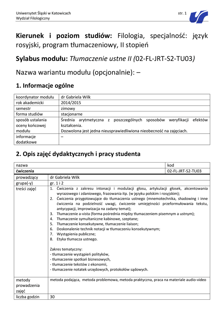 Uniwersytet Śląski w Katowicach Wydział Filologiczny str. 1 Kierunek i poziom studiów: Filologia, specjalność: język rosyjski, program tłumaczeniowy, II stopień Sylabus modułu: Tłumaczenie ustne II (02-FL-JRT-S2-TU03) Nazwa wariantu modułu (opcjonalnie): – 1. Informacje ogólne koordynator modułu rok akademicki semestr forma studiów sposób ustalania oceny końcowej modułu informacje dodatkowe dr Gabriela Wilk 2014/2015 zimowy stacjonarne Średnia arytmetyczna z poszczególnych sposobów weryfikacji efektów kształcenia. Dozwolona jest jedna nieusprawiedliwiona nieobecność na zajęciach. – 2. Opis zajęć dydaktycznych i pracy studenta nazwa ćwiczenia prowadzący grupa(-y) treści zajęć kod 02-FL-JRT-S2-TU03 dr Gabriela Wilk gr. 1 i 2 1. Ćwiczenia z zakresu intonacji i modulacji głosu, artykulacji głosek, akcentowania wyrazowego i zdaniowego, frazowania itp. (w języku polskim i rosyjskim); 2. Ćwiczenia przygotowujące do tłumaczenia ustnego (mnemotechnika, shadowing i inne ćwiczenia na podzielność uwagi, ćwiczenie umiejętności przeformułowania tekstu, antycypacji, improwizacja na zadany temat); 3. Tłumaczenie a-vista (forma pośrednia między tłumaczeniem pisemnym a ustnym); 4. Tłumaczenie symultaniczne kabinowe, szeptane; 5. Tłumaczenie konsekutywne, tłumaczenie liaison; 6. Doskonalenie technik notacji w tłumaczeniu konsekutywnym; 7. Wystąpienia publiczne; 8. Etyka tłumacza ustnego. Zakres tematyczny: - tłumaczenie wystąpień polityków, - tłumaczenie spotkań biznesowych, - tłumaczenie tekstów z ekonomii, - tłumaczenie notatek urzędowych, protokołów sądowych. metody prowadzenia zajęć liczba godzin metoda podająca, metoda problemowa, metoda praktyczna, praca na materiale audio-video 30 Uniwersytet Śląski w Katowicach Wydział Filologiczny dydaktycznych (kontaktowych) liczba godzin pracy własnej studenta opis pracy własnej studenta organizacja zajęć literatura obowiązkowa literatura uzupełniająca adres strony www zajęć informacje dodatkowe str. 2 52 Samodzielna realizacja wskazanych partii materiału, sporządzanie słowniczków tematycznych, doskonalenie umiejętności translatorskich ćwiczonych na zajęciach. 1 zajęcia w tygodniu. Wielkość jednostki zajęć: 90 minut. Jednostki kontaktowe zgodnie z harmonogramem zajęć Instytutu Filologii Wschodniosłowiańskiej Uniwersytetu Śląskiego. Zajęcia odbywają się w laboratorium językowym. 1. Gillies A., Tłumaczenie ustne, Kraków 2004. 2. Gillies A., Sztuka notowania: Poradnik dla tłumaczy konferencyjnych, Kraków 2007. 3. Tryuk M., Przekład ustny konferencyjny, Warszawa 2007. 4. Tryuk M., Przekład ustny środowiskowy, Warszawa 2006. 5. Алексеева И.С., Профессиональный тренинг переводчика, Санкт Петербург 2005. 6. Аликина Е.В., Переводческая семантография. Запись при устном переводе, Москва 2007. 7. Миньяр-Белоручев Р.К., Записи в последовательном переводе, Москва 2005. 1. Lipiński K., Vademecum tłumacza, Kraków 2005. 2. Między oryginałem a przekładem, t. 12, red. M. Filipowicz-Rudek, Kraków 2006. 3. Rozan J.F., Notatki w tłumaczeniu konsekutywnym, Kraków 2004. 4. Teoria i dydaktyka przekładu konferencyjnego, red. M. Tryuk, Warszawa 2006. – – 3. Opis sposobów weryfikacji efektów kształcenia modułu nazwa Kolokwium zaliczeniowe kod 02-FL-JRT-S2-TU03_w_1 kod(-y) zajęć osoba(-y) przeprowadzająca(e) weryfikację grupa(-y) wymagania merytoryczne kryteria oceny dr Gabriela Wilk gr. 1 i 2 Opanowanie słownictwa właściwego dla tłumaczonego tekstu i poprawne go zastosowanie. Przy wystawianiu oceny za każdy przetłumaczony tekst brane są pod uwagę następujące kryteria jakości: - przekazanie sensu tłumaczonej wypowiedzi; - słownictwo – zastosowanie właściwej terminologii; - styl wypowiedzi; - poprawność gramatyczna wypowiedzi; Uniwersytet Śląski w Katowicach Wydział Filologiczny str. 3 - poprawność fonetyczna, intonacyjna, płynność wypowiedzi. przebieg procesu weryfikacji Tłumaczenie a vista tekstów z języka rosyjskiego na język polski oraz z języka polskiego na język rosyjski. Sprawdzenie tłumaczenia tekstu, który był zadany do przygotowania w parach. informacje dodatkowe – nazwa kod 02-FL-JRT-S2-TU03_w_2 Egzamin kod(-y) zajęć osoba(-y) przeprowadzająca(e) weryfikację grupa(-y) wymagania merytoryczne kryteria oceny przebieg procesu weryfikacji informacje dodatkowe dr Gabriela Wilk gr. 1 i 2 Opanowanie słownictwa właściwego dla tekstów przewidzianych w treściach programowych przedmiotu i poprawne go zastosowanie. Umiejętność zastosowania właściwej strategii w tłumaczeniu symultanicznym i konsekutywnym. Umiejętność sporządzania notatek w tłumaczeniu konsekutywnym. Warunkiem przystąpienia do egzaminu jest uzyskanie zaliczenia z ćwiczeń (otrzymanie pozytywnej oceny z kolokwium zaliczeniowego). Ocena z egzaminu jest wypadkową ocen z tłumaczenia czterech tekstów. Przy wystawianiu oceny za każdy przetłumaczony tekst brane są pod uwagę następujące kryteria jakości: - przekazanie sensu tłumaczonej wypowiedzi; - słownictwo – zastosowanie właściwej terminologii; - styl wypowiedzi; - poprawność gramatyczna wypowiedzi; - poprawność fonetyczna, intonacyjna, płynność wypowiedzi. Tłumaczenie ustne czterech tekstów: tłumaczenie konsekutywne dwóch tekstów, jednego z języka rosyjskiego na polski, drugiego z języka polskiego na rosyjski oraz tłumaczenie symultaniczne dwóch tekstów, jednego z języka rosyjskiego na polski, drugiego z języka polskiego na rosyjski. Egzamin odbywa się zgodnie z harmonogramem zimowej sesji egzaminacyjnej w Instytucie Filologii Wschodniosłowiańskiej Uniwersytetu Śląskiego. Zostaje przeprowadzony w laboratorium językowym i jest rejestrowany za pomocą urządzenia zapisuj