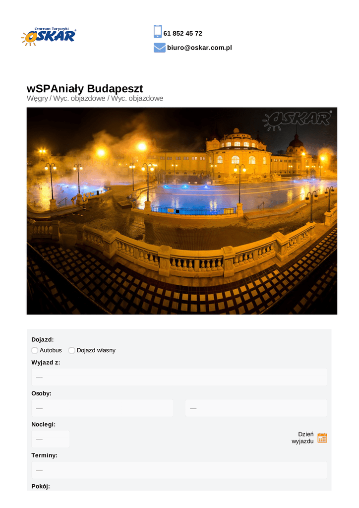 61 852 45 72 [email protected] wSPAniały Budapeszt Węgry / Wyc. objazdowe / Wyc. objazdowe Dojazd: Autobus Dojazd własny Wyjazd z: Osoby: Noclegi: Dzień wyjazdu Terminy: Pokój: Wyżywienie: Najtańsza oferta First Minute cena promocyjna cena katalogowa do 6 marca 2017: 89,10 zł do 6 marca 2017: 89,10 zł do 6 marca 2017: 158,10 zł do 12 października 2017: 207,90 zł do 12 października 2017: 207,90 zł do 12 października 2017: 368,90 zł Suma: 297,00 zł Suma: 297,00 zł Suma: 527,00 zł Opis oferty Miejscowość TOUR GUIDE oprowadzanie z indywidualnym systemem nagłośnieniowym Opinie Mobilny zestaw audio: indywidulany zestaw słuchawkowy połączony bezprzewodowo z mikrofonem pilota/przewodnika. Rozkład jazdy Zakwaterowanie Hotel Árpád Tatabánya*** - hotel położony w miejscowości Tatabánya, leżącej ok. 50 km od centrum Budapesztu, przy autostradzie M1 w kierunku Wiednia. Obiekt oferuje kameralną atmosferę oraz zakwaterowanie w stylowo urządzonych pokojach z łazienkami, klimatyzacją, telewizją satelitarną, dostępem do Internetu. Przykładowe zakwaterowanie, które może różnić się w poszczególnych terminach. Dostępne opcje zakwaterowania: pokój 2 - osobowy pokój 3 - osobowy dokwaterowanie (bez dopłat*) lub pokój 1 osobowy (dopłata) * dokwaterowanie: osoby wybierając się pojedynczo, które w momencie rezerwacji nie dokonują dopłaty do pokoju jednoosobowego, mogą zostać zakwaterowane z jedną lub kilkoma osobami tej samej płci w tzw. opcji dokwaterowania; jednakże w przypadku braku innej rezerwacji w opcji dokwaterowania w terminie do 7 dni przed rozpoczęciem imprezy wymagana jest dopłata do pokoju 1 osobowego Dostępne opcje wyżywienia wyżywienie HB: 1 śniadanie i 1 obiadokolacja śniadania bufet: pieczywo różne, ser twardy, serki topione, szynka, kiełbasy paprykowane, salami, jajecznica/jaja sadzone, parówki/ kiełbaski pieczone, boczek smażony, fasolka w sosie pomidorowym, warzywa świeże, płatki kukurydziane/musli, owoce/jogurty owocowe/ciasta/biszkopty, kawa, herbata, sok, mleko obiadokolacje serwowane: zupa/przystawka, danie główne, deser, woda stołowa; napoje do obiadokolacji dodatkowo płatne Pakiet KOMFORT gwarancja wyboru miejsca w autokarze napoje w autokarze w cenie (6 x do wyboru: kawa, herbata, zimny napój 0,2l) cena: 50 zł/os Karta Dużej Rodziny www.oskar.com.pl/zalaczniki/karta_duzej_rodziny Warunki promocji FIRST MINUTE www.oskar.com.pl/zalaczniki/warunki_promocji Ubezpieczenie Warunki ubezpieczenia Bezpieczne Podróże Signal Iduna dokument do pobrania www.oskar.com.pl/zalaczniki/owu Warunki ubezpieczenia Kosztów Imprezy Turystycznej Signal Iduna dokument do pobrania www.oskar.com.pl/zalaczniki/owurg Turystyczny Fundusz Gwarancyjny W związku z powołaniem do życia w dniu 26.11.2016 Turystycznego Funduszu Gwarancyjnego każdy klient Biura Podróży Oskar zobowiązany jest do zapłaty kwoty w wysokości 10zł/os. przy każdorazowej rezerwacji imprezy turystycznej (obowiązuje od dnia 26.11.2016). Kwota przeznaczona na Turystyczny Fundusz Gwarancyjny zostanie automatycznie doliczona do wartości rezerwacji (w momencie jej dokonania). Wyjątkiem są imprezy turystyczne odbywające się w krajach posiadających granicę z Rzeczpospolitą Polską. Składka nie jest przychodem biura. Udogodnienia Klimatyzacja Regulowane fotele Tacki Nowoczesna flota Zawodowy kierowca Pasy bezpieczeństwa Toaleta w autokarze Podnóżki City breaks Dla rodzin z dziećmi Wi-Fi Bez paszportu Tour guide Wellness/SPA Program ramowy Dzień 1 Wyjazd z Polski zgodnie z rozkładem jazdy. Dzień 2 Przyjazd do Budapesztu przed południem. Spotkanie z przewodnikiem i całodzienne zwiedzanie miasta. W programie zwiedzania: Wzgórze Gellérta (panorama miasta) oraz Wzgórze Zamkowe (rejon Zamku Budańskiego i starówki - Kościół Matyasa, Baszty Rybackie), Parlament, Bazylika Św. Stefana, czas wolny w sercu miasta: spacer, możliwość posiłku, zakupów. Obiadokolacja. Czas wolny. Po obiadokolacji kontynuacja Zakawaterowanie. Nocleg. zwiedzania i nocny rejs po Dunaju. Przejazd do hotelu. Dzień 3 Śniadanie. Wykwaterowanie. Przejazd na termy. Czas wolny w kompleksie basenowo - termalnym w Budapeszcie: Szechenyi Fürdo - czas pobytu ok. 3-4h, dla pozostałych osób czas wolny. Zbiórka pod termami ok. godz. 13:00. Wyjazd w drogę powrotną do Polski. Przejazd przez Słowację, Czechy. Przyjazd do poszczególnych miast zgodnie z rozkładem jazdy. Cena obejmuje przejazd autokarem klasy LUX (klimatyzacja, DVD, WC, barek) zakwaterowanie: 1 nocleg w hotelu *** wyżywienie HB: 1 śniadanie i 1 obiadokolacja ubezpieczenie Signal Iduna KL 10000 €, NNW 10000 zł, bagaż (utrata 500 zł) opiekę pilota realizację programu w oparciu o system TOUR GUIDE Cena nie obejmuje Dopłaty wymagane na miejscu koszty programowe: 25 euro/os (opłata za usługę przewodnicką, wieczorny rejs po Dunaju oraz opłaty lokalne) - płatne u pilota w autokarze, opłata nie podlega rozliczeniu fakultatywny bilet wstępu do term: około 20 euro/os Dopłaty opcjonalne ubezpieczenie od chorób przewlekłych i nowotworowych KL 20000 euro, NNW 10000 zł, bagaż (utrata 500 zł): 60 zł/os ubezpieczenie od kosztów rezygnacji: 3,5% wartości rezerwacji Informacje dodatkowe program jest programem ramowym – kolejność realizacji może ulec zmianie lub odwróceniu pilot nie oprowadza po obiektach muzealnych, centrach historycznych i innych obiektach turystycznych program obejmuje zwiedzanie obiektów z zewnątrz; zwiedzanie wewnątrz w indywidualnym zakresie w ramach czasu wolnego cena nie obejmuje dodatkowych posiłków, napoi oraz wydatków własnych dokumenty: dowód osobisty lub paszport zaleca się wyrobienie karty EKUZ Chcesz wiedzieć szybciej? Polub nas na facebooku OSKAR Sp. z o.o. pl.Wolności 2/4c, 61-738 Poznań Potrzebujesz pomocy? Zadzwoń lub napisz: 61 852 45 72 [email protected] Zadzwoń Projekt i wdrożenie: Simply User