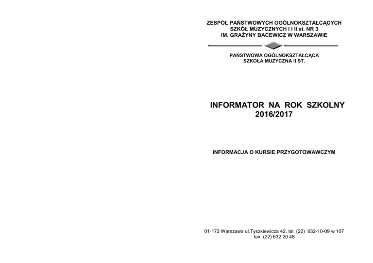 ZESPÓŁ PAŃSTWOWYCH OGÓLNOKSZTAŁCĄCYCH SZKÓŁ MUZYCZNYCH I i II st. NR 3 IM. GRAŻYNY BACEWICZ W WARSZAWIE PAŃSTWOWA OGÓLNOKSZTAŁCĄCA SZKOŁA MUZYCZNA II ST. INFORMATOR NA ROK SZKOLNY 2016/2017 INFORMACJA O KURSIE PRZYGOTOWAWCZYM 01-172 Warszawa ul.Tyszkiewicza 42, tel. (22) 632-10-09 w 107 fax (22) 632 20 48 KURS PRZYGOTOWAWCZY Z KSZTAŁCENIA SŁUCHU KURS BĘDZIE ODBYWAŁ SIĘ W SOBOTY (8 SOBÓT) PIERWSZE ZAJĘCIA ZACZYNAJĄ SIĘ - 20 LUTEGO BR - SALA 50 (IV PIĘTRO) GODZ. 13.30 (2 GODZ. LEKCYJNE) 2 KRÓTKI ZARYS HISTORYCZNY Zespół Państwowych Ogólnokształcących Szkół Muzycznych nr 3 im. Grażyny Bacewicz w Warszawie został powołany 1.09.1999 r. W jego skład wchodzi Państwowa Ogólnokształcąca Szkoła Muzyczna I st. oraz Państwowa Ogólnokształcąca Szkoła Muzyczna II st. Zespół wywodzi się z filii PPSM nr 1 im. Emila Młynarskiego w Warszawie. Filia utworzona 1.09.1965 r. mieściła się gościnnie w Szkole Podstawowej nr 148 przy ul. Ożarowskiej (dzielnica Wola). Naszą szkołę tworzyła wówczas jedyna 27-osobowa pierwsza klasa. W latach następnych przybywały kolejne - aż w roku 1972 osiągnęliśmy pełny, 8 letni cykl nauczania. W czerwcu 1973 opuściła nas grupa pierwszych absolwentów. W roku 1978 przyznano szkole budynek przy ul. Tyszkiewicza 42. Wtedy też została ona przekształcona z filii w jednostkę samodzielną: Państwową Ogólnokształcącą Szkołę Muzyczną I st. nr 3. W rok później odbyła się uroczystość nadania szkole imienia Grażyny Bacewicz. W roku 1999 szkoła została przekształcona w Zespół Państwowych Ogólnokształcących Szkół Muzycznych I i II st. nr 3 im. Grażyny Bacewicz. W roku szkolnym 2004/2005 odbył się pierwszy w historii szkoły egzamin dyplomowy i pierwsza matura. Do tej pory wszyscy przystępujący zdali te egzaminy. Naszą szkołę ukończyło do tej pory1602 uczniów na poziomie szkoły podstawowej i gimnazjum oraz 162 na poziomie matury. Wielu z nich studiuje na Akademiach Muzycznych w Polsce, inni już pracują w zawodzie muzyka jako soliści lub członkowie renomowanych orkiestr i zespołów kameralnych w kraju i za granicą. Obecnie do Zespołu Szkół uczęszcza 363 uczniów. Naucza w nim 124 pedagogów. 3 DZIAŁALNOŚĆ MUZYCZNA Przez wszystkie lata istnienia szkoła prowadziła szeroką działalność muzyczną. Jej uczniowie brali i biorą udział w konkursach regionalnych, ogólnopolskich i międzynarodowych, skąd często przywożą nagrody wyróżnienia czy wysoką punktację. Sukcesy odnosi podczas przesłuchań i festiwali chór szkolny. Orkiestra szkolna zdobyła duże uznanie w środowisku warszawskim. Szkoła jest organizatorem Spotkań Muzycznych Instrumentów Dętych. (od 1998 r), Międzyszkolnych Spotkań z Gitarą dla uczniów szkół muzycznych I st. , Ogólnopolskiego Konkursu Kontrabasowego im. Tadeusza Pelczara, warsztatów kontrabasowych, Mazowieckich Spotkań Pianistycznych z Feliksem Rybickim dla szkół I st., Ogólnopolskich Konfrontacji Duetów „Perkusja i....”. Była też organizatorem Makroregionalnych Przesłuchań Instrumentów Dętych szkół I st. oraz II st., Ogólnopolskich Przesłuchań Instrumentów Dętych, Makroregionalnych Przesłuchań Klas Gitary szkół II st.. oraz Makroregionalnych Przesłuchań Klas Skrzypiec i Altówki szkół II st. pod Patronatem Centrum Edukacji Artystycznej W ciągu roku szkolnego odbywają się 3-4 duże koncerty poza Szkołą w różnych salach koncertowych i widowiskowych Warszawy m.in. Uniwersytetu Muzycznego, Sali Balowej zamku Królewskiego, na Woli „Wolska Jesień Kultury”. Uczniowie Szkoły biorą też udział w różnych audycjach i konkursach szkolnych. Szkoła łącznie z Fundacją Harmonia im. Grażyny Bacewicz była też współorganizatorem Międzynarodowych Wilanowskich Spotkań Szkół Muzycznych (2006, 2007). W 2009 organizowane jest wspólnie z Dzielnicą Warszawa-Wola Międzynarodowe Wolskie Forum Młodych Muzyków im. Grażyny Bacewicz w związku z 100 rocznicą urodzin i 40 rocznicą śmierci Patronki Szkoły. Również w roku 2009 szkoła wystawiła widowisko muzyczne Księżniczka Ramona. W 2010 roku wspólnie z Dzielnicą – Wola zorganizowała centralne w Dzielnicy obchody Roku Chopinowskiego – Koncert Inauguracyjny i 4 Koncert Galowy. W marcu 2012 roku szkoła zorganizowała II Międzynarodowe Forum Młodych Muzyków, w ramach którego odbył się koncert kompozytorski uczniów oraz koncert galowy na Zamku Królewskim w Warszawie. Szkoła szczyci się Koncertami Kompozytorskimi organizowanymi przez Uczniów. DZIAŁALNOŚĆ OGÓLNOKSZTAŁCĄCA Drugim, równoległym obok muzycznego, blokiem programowym Szkoły jest blok ogólnokształcący. Tak więc całe kształcenie od I do XII klasy odbywa się pod jednym dachem. Zakres programu ogólnokształcącego i liczba zajęć lekcyjnych jest taka jak w szkołach rejonowych i gimnazjach oraz liceach ogólnokształcących. Szkoła wyposażona jest w nowoczesną pracownię multimedialną i informatyczną. Szkoła naucza języka angielskiego oraz niemieckiego lub rosyjskiego. Wyniki egzaminów zewnętrznych po III klasach gimnazjalnych i maturalnych warszawskich. Uczniowie ogólnoprzedmiotowe, lokują Zespół w gronie najlepszych szkół Szkoły chociażby wygrywają „Kangur też różne matematyczny” czy konkursy konkurs historyczny „Krąg”, Konkursy Polonistyczne. Są też laureatami olimpiad. Wśród uczniów Szkoły mamy Stypendystów stypendium Prezesa Rady Ministrów, Ministra Kultury i Dziedzictwa Narodowego, Krajowego Funduszu na Rzecz Dzieci. Od 2014 r. Szkoła szczyci się nowym wybudowanym w 2014 r. wielofunkcjonalnym boiskiem szkolnym. Szkoła organizuje wycieczki, wyjścia do teatrów, kin, na wystawy, lekcje muzealne. Uczniowie pod kierunkiem nauczycieli przygotowują przedstawienia teatralne, na które czasem zapraszają szkoły i przedszkola z sąsiedztwa, uczestniczą też z dużym powodzeniem w teatralnych konkursach dz