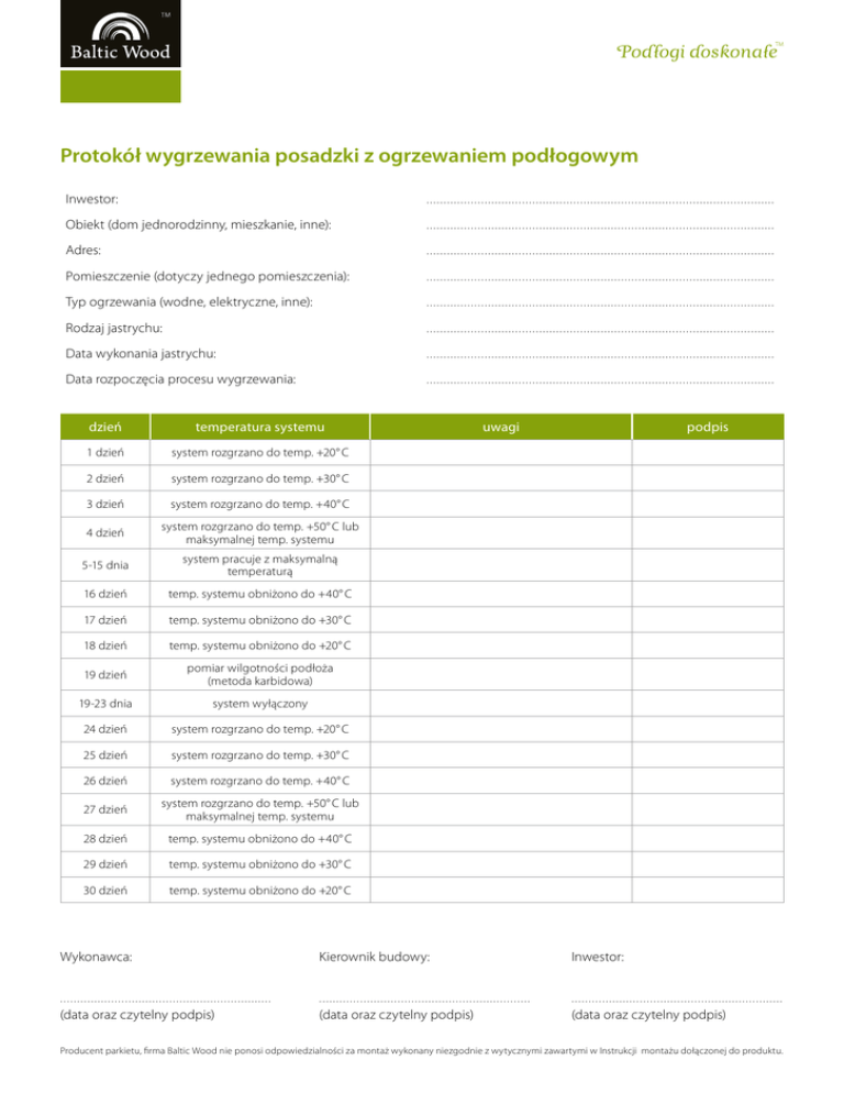 Protokół wygrzewania posadzki z ogrzewaniem podłogowym Inwestor: ...................................................................................................... Obiekt (dom jednorodzinny, mieszkanie, inne): ...................................................................................................... Adres: ...................................................................................................... Pomieszczenie (dotyczy jednego pomieszczenia): ...................................................................................................... Typ ogrzewania (wodne, elektryczne, inne): ...................................................................................................... Rodzaj jastrychu: ...................................................................................................... Data wykonania jastrychu: ...................................................................................................... Data rozpoczęcia procesu wygrzewania: ...................................................................................................... dzień temperatura systemu 1 dzień system rozgrzano do temp. +20° C 2 dzień system rozgrzano do temp. +30° C 3 dzień system rozgrzano do temp. +40° C 4 dzień system rozgrzano do temp. +50° C lub maksymalnej temp. systemu 5-15 dnia system pracuje z maksymalną temperaturą 16 dzień temp. systemu obniżono do +40° C 17 dzień temp. systemu obniżono do +30° C 18 dzień temp. systemu obniżono do +20° C 19 dzień pomiar wilgotności podłoża (metoda karbidowa) 19-23 dnia system wyłączony 24 dzień system rozgrzano do temp. +20° C 25 dzień system rozgrzano do temp. +30° C 26 dzień system rozgrzano do temp. +40° C 27 dzień system rozgrzano do temp. +50° C lub maksymalnej temp. systemu 28 dzień temp. systemu obniżono do +40° C 29 dzień temp. systemu obniżono do +30° C 30 dzień temp. systemu obniżono do +20° C uwagi podpis Wykonawca: Kierownik budowy: Inwestor: .............................................................. .............................................................. .............................................................. (data oraz czytelny podpis) (data oraz czytelny podpis) (data oraz czytelny podpis) Producent parkietu, firma Baltic Wood nie ponosi odpowiedzialności za montaż wykonany niezgodnie z wytycznymi zawartymi w Instrukcji montażu dołączonej do produktu.