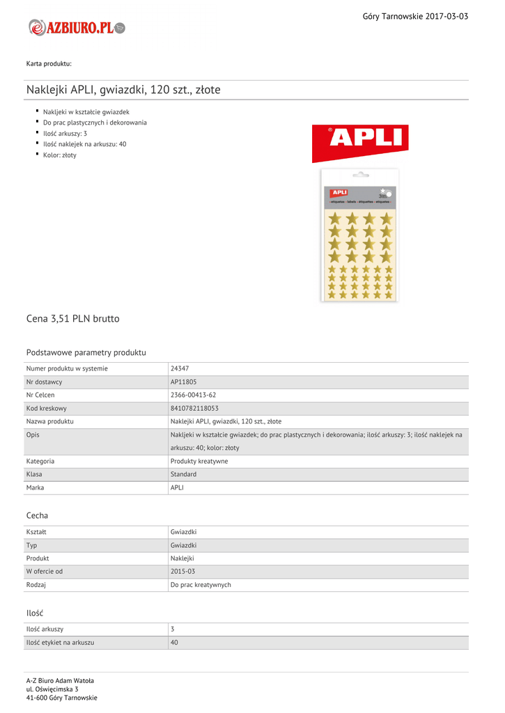 Góry Tarnowskie 2017-03-03 Karta produktu: Naklejki APLI, gwiazdki, 120 szt., złote Nakljeki w kształcie gwiazdek Do prac plastycznych i dekorowania Ilość arkuszy: 3 Ilość naklejek na arkuszu: 40 Kolor: złoty Cena 3,51 PLN brutto Podstawowe parametry produktu Numer produktu w systemie 24347 Nr dostawcy AP11805 Nr Celcen 2366-00413-62 Kod kreskowy 8410782118053 Nazwa produktu Naklejki APLI, gwiazdki, 120 szt., złote Opis Nakljeki w kształcie gwiazdek; do prac plastycznych i dekorowania; ilość arkuszy: 3; ilość naklejek na arkuszu: 40; kolor: złoty Kategoria Produkty kreatywne Klasa Standard Marka APLI Cecha Kształt Gwiazdki Typ Gwiazdki Produkt Naklejki W ofercie od 2015-03 Rodzaj Do prac kreatywnych Ilość Ilość arkuszy 3 Ilość etykiet na arkuszu 40 A-Z Biuro Adam Watoła ul. Oświęcimska 3 41-600 Góry Tarnowskie Góry Tarnowskie 2017-03-03 Karta katalogowa produktu cd. Naklejki APLI, gwiazdki, 120 szt., złote Certyfikaty Nowy produkt w ofercie Standard Hit Standard Kolor Kolor Serdecznie zapraszamy do współpracy A-Z Biuro Adam Watoła zespół. A-Z Biuro Adam Watoła ul. Oświęcimska 3 41-600 Góry Tarnowskie Złoty