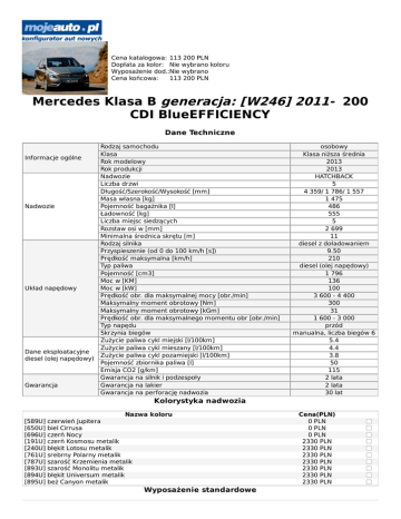 Cena katalogowa: 113 200 PLN Dopłata za kolor: Nie wybrano koloru Wyposażenie dod.:Nie wybrano Cena końcowa: 113 200 PLN Mercedes Klasa B generacja: [W246] 2011- 200 CDI BlueEFFICIENCY Dane Techniczne Informacje ogólne Nadwozie Układ napędowy Dane eksploatacyjne diesel (olej napędowy) Gwarancja Rodzaj samochodu Klasa Rok modelowy Rok produkcji Nadwozie Liczba drzwi Długość/Szerokość/Wysokość [mm] Masa własna [kg] Pojemność bagażnika [l] Ładowność [kg] Liczba miejsc siedzących Rozstaw osi w [mm] Minimalna średnica skrętu [m] Rodzaj silnika Przyspieszenie (od 0 do 100 km/h [s]) Prędkość maksymalna [km/h] Typ paliwa Pojemność [cm3] Moc w [KM] Moc w [kW] Prędkość obr. dla maksymalnej mocy [obr./min] Maksymalny moment obrotowy [Nm] Maksymalny moment obrotowy [kGm] Prędkość obr. dla maksymalnego momentu obr [obr./min] Typ napędu Skrzynia biegów Zużycie paliwa cykl miejski [l/100km] Zużycie paliwa cykl mieszany [l/100km] Zużycie paliwa cykl pozamiejski [l/100km] Pojemność zbiornika paliwa [l] Emisja CO2 [g/km] Gwarancja na silnik i podzespoły Gwarancja na lakier Gwarancja na perforację nadwozia osobowy Klasa niższa średnia 2013 2013 HATCHBACK 5 4 359/ 1 786/ 1 557 1 475 486 555 5 2 699 11 diesel z doładowaniem 9.50 210 diesel (olej napędowy) 1 796 136 100 3 600 - 4 400 300 31 1 600 - 3 000 przód manualna, liczba biegów 6 5.4 4.4 3.8 50 115 2 lata 2 lata 30 lat Kolorystyka nadwozia [589U] [650U] [696U] [191U] [240U] [761U] [787U] [893U] [894U] [895U] Nazwa koloru czerwień Jupitera biel Cirrusa czerń Nocy czerń Kosmosu metalik błękit Lotosu metalik srebrny Polarny metalik szarość Krzemienia metalik szarość Monolitu metalik błękit Universum metalik beż Canyon metalik Wyposażenie standardowe Cena(PLN) 0 PLN 0 PLN 0 PLN 2330 PLN 2330 PLN 2330 PLN 2330 PLN 2330 PLN 2330 PLN 2330 PLN Nazwa elementu 15" obręcze stalowe (195/65 R15) 3-punktowe pasy bezpieczeństwa 3-ramienna komfortowa kierownica wielofunkcyjna z 12 przyciskami obsługowymi 8 głośników ABS - system zapobiegający blokowaniu kół podczas hamowania adaptacyjne światło hamowania, migające aktywne oświetlenie wypadkowe antena radia zintegrowana w tylnym spoilerze apteczka ASR - układ zapobiegający poślizgowi kół napędzanych asystent ruszania na wzniesieniu asystent układu hamulcowego BAS atermiczne szyby w kolorze zielonym (komplet), łącznie z szybą tylną z bezpiecznego szkła audio 20 CD automatyczny układ włączania świateł w zależności od jasności otoczenia Collision Prevention Assist dolna część deski rozdzielczej w kolorze wyposażenia dolna część deski w kolorze wnętrza dwutonowy sygnał dźwiękowy elektroniczny kluczyk ozdobny, chromowany elektryczne podnośniki szyb tylnych, 4x, z funkcją otwierania letniego i komfortowego zamykania elektrycznie sterowane szyby elektryczny hamulec postojowy elektryczny hamulec postojowy z funkcją komfortowej obsługi (automatyczne zwalnianie przy ruszaniu) elementy ozdobne z wzorem matrycowym ESP elektroniczny system stabilizujący jazdę funkcja ECO Start-Stop gniazda USB i Aux-In hamulce tarczowe przy wszystkich kołach immobilizer elektroniczny, z systemem zamykania pilotem radiowym i optyczną informacją o zamknięciu kierunkowskazy z komfortowym przełącznikiem impulsowym klamki drzwi w kolorze nadwozia klimatyzacja kolumna kierownicy z mechaniczną regulacją długości i wysokości komfortowy układ jezdny komputer podróżny na wyświetlaczu wielofunkcyjnym z wskaźnikiem chwilowego zużycia paliwa (obsługa za pomocą kierownicy) kurtyny powietrzne LED- światła do jazdy dziennej w technologii LED lusterka zewnętrzne z lewej i prawej strony podgrzewane, regulowane elektrycznie od wewnątrz, asferyczne, ze zintegrowanymi kierunkowskazami mechaniczne zabezpieczenia tylnych drzwi przed otwieraniem przez dzieci mocowania fotelików dziecięcych ISOFIX i dodatkowe mocowania TopTether na oparciach siedzeń tylnych u góry obrotomierz opony letnie osłona przestrzeni bagażowej (roleta) oświetlenie bagażnika parametryczny układ kierowniczy ze wspomaganiem siły kierowania zależnym od prędkości jazdy podłokietnik dla kierowcy i pasażera obok ze schowkiem pod spodem podłokietnik przedni podsufitka materiałowa szara poduszka biodrowa poduszka kolanowa poduszka powietrzna chroniąca miednicę poduszka powietrzna dla kierowcy i pasażera obok poduszka powietrzna nadokienna reflektory odblaskowe reflektory przednie regulacja wysokości fotela kierowcy schowek w desce rozdzielczej z oświetleniem schowek w konsoli centralnej składane, dzielone, oparcie kanapy (1/3:2/3) sterowanie systemami telematycznymi na tunelu środkowym sterownik na konsoli środkowej sygnał dźwiękowy ostrzegający o niewyłączeniu oświetlenia pojazdu system aktywnego serwisowania pojazdu - Assyst system attention assit system kontroli ciśnienia w oponach szyba przednia z zespolonego szkła szyba tylna podgrzewana, ze sterowaniem czasowym światła do jazdy dziennej LED, okrągłe tapicerka materiałowa: czarna Venlo black technologia EU5 trójkąt ostrzegawczy trzecie światło stopu w technologii LED tylne światło przeciwmgielne uchwyty do mocowania przewożonych przedmiotów, 4 sztuki uchwyty pasów z przełącznikiem układ kontroli awarii oświetlenia układ rozpoznawania obecności pasażera na siedzeniu obok kierowcy wielofunkcyjna kierownica Luxury wieszaki na torby wskaźnik poziomu płynów (paliwo, olej, płyn chłodzący i płyn spryskiwacza) wskaźnik przełączania biegów wskaźnik zużycia okładzin hamulcowych wspomaganie układu kierowniczego z bezpieczną kolumną kierownicy wycieraczka szyb z dwoma stopniami czułości wycieraczka szyby przedniej z funkcją wycierania impulsowego wycieraczka szyby tylnej z regulacją częstotliwości wycierania, włączana automatycznie podczas jazdy na biegu wstecznym wykończenie elementów wnętrza: matrix look zamek centralny z przełącznikiem wewnętrzn