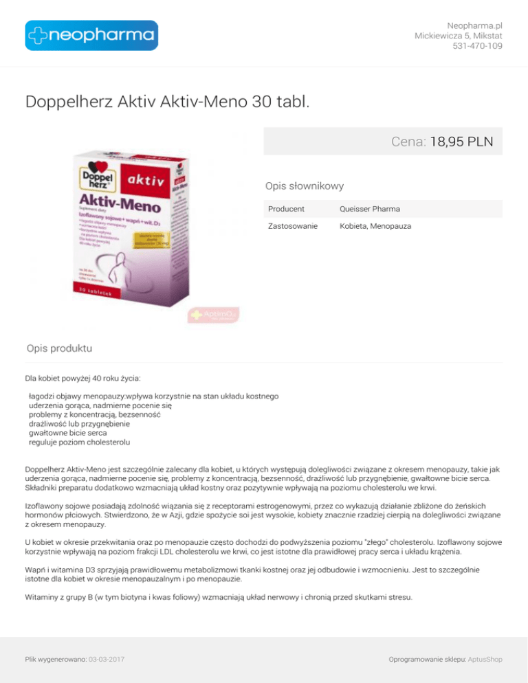Neopharma.pl Mickiewicza 5, Mikstat 531-470-109 Doppelherz Aktiv Aktiv-Meno 30 tabl. Cena: 18,95 PLN Opis słownikowy Producent Queisser Pharma Zastosowanie Kobieta, Menopauza Opis produktu Dla kobiet powyżej 40 roku życia: łagodzi objawy menopauzy:wpływa korzystnie na stan układu kostnego uderzenia gorąca, nadmierne pocenie się problemy z koncentracją, bezsenność drażliwość lub przygnębienie gwałtowne bicie serca reguluje poziom cholesterolu Doppelherz Aktiv-Meno jest szczególnie zalecany dla kobiet, u których występują dolegliwości związane z okresem menopauzy, takie jak uderzenia gorąca, nadmierne pocenie się, problemy z koncentracją, bezsenność, drażliwość lub przygnębienie, gwałtowne bicie serca. Składniki preparatu dodatkowo wzmacniają układ kostny oraz pozytywnie wpływają na poziomu cholesterolu we krwi. Izoflawony sojowe posiadają zdolność wiązania się z receptorami estrogenowymi, przez co wykazują działanie zbliżone do żeńskich hormonów płciowych. Stwierdzono, że w Azji, gdzie spożycie soi jest wysokie, kobiety znacznie rzadziej cierpią na dolegliwości związane z okresem menopauzy. U kobiet w okresie przekwitania oraz po menopauzie często dochodzi do podwyższenia poziomu "złego" cholesterolu. Izoflawony sojowe korzystnie wpływają na poziom frakcji LDL cholesterolu we krwi, co jest istotne dla prawidłowej pracy serca i układu krążenia. Wapń i witamina D3 sprzyjają prawidłowemu metabolizmowi tkanki kostnej oraz jej odbudowie i wzmocnieniu. Jest to szczególnie istotne dla kobiet w okresie menopauzalnym i po menopauzie. Witaminy z grupy B (w tym biotyna i kwas foliowy) wzmacniają układ nerwowy i chronią przed skutkami stresu. Plik wygenerowano: 03-03-2017 Oprogramowanie sklepu: AptusShop Neopharma.pl Mickiewicza 5, Mikstat 531-470-109 Zachowaniu dobrego samopoczucia w okresie menopauzy oraz po menopauzie sprzyja prawidłowa, zrównoważona dieta oraz odpowiednia ilość ruchu. Skład: węglan wapnia,koncentrat sojowy z izoflawonami,skrobia ryżowa, dwutlenek krzemu (substancja przeciwzbrylająca), celuloza sproszkowana (wypełniacz), hydroksypropylometyloceluloza (składnik stosowany na powierzchnię), mono– i diglicerydy kwasów tłuszczowych (emulgator), stearynian wapnia (substancja przeciwzbrylająca), dwutlenek tytanu (barwnik), szelak i talk (substancje do stosowania na powierzchnię), cyjanokobalamina (wit. B12), chlorowodorek pirydoksyny (wit. B6), olej z oliwek, cholekalciferol (wit. D3), monoazotan tiaminy (wit. B1), ryboflawina (wit. B2), tlenki i wodorotlenki żelaza (barwniki), polisorbat 80 (emulgator), kwas foliowy, biotyna. Wartość energetyczna 1 tabletki: 0,9 kcal / 3,8 kJ. Masa 1 tabletki: 1,7 g. Informacja dla chorych na cukrzycę: 1 tabletka odpowiada 0,01 ww (wymiennika węglowodanowego). Dzienna porcja (1 tabletka) zawiera: Koncentrat sojowy 125 mg (w tym izoflawony sojowe: 50 mg) Wapń 500 mg (63% ZDS*) Witamina D3 5 μg (100% ZDS) Tiamina (wit. B1) 1,4 mg (127% ZDS) Ryboflawina (wit. B2) 1,6 mg (114% ZDS) Witamina B6 2,0 mg (143% ZDS) Witamina B12 3 μg (120% ZDS) Biotyna 150 μg (300% ZDS) Kwas foliowy 400 μg (200% ZDS) * % realizacji zalecanego dziennego spożycia (ZDS). Wart. energetyczna: 0,7 kcal / 3 kJ; białko: 0,001g, węglowodany: 0,087 g, tłuszcze: 0,029 g. Masa 1 tabletki: 1,69 g. Informacja dla chorych na cukrzycę: 1 tabletka odpowiada 0,008 jednostek chlebowych (BE). Sposób stosowania: Zażywać 1 tabletkę dziennie, popijając odpowiednią ilością płynu. Nie rozgryzać, nie ssać. Tabletkę można dzielić. Nie należy przekraczać zalecanej porcji (1 tabletka dziennie). Produkt uzupełnia dietę w izoflawony sojowe, wapń, wit. D3 i witaminy z grupy B. Suplementy diety nie mogą być stosowane w zastępstwie zróżnicowanej diety. Przechowywać w miejscu niedostępnym dla małych dzieci, w temperaturze do +25oC. Plik wygenerowano: 03-03-2017 Powered by TCPDF (www.tcpdf.org) Oprogramowanie sklepu: AptusShop