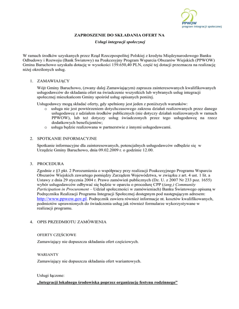 ZAPROSZENIE DO SKŁADANIA OFERT NA Usługi integracji społecznej W ramach środków uzyskanych przez Rząd Rzeczpospolitej Polskiej z kredytu Międzynarodowego Banku Odbudowy i Rozwoju (Bank Światowy) na Poakcesyjny Program Wsparcia Obszarów Wiejskich (PPWOW) Gmina Baruchowo uzyskała dotację w wysokości 159.650,40 PLN, część tej dotacji przeznacza na realizację niżej określonych usług. 1. ZAMAWIAJĄCY Wójt Gminy Baruchowo, (zwany dalej Zamawiającym) zaprasza zainteresowanych kwalifikowanych usługodawców do składania ofert na świadczenie wszystkich lub wybranych usług integracji społecznej mieszkańcom Gminy spośród usług opisanych poniżej. Usługodawcy mogą składać oferty, gdy spełniony jest jeden z poniższych warunków: o usługa nie jest powtórzeniem dotychczasowego zakresu działań realizowanych przez danego usługodawcę z udziałem środków publicznych (nie dotyczy działań realizowanych w ramach PPWOW), lub też dotyczy usług świadczonych przez tego usługodawcę na rzecz dodatkowych beneficjentów; o usługa będzie realizowana w partnerstwie z innymi usługodawcami. 2. SPOTKANIE INFORMACYJNE Spotkanie informacyjne dla zainteresowanych, potencjalnych usługodawców odbędzie się w Urzędzie Gminy Baruchowo, dnia 09.02.2009 r. o godzinie 12.00. 3. PROCEDURA Zgodnie z §3 pkt. 2 Porozumienia o współpracy przy realizacji Poakcesyjnego Programu Wsparcia Obszarów Wiejskich zawartego pomiędzy Zarządem Województwa, w związku z art. 4 ust. 1 lit. a Ustawy z dnia 29 stycznia 2004 r. Prawo zamówień publicznych (Dz. U. z 2007 Nr 233 poz. 1655) wybór usługodawców odbywać się będzie w oparciu o procedurę CPP ((ang.) Community Participation in Procurement – Udział społeczności w zamówieniach) Banku Światowego opisaną w Podręczniku Realizacji Programu Integracji Społecznej dostępnym pod następującym adresem: http://www.ppwow.gov.pl. Podręcznik zawiera również informacje nt. kosztów kwalifikowanych, podmiotów uprawnionych do świadczenia usług jak również formularze wykorzystywane w realizacji programu. 4. OPIS PRZEDMIOTU ZAMÓWIENIA OFERTY CZĘŚCIOWE Zamawiający nie dopuszcza składania ofert częściowych. WARIANTY Zamawiający nie dopuszcza składania ofert wariantowych. Usługi łączone: „Integracji lokalnego środowiska poprzez organizację festynu rodzinnego” Festyn ma pełnić rolę integracyjną poprzez włączenie mieszkańców od początku w przygotowania i realizację tej usługi. Podczas festynu muszą pojawić się elementy wspólnej aktywności, włączające ludzi z każdej grupy wiekowej i pozwalające na budowanie więzi pomiędzy poszczególnymi mieszkańcami gminy Baruchowo i okolic. Zadaniem festynu będzie integracja lokalnej społeczności poprzez uczestniczenie w różnego rodzaju formach kulturalnych, między innymi konkursy, programy artystyczne przygotowane przez dzieci, młodzież i dorosłych, lokalnych artystów jak również gwiazdy formatu krajowego. Termin wykonania zadania: sierpień 2009 rok Na realizację zadania przeznacza się maksymalnie kwotę 20.000,00 zł. Usługodawca zobowiązany jest do przedstawienia w ofercie informacji nt. spodziewanych rezultatów oferowanych usług, sposobu monitorowania ich osiągnięcia, przewidywanych działań informacyjnych, jak również informacji dotyczących zapewnienia trwałości podejmowanych działań. Podstawą dla płatności na rzecz usługodawcy będzie rzeczywiście zrealizowana liczba jednostek zdefiniowanych jako: [1 godzina/dzień/tydzień/miesiąc] pracy usługodawcy] / [wykonanie usług opisanych powyżej na rzecz 1 beneficjenta] 5. UPRAWNIENI USŁUGODAWCY Podmiotami uprawnionymi do ubiegania się o zamówienie w ramach niniejszej procedury są: 1. Organizacje pozarządowe (NGOs) 2. Organizacje kościelne 3. Prywatni usługodawcy: Firmy, osoby fizyczne, spółdzielnie socjalne, 4. Samorządy zawodowe, organizacje samorządu gospodarczego, izby rolnicze 5. Jednostki organizacyjne samorządu terytorialnego, stowarzyszenia jst i im podległe jednostki organizacyjne, 6. KRYTERIA OCENY TECHNICZNEJ a. zgodność z warunkami realizacji i zakresem zamawianych usług b. spójny program realizowanych zajęć Zamawiający oceni spełnienie powyższych minimalnych kryteriów technicznych w oparciu o następujące dokumenty/oświadczenia: Program zajęć Dokumenty potwierdzające kwalifikacje 7. PROCEDURY SKŁADANIA I OCENY OFERT SKŁADANIE OFERT a) Oferty techniczno-finansowe przygotowane z użyciem formularzy załączonych do niniejszego ogłoszenia, należy składać w zaklejonej kopercie osobiście lub za pośrednictwem poczty do Urzędu Gminy Baruchowo, pok. nr 2 w terminie do 25.02.2009 r., b) Oferta winna być ważna przez co najmniej 30 dni od daty określonej w pkt. a) c) Oferta winna być dostarczona w zamkniętej kopercie z dopiskiem „Oferta na świadczenie usług: Integracja lokalnego środowiska poprzez organizację festynu rodzinnego”, ponadto na kopercie winny zostać umieszczone dane adresowe Usługodawcy. OCENA OFERT 1. Ocena ofert i wybór najkorzystniejsze oferty odbywać się będzie w 3 etapach: a. Ocena spełniania minimalnych kryteriów technicznych określonych w pkt. 6 b. Wybór najkorzystniejszej oferty (ofert). Przy ocenie ofert, ustalaniu ich rankingu i podejmowaniu decyzji o udzieleniu zamówienia Komisja będzie brała pod uwagę zapisy przedstawionej oferty, współpracę z partnerami lokalnymi, oferowaną jakość usług, ich innowacyjność, trwałość, oraz ekonomiczność i efektywność działań zaproponowanych przez Usługodawcę. c. Negocjacje szczegółów umowy z wybranym(i) Usługodawcą (-ami) (jeśli takie negocjacje okażą się niezbędne), 2. Ostateczna decyzja dotycząca złożonych wniosków zostanie ogłoszona w ciągu 2 tygodni od wyznaczonego terminu składania ofert, poprzez umieszczenie jej na stronie internetowej Urzędu Gminy oraz na tablicy ogłoszeń. 3. Decyzja Zamawiającego jes