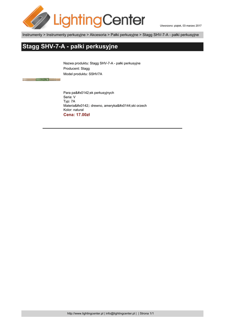 Utworzono: piątek, 03 marzec 2017 Instrumenty > Instrumenty perkusyjne > Akcesoria > Pałki perkusyjne > Stagg SHV-7-A - pałki perkusyjne Stagg SHV-7-A - pałki perkusyjne Nazwa produktu: Stagg SHV-7-A - pałki perkusyjne Producent: Stagg Model produktu: SSHV7A Para pałek perkusyjnych Seria: V Typ: 7A Materiał: drewno, amerykański orzech Kolor: natural Cena: 17.00zł http://www.lightingcenter.pl | [email protected] | | Strona 1/1