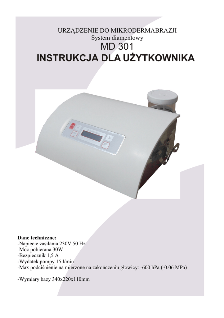 URZ¥DZENIE DO MIKRODERMABRAZJI System diamentowy MD 301 INSTRUKCJA DLA U¯YTKOWNIKA Dane techniczne: -Napiêcie zasilania 230V 50 Hz -Moc pobierana 30W -Bezpiecznik 1,5 A -Wydatek pompy 15 l/min -Max podciœnienie na mierzone na zakoñczeniu g³owicy: -600 hPa (-0.06 MPa) -Wymiary bazy 340x220x110mm UWAGA ! NINIEJSZY PODRÊCZNIK ODNOSI SIÊ TYLKO I WY£¥CZNIE DO OBS£UGI TECHNICZNEJ APARATU DO MIKRODERMABRAZJI. W ¯ADNYM WYPADKU NIE JEST PODRÊCZNIKIEM OPISUJ¥CYM METODYKÊ ZABIEGU MIKRODERMABRAZJI. ZAWARTE INFORMACJE DOTYCZ¥CE WYKONYWANIA ZABIEGU, PRZECIWWSKAZANIA I ZALECENIA PROSIMY TRAKTOWAÆ JAKO DODATKOW¥ INFORMACJÊ. URZ¥DZENIE PRZEZNACZONE JEST TYLKO DLA PROFESJONALISTÓW Z ODPOWIEDNIM PRZYGOTOWANIEM. PRODUCENT NIE PONOSI ¯ADNEJ ODPOWIEDZIALNOŒCI ZA NIEPRAWID£OWO PRZEPROWADZONE ZABIEGI ORAZ JAKIEKOLWIEK SZKODY SPOWODOWANE NIEPRAWID£OWYM POS£UGIWANIEM SIÊ URZ¥DZENIEM. UWAGI O BEZPIECZEÑSTWIE U¯YTKOWANIA Aby poprawnie u¿ytkowaæ (obs³ugiwaæ) sprzêt nale¿y dok³adnie zapoznaæ siê z treœci¹ podrêcznika u¿ytkownika. Prosimy zachowaæ niniejszy podrêcznik, by móc korzystaæ z zawartych w nim instrukcji i wskazówek równie¿ w przysz³oœci. UWAGA! Przeczytaj uwa¿nie niniejszy podrêcznik u¿ytkownika i postêpuj zgodnie z jego instrukcjami. Pamiêtaj, postêpowanie niezgodne do zaleceñ narusza twoje prawo do roszczeñ gwarancyjnych. OSTRZE¯ENIE! OTWARCIE OBUDOWY GROZI PORA¯ENIEM PR¥DEM. Aparat jest zasilany napiêciem z sieci. Wszelkie uszkodzenia przewodów i obudowy zagra¿aj¹ u¿ytkownikowi pora¿eniem pr¹dem, oraz mog¹ spowodowaæ powa¿ne uszkodzenie sprzêtu oraz powstanie po¿aru. Ka¿de uszkodzenie nale¿y niezw³ocznie zg³osiæ do serwisu. Urz¹dzenie musi byæ uziemione. OSTRZE¯ENIE! Aby unikn¹æ niebezpieczeñstwa po¿aru lub pora¿enia pr¹dem, nie wolno wystawiaæ sprzêtu na dzia³anie wody i nale¿y chroniæ go przed wilgoci¹. Nie wolno umieszczaæ sprzêtu w miejscach nara¿aj¹cych go na zroszenie (np. W pobli¿u saun, ³azienek), umieszczaæ na urz¹dzeniu przedmiotów zawieraj¹cych p³yny (np. Wazony, miseczki). UWAGA! Mikrodermabrazja jest absolutnie nie zalecana w nastêpuj¹cych przypadkach: -zaka¿enia bakteryjne: liszajec zakaŸny, figówka gronkowcowa -zaka¿enia wirusowe: brodawki, opryszczka, miêczak zakaŸny -zaka¿enia grzybicze -naczyniaki jamiste -tr¹dzik krostkowy, ropowiczy -tr¹dzik ró¿owaty -przeczosy, nad¿erki (uszkodzenia ci¹g³oœci skóry -sk³onnoœæ do keloidów (bliznowców) -nowotwory skóry i znamiona -zabiegi chirurgiczne w obrêbie twarzy (do 2 miesiêcy) -skóra powiek UWAGA! Przed zabiegiem zapytaj czy osoba nie jest uczulona na nikiel, chrom, z³oto. W przeciwnym razie nie wykonuj zabiegu. Przygotowanie nowego aparatu do pracy 1. Ustawiæ aparat na p³askiej stabilnej powierzchni. 2. Pod³¹czyæ przewód sieciowy do aparatu i gniazdka sieciowego. 3. Zamontowaæ wybran¹ koñcówkê na manipulator. 4. W³¹czyæ aparat przyciskiem z ty³u. 6. Ustawiæ w³aœciw¹ si³ê ssania 7. Aparat jest gotowy do pracy. Opis prze³¹czników, wskaŸników i regulacji aparatu. 1. Przycisk zmniejszania (-) 2 5 2. Przycisk zwiêkszania (+) 1 3. Wybór funkcji 4 4. Start Stop 3 5. Wyœwietlacz 6. Wy³¹cznik g³ówny Microdermabrasion 7. Gniazdo zasilania 8. Bezpiecznik Panel przedni 9. Przy³¹cze manipulatora pró¿nia 10. Filtr 10 START STOP MENU 6 9 7 widok œcianki tylnej 8 Wymiana koñcówki manipulatora Koñcówka manipulatora jest przykrêcana do r¹czki. Nale¿y zwróciæ uwagê aby dokrêcaæ koñcówkê do oporu, tak aby po³¹czenie by³o szczelne. G³owica do twarzy D-100 D-150 D-200 G³owica do nosa D-200 G³owica do nosa D-200 G³owica do szyji D-180 D-200 G³owica do cia³a D-100 D-180 Czyszczenie filtru Filtr nale¿y czyœciæ po ka¿dym zabiegu, a niekiedy kilkakrotnie podczas zabiegu. W tym celu nale¿y mocnym ruchem zdj¹æ pokrywê filtru (przeŸroczysty kubek), a nastêpnie wyczyœciæ pêdzelkiem wnêtrze pokrywki oraz sam filtr. Po wyczyszczeniu nale¿y za³o¿yæ pokrywê mocno j¹ wciskaj¹c na uszczelkê. Konserwacja Przed podjêciem jakichkolwiek czynnoœci konserwacyjnych nale¿y wy³¹czyæ wtyczkê zasilacza z gniazda sieciowego. Aparat oprócz czyszczenia filtru nie wymaga ¿adnych czynnoœci obs³ugowych. Obudowê mo¿na czyœciæ nawil¿on¹ szmatk¹, uwa¿aj¹c aby woda nie dosta³a siê do wnêtrza. Trudne zabrudzenia mo¿na usun¹æ benzyn¹ ekstrakcyjn¹ (nie wolno u¿ywaæ acetonu). LISTA TYPOWYCH USTEREK 1. Aparat siê nie w³¹cza - sprawdŸ czy w gniazdku jest pr¹d i czy aparat jest pod³¹czony do sieci. 2. Aparat siê nie w³¹cza - sprawdŸ bezpiecznik, w razie potrzeby zamontuj nowy (250V, 3,15A) 3.Pompa pracuje ale brak jest ssania - sprawdŸ czy wê¿yk miêdzy aparatem a manipulatorem nie jest uszkodzony, w razie uszkodzenia zamów nowy. Mo¿esz uci¹æ uszkodzony kawa³ek i nasun¹æ go ponownie na manipulator. SprawdŸ dokrêcenie g³owicy. 4. Pompa pracuje ale brak jest ssania - sprawdŸ czy dobrze jest za³o¿ona pokrywa filtru, sprawdŸ stan uszczelki. 5. Pompa pracuje, brak ssania na manipulatorze -dobrze wyczyœæ filtr.