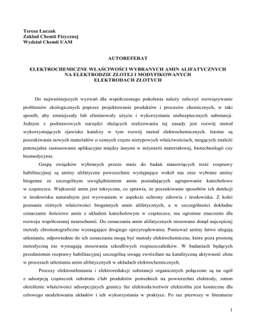 Teresa Łuczak Zakład Chemii Fizycznej Wydział Chemii UAM AUTOREFERAT ELEKTROCHEMICZNE WŁAŚCIWOŚCI WYBRANYCH AMIN ALIFATYCZNYCH NA ELEKTRODZIE ZŁOTEJ I MODYFIKOWANYCH ELEKTRODACH ZŁOTYCH Do najważniejszych wyzwań dla współczesnego pokolenia należy zaliczyć rozwiązywanie problemów ekologicznych poprzez projektowanie produktów i procesów chemicznych, w taki sposób, aby zmniejszały lub eliminowały użycie i wykorzystanie niebezpiecznych substancji. Jednym z podstawowych narzędzi służących realizowaniu tej zasady jest rozwój metod wykorzystujących zjawisko katalizy w tym rozwój metod elektrochemicznych. Istotne są poszukiwania nowych materiałów o cennych często nietypowych właściwościach, mogących znaleźć potencjalne zastosowanie aplikacyjne między innymi w inżynierii materiałowej, biotechnologii czy biomedycynie. Grupą związków wybranych przeze mnie do badań stanowiących treść rozprawy habilitacyjnej są aminy alifatyczne powszechnie występujące wokół nas oraz wybrane aminy biogenne ze szczególnym uwzględnieniem amin posiadających ugrupowanie katecholowe w cząsteczce. Większość amin jest toksyczna, co sprawia, że poszukiwanie sposobów ich detekcji w środowisku naturalnym jest wyzwaniem w aspekcie ochrony zdrowia i środowiska. Z kolei poznanie różnych właściwości biogennych amin alifatycznych, a w szczególności dokładne oznaczanie ilościowe amin z układem katecholowym w cząsteczce, ma ogromne znaczenie dla rozwoju współczesnej neurochemii. Do oznaczania amin alifatycznych stosowano dotąd najczęściej metody chromatograficzne wymagające drogiego oprzyrządowania. Ponieważ aminy łatwo ulegają utlenianiu, odpowiednie do ich oznaczania mogą być metody elektrochemiczne, które poza prostotą metodyczną nie wymagają stosowania szkodliwych rozpuszczalników. W badaniach będących przedmiotem rozprawy habilitacyjnej szczególną uwagę zwróciłam na katalityczną aktywność złota w procesach utleniania amin alifatycznych w układach elektrochemicznych. Procesy elektroutleniania i elektroredukcji substancji organicznych połączone są na ogół z adsorpcją cząsteczek substratu i/lub produktów pośrednich na powierzchni elektrody, zatem określenie właściwości adsorpcyjnych granicy faz elektroda/roztwór elektrolitu jest konieczne dla celowego modelowania układów i ich wykorzystania w praktyce. Po raz pierwszy w literaturze 1 określiłam parametry procesu adsorpcji i kinetykę utleniania szeregu amin alifatycznych i ich pochodnych na elektrodzie złotej. Na podstawie analizy pojemności różniczkowej podwójnej warstwy elektrycznej elektrody złotej w szerokim zakresie stężeń adsorbatu wykazałam, że właściwości adsorpcyjne amin są podobne w roztworach obojętnych i alkalicznych. Udowodniłam, że zależność między stężeniem powierzchniowym amin i ich stężeniem w głębi roztworu, przy stałym potencjale elektrody Au, może być opisana zarówno przez izotermę Frumkina, jak i przez izotermę Flory-Hugginsa. energetykę Scharakteryzowałam procesu adsorpcji szeregu homologicznego amin alifatycznych od C1 do C4 [metyloamina (MA), etyloamina (EA), propyloamina (PA), butyloamina (BA)], z uwzględnieniem izomerów położeniowych [izo-butyloamina (izo-BA, 2-butyloamina (2-BA)] oraz ich pochodnych (benzylooloamina (BEA), fenyloetyloamina (FEA), fenyloetanoloamina (FEtA), tyra mina (TYRA)], wykazując wzrost 0 bezwzględnej wartości swobodnej entalpii adsorpcji ( ΔG ad ) wraz ze wzrostem długości łańcucha węglowego w cząsteczce aminy, a także po wprowadzeniu podstawnika fenylowego lub benzylowego do łańcucha węglowego aminy, jak również przy obecności podstawnika hydroksylowego w podstawniku fenylowym lub w części alkilowej cząsteczki adsorbatu. 50 40 DG0ad kJmol-1 30 20 10 0 MA EA PA BA BEA FEA TYRA FEtA związek 0 Rys. 1. Schemat obrazujący bezwzględne wartości ∆G ad w zależności od budowy aminy alifatycznej. Udowodniłam, w wyniku równoległej analizy termodynamicznych parametrów adsorpcyjnych i widm wykonanych techniką powierzchniowo wzmocnionego rozproszenia Ramanowskiego (SERS) w warunkach in situ, że wraz ze wzrostem stopnia pokrycia elektrody następuje zwiększenie kąta nachylenia cząsteczek adsorbatu w stosunku do powierzchni elektrody i w konsekwencji zmiana 2 stałej równowagi adsorpcji. Tę część pomiarów wykonałam w Technische Universitäte ChemnitzZwickau, Institut für Chemie. w grupie badawczej Prof. dra. hab. Rudolfa Holze. Przeprowadzając badania adsorpcji amin na elektrodzie złotej przy zastosowaniu techniki tensammetrycznej wykazałam, wbrew opinii niektórych autorów, że metoda ta może być z powodzeniem stosowana dla uzyskania informacji o energetyce i o oddziaływaniach międzymolekularnych na granicy faz. Rezultaty uzyskane z pomiarów pojemności podwójnej warstwy elektrycznej poszerzyły znacząco wiedzę o oddziaływaniach międzycząsteczkowych na granicy faz elektroda złota/roztwór elektrolitu. W toku dalszych badań stwierdziłam elektrokatalityczną aktywność złota w procesie utleniania amin alifatycznych w warunkach pokrycia powierzchni elektrody warstwą tlenkową, a w przypadku pochodnych amin z podstawnikiem hydroksylowym w łańcuchu alkilowym także w obecności zaadsorbowanych jonów wodorotlenowych. Wyznaczyłam wartości podstawowych parametrów kinetycznych procesu elektroutleniania amin na złocie wykazując, że w procesie tym uczestniczą cząsteczki substratów w stanie zaadsorbowanym. O słuszności tego wniosku świadczy również postępujące obniżanie się pojemności różniczkowej podwójnej warstwy elektrycznej na elektrodzie złotej w miarę wzrostu stężenia amin w roztworze alkalicznym. Na podstawie korelacji równolegle przeprowadzonych pomiarów kinetycznych i adsorpcyjnych w obojętnym roztworze elektrolitu (NaClO4) z uwzględnieniem wyników preparatywnej elektrolizy zaproponowałam sc