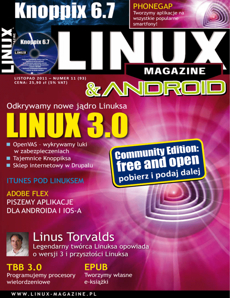 Knoppix 6.7 Phonegap Tworzymy aplikacje na wszystkie popularne smartfony! L I S TO PA D 2 0 1 1 – N U M E R 1 1 ( 9 3 ) C E N A : 2 5 , 9 0 z ł ( 5 % VAT ) & Android Odkrywamy nowe jądro Linuksa LINUX 3.0 OpenVAS – wykrywamy luki w zabezpieczeniach n Tajemnice Knoppiksa n Sklep internetowy w Drupalu n iTunes pod Linuksem on: i t i d E y t i n u Comm n e p o d n a free dalej Adobe Flex Piszemy aplikacje dla Androida i iOS-a Linus Torvalds Legendarny twórca Linuksa opowiada o wersji 3 i przyszłości Linuksa TBB 3.0 Programujemy procesory wielordzeniowe ePub Tworzymy własne e-książki w w w . l i n u x - M A G A Z IN E . P L aj d pobierz i po Witamy Doghouse: Uwierzytelnianie Na Godota Jon „maddog” Hall K ilka lat temu wybrałem się w dłuższą podróż do Izraela i Indii. Kiedy dotarłem do Izraela, udałem się na konferencję branżową, gdzie opowiadałem o GNU / Linuksie i wolnym oprogramowa- niu. Izrael to dynamiczny kraj, jest tam wielu przedsiębiorczych ludzi – zdziwiłem się więc, że w konferencji uczestniczyły tylko dwie firmy zajmujące się FOSS. Zapytałem, dlaczego brakuje firm zajmujących się GNU / Linuksem i ogólnie FOSS. – Czekamy na list autoryzacyjny – usłyszałem. – Przepraszam, na co? – zapytałem. – Chodzi o to, że jako partnerzy jakiejś firmy dostajemy od niej list autoryzacyjny z informacją, że jesteśmy autoryzowanym partnerem i że inni powinni z nami współpracować. Do tego służy właśnie „list autoryzacyjny”. Wyjaśniłem im, że po pierwsze nie istnieje osoba ani organizacja, która mogłaby im wystawić taki list, ale że w przypadku GNU / Linuksa w ogóle nie potrzebują niczego takiego. Wiem jednak, dlaczego na niego czekali. Przez wiele lat pracowałem w różnych firmach i podpisywałem wiele umów o współpracy. Owe „listy uwierzytelniające” były rezultatem tygodni rozmów, wymian pism między prawnikami, menedżerami produktu i członkami zespołów. Po podpisaniu umowy o współpracy zwykle jedna strona otrzymywała dostęp do kodu niezbędny do stworzenia produktu czy usługi, zaś maszyneria marketingowa zaczynała rozgłaszać wszem i wobec o „najlepszym partnerstwie na świecie”. Można by pomyśleć, że procedura ta przeszła teraz na wolne oprogramowanie – przynajmniej tak wydawało się moim rozmówcom. W rzeczywistości jednak trudno o bardziej błędne przypuszczenie. Z prawnego punktu widzenia wolne oprogramowanie i open source wymagają jedynie przestrzegania warunków licencji. Jeżeli rozumiemy treść licencji, w ogóle nie jest konieczna żadna interakcja z prawnikami. Ponieważ licencja nie zabrania wykorzystania komercyjnego, menedżerowie produktu z nikim nie muszą negocjować ceny bazowej. Wszystko wygląda inaczej niż w przypadku zamkniętego oprogramowania. Pamiętam, że kiedy pracowałem w Digital Equipment Corporation, mieliśmy wydać drugą komercyjną edycję Uniksa zwaną Ultrix–32; był to Unix dla procesorów VAX. Nasze „negocjacje” z AT&T co do licencji trwały tak długo, że w końcu stworzyliśmy nawet słynne tablice rejestracyjne z napisem „Unix – Live Free or Die”, by uspokoić klientów, którzy chcieli licencji na Uniksa od DEC. www.linux-magazine.pl Pierwsze, co zrobiliśmy przed rozpoczęciem projektu, to przystąpienie negocjacji w kwestii licencji z AT&T; był też ostatni krok, który wykonaliśmy przed udostępnieniem produktu. Choć proces ten stworzył wiele miejsc pracy dla menedżerów produktu i prawników po obu stronach, był drogi i – w przypadku FOSS – zupełnie zbędny. Oczywiście „negocjacje” z AT&T nie skończyły się po wydaniu pierwszej wersji. Zwykle co roku musieliśmy renegocjować licencję w związku z kwestiami takimi, jak wzrost mocy obliczeniowej procesora, różnice między licencjami na serwery i stacje robocze, systemy wieloprocesorowe, a także – moje ulubione – stacje robocze z wieloma użytkownikami, których używał nie tylko użytkownik zalogowany na konsoli, ale również wielu innych, zalogowanych na przykład przez Internet. Oczywiście kwestie licencyjne nie kończą się na sprzedawcach, którzy negocjują prawa do dystrybucji: oprócz opłat licencyjnych użytkownik również ponosi swój koszt za produkt. Liczenie licencji i zapewnienie odpowiedniej zgodności licencyjnej zabiera administratorom sporo czasu, to samo dotyczy zarządzania licencjami przez menedżerów. Powstało wiele różnych systemów, które wspomagają te procesy. FOSS ma własne wyzwania związane z licencjami. Trzeba je uważnie przeczytać i odpowiednio stosować, zwłaszcza jeśli łączy się produkty udostępniane na warunkach różnych licencji. Jednak w mojej opinii kwestie te nawet w ułamku nie są tak skomplikowane i czasochłonne, jak negocjacje odnośnie do zamkniętego oprogramowania. Po wyjeździe z Izraela odwiedziłem Delhi, gdzie wziąłem udział w kolejnej konferencji i spotkałem się z przedstawicielami firm zajmujących się GNU / Linuksem. I ponownie zdziwiłem się, dlaczego w tak dużym kraju jest ich tak niewiele. Zadałem im więc to samo pytanie, co ich kolegom w Izraelu. – Czekamy na list autoryzacyjny – usłyszałem w odpowiedzi. Carpe diem! n n n NUMER 93 LISTOPAD 2011 3 Linux & Android Magazine Spis treści & Android Linux Magazine jest miesięcznikiem specjalistycznym wydawanym we współpracy z Linux New Media AG, Monachium, Niemcy. Wydawca Linux New Media Polska sp. z o.o. Redaktor Naczelny Artur Skura, [email protected] Programowanie i aplikacje: Oliver Frommel, [email protected] Nowości i raporty: Ulrich Bantle, [email protected] Korespondenci i współpracownicy Zack Brown, Patricia Jung, James Pyles, Uli Bantle, Andreas Bohle, Jens-Christoph Brendel, Hans-Georg Eßer, Markus Feilner, Oliver Frommel, Marcel Hilzinger, Mathias Huber, Anika Kehrer, Kristian Kißling, Jan Kleinert, Peter Kreußel, Thomas Leichten stern, Jörg Luther, Nils Magnus Sekretarz redakcji Joanna R