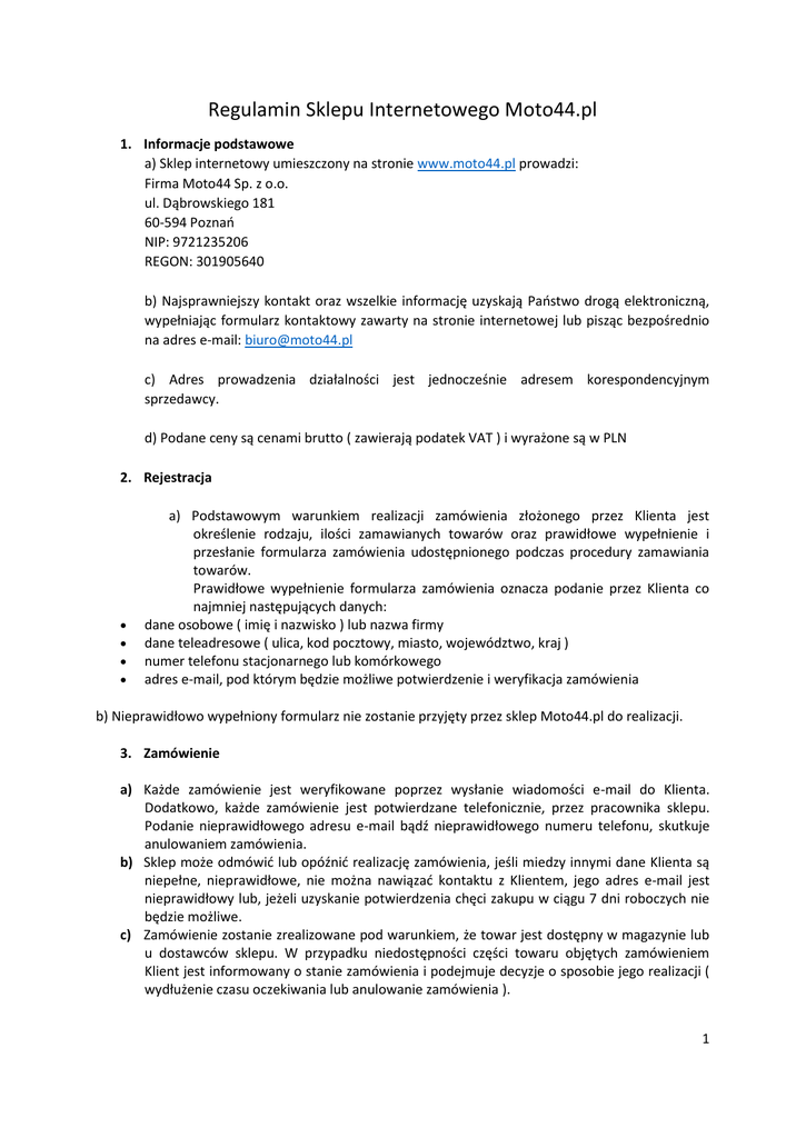 Regulamin Sklepu Internetowego Moto44.pl 1. Informacje podstawowe a) Sklep internetowy umieszczony na stronie www.moto44.pl prowadzi: Firma Moto44 Sp. z o.o. ul. Dąbrowskiego 181 60-594 Poznań NIP: 9721235206 REGON: 301905640 b) Najsprawniejszy kontakt oraz wszelkie informację uzyskają Państwo drogą elektroniczną, wypełniając formularz kontaktowy zawarty na stronie internetowej lub pisząc bezpośrednio na adres e-mail: [email protected] c) Adres prowadzenia działalności jest jednocześnie adresem korespondencyjnym sprzedawcy. d) Podane ceny są cenami brutto ( zawierają podatek VAT ) i wyrażone są w PLN 2. Rejestracja a) Podstawowym warunkiem realizacji zamówienia złożonego przez Klienta jest określenie rodzaju, ilości zamawianych towarów oraz prawidłowe wypełnienie i przesłanie formularza zamówienia udostępnionego podczas procedury zamawiania towarów. Prawidłowe wypełnienie formularza zamówienia oznacza podanie przez Klienta co najmniej następujących danych: dane osobowe ( imię i nazwisko ) lub nazwa firmy dane teleadresowe ( ulica, kod pocztowy, miasto, województwo, kraj ) numer telefonu stacjonarnego lub komórkowego adres e-mail, pod którym będzie możliwe potwierdzenie i weryfikacja zamówienia b) Nieprawidłowo wypełniony formularz nie zostanie przyjęty przez sklep Moto44.pl do realizacji. 3. Zamówienie a) Każde zamówienie jest weryfikowane poprzez wysłanie wiadomości e-mail do Klienta. Dodatkowo, każde zamówienie jest potwierdzane telefonicznie, przez pracownika sklepu. Podanie nieprawidłowego adresu e-mail bądź nieprawidłowego numeru telefonu, skutkuje anulowaniem zamówienia. b) Sklep może odmówić lub opóźnić realizację zamówienia, jeśli miedzy innymi dane Klienta są niepełne, nieprawidłowe, nie można nawiązać kontaktu z Klientem, jego adres e-mail jest nieprawidłowy lub, jeżeli uzyskanie potwierdzenia chęci zakupu w ciągu 7 dni roboczych nie będzie możliwe. c) Zamówienie zostanie zrealizowane pod warunkiem, że towar jest dostępny w magazynie lub u dostawców sklepu. W przypadku niedostępności części towaru objętych zamówieniem Klient jest informowany o stanie zamówienia i podejmuje decyzje o sposobie jego realizacji ( wydłużenie czasu oczekiwania lub anulowanie zamówienia ). 1 d) Termin realizacji zamówienia zazwyczaj nie przekracza 7 dni roboczych. Wyjątek stanowić mogą zamówienia na artykuły aktualnie niedostępne lub sprowadzane na indywidualne zamówienie klienta. W tym przypadku termin realizacji może się wydłużyć. O takim fakcie Nabywca zostanie bezzwłocznie poinformowany. e) O terminie realizacji zamówienia Klient informowany jest podczas weryfikacji zamówienia ( telefonicznej bądź poprzez pocztę elektroniczną ), która odbywa się w ciągu 24h ( w dni robocze ) od momentu złożenia zamówienia. 4. Płatności a) Po złożeniu i potwierdzeniu zamówienia, przy wyborze płatności przelewem, opłatę za zamówienie należy uiścić w terminie nie dłuższym niż 7 dni roboczych na poniższe konto bankowe: mBANK SA 56 1140 2004 0000 3102 7517 3950 b) W przypadku wybrania przelewu bankowego jako sposobu płatności towar wysyłamy z chwilą zaksięgowania płatności na koncie bankowym. c) W przypadku wyboru płatności za pobraniem, płatność należy uiścić w chwili doręczenia towaru przez firmę kurierską. d) Wraz z towarem wystawiamy fakturę VAT bądź paragon fiskalny. e) W uzasadnionych przypadkach zastrzegamy/rościmy sobie prawo zażądania zaliczki, przedpłaty lub odmowy realizacji zamówienia. 5. Realizacja zamówienia a) Czas otrzymania przesyłki jest zależny od dostępności zamawianego towaru. Towar z oznaczeniem „produkt dostępny w 48h”, w większości przypadków powinien zostać doręczony do kupującego w ciągu 3 dni roboczych. b) W przypadku wyboru płatności przelewem bankowym bądź w przypadku zakupu towaru pod zamówienie, przy którym wymagana jest przedpłata na konto – czas realizacji liczony jest od chwili zaksięgowania przelewu na koncie firmowym c) W przypadku zamówienia kilku produktów o zróżnicowanym terminie realizacji, czas realizacji jest taki, jak najdłuższy z zamawianych towarów. d) Towary pod zamówienie ( bez oznaczenia na stronie „produkt dostępny w 48h ) posiadają termin realizacji od 3 do 48 dni. Bliżej określony termin realizacji podaje pracownik sklepu, kontaktując się telefonicznie bądź drogą elektroniczną po złożeniu zamówienia. e) W przypadku niemożliwości zrealizowania zamówienia z winy Klienta, a w szczególności w przypadku nieuzasadnionej odmowy odebrania towaru lub podania przez Klienta błędnych danych dotyczących adresu, na który przesyłka ma zostać doręczona, operator sklepu internetowego zastrzega sobie prawo do obciążenia Klienta wynikającymi z tego tytułu kosztami. 6. Koszty przesyłki a) Towar wysyłamy za pośrednictwem firmy kurierskiej GLS. W wyjątkowych przypadkach towar może zostać wysłany za pośrednictwem innej firmy kurierskiej. b) Przy zamówieniach o wartości poniżej 500,00 zł pobierana jest opłata za wysyłkę w wysokości 15,00 zł. 2 c) Przy zamówieniach o wartości powyżej 500,00 zł koszty przesyłki ponosi sprzedawca. UWAGA! Każdą przesyłkę przed odbiorem należy sprawdzić w obecności kuriera. W szczególności należy sprawdzić stan opakowania zewnętrznego ( brak wgnieceń, rozdarć itp.) W przypadku, gdy opakowanie przesyłki nosi ślady uszkodzenia należy nie przyjmować przesyłki oraz w obecności kuriera sporządzić protokół szkody. Sprawdzenie przesyłki przy odbiorze jest warunkiem koniecznym do uwzględnienia reklamacji w firmie kurierskiej. 7. Zwroty i wymiany a) Istnieje możliwość zwrotu lub wymiany zakupionego towaru na koszt Kupującego w terminie do 14 dni od momentu doręczenia przesyłki. b) Jedynie towar nie noszący śladów użytkowania, posiadający wszystkie metki i nieuszkodzone oryginalne opakowanie p